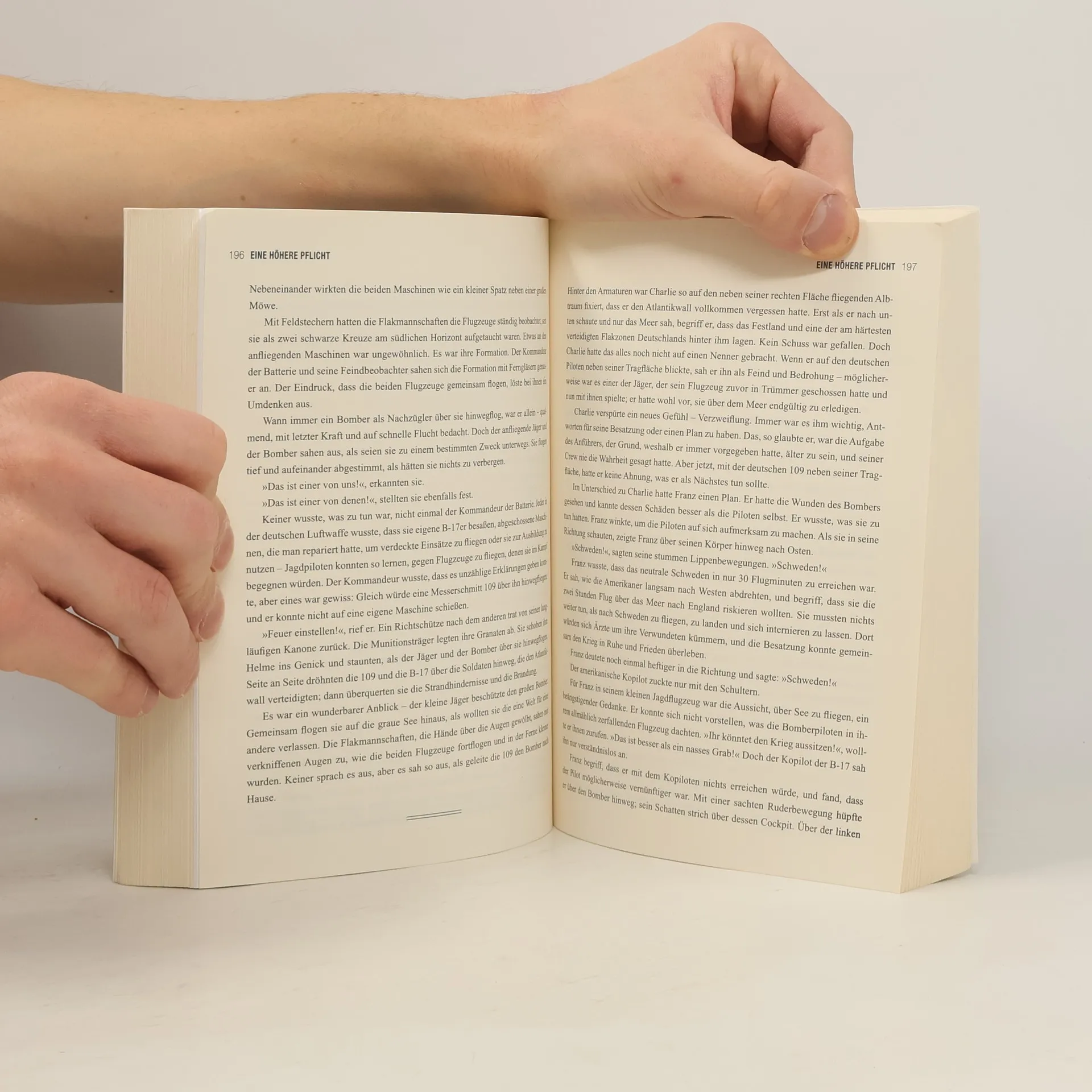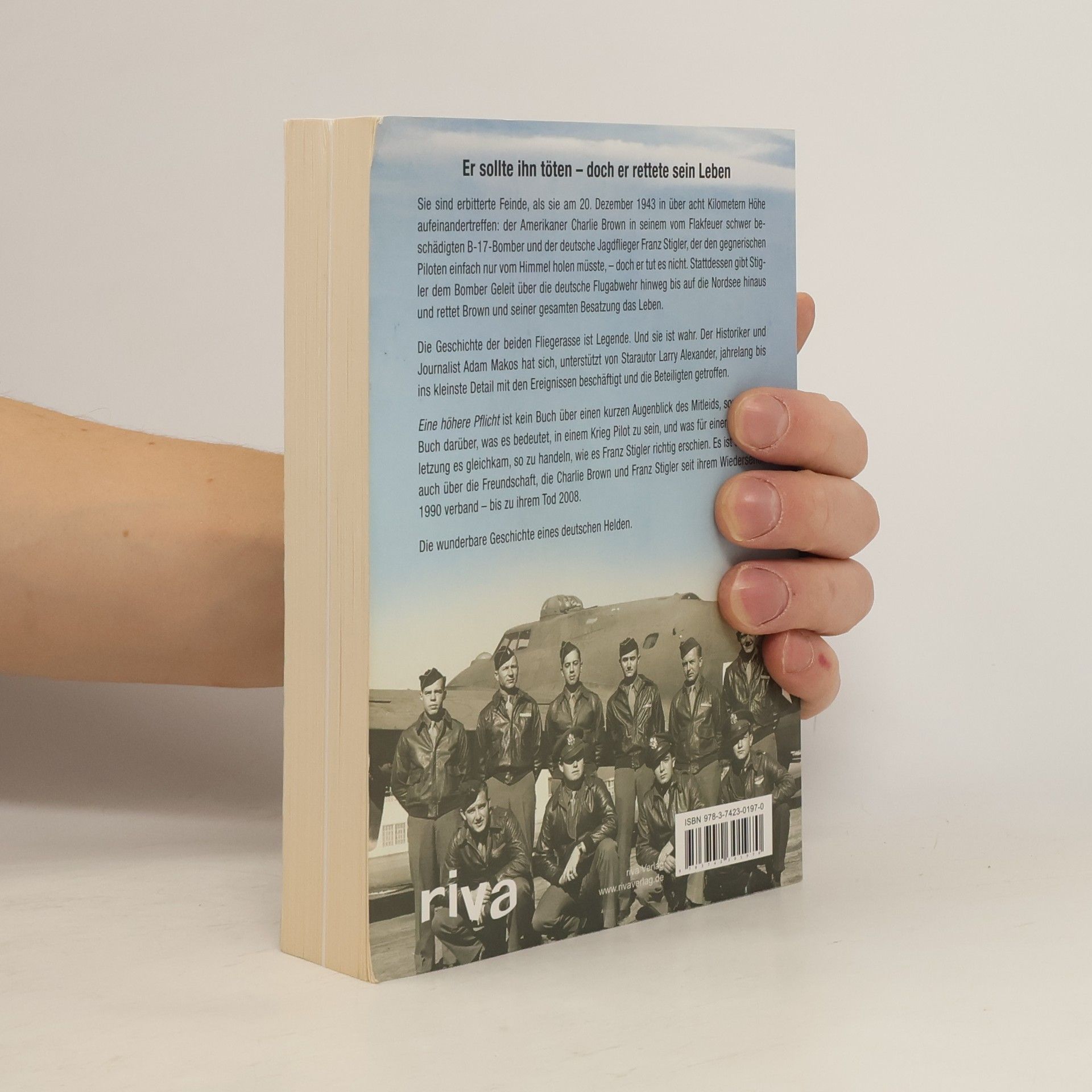 Sie sind erbitterte Feinde, als sie am 20. Dezember 1943 in über acht Kilometern Höhe aufeinandertreffen: der Amerikaner Charlie Brown in seinem vom Flakfeuer schwer beschädigten B-17-Bomber und der deutsche Jagdflieger Franz Stigler, der den gegnerischen Piloten einfach nur vom Himmel holen müsste, – doch er tut es nicht. Stattdessen gibt Stigler dem Bomber Geleit über die deutsche Flugabwehr hinweg bis auf die Nordsee hinaus und rettet Brown und seiner gesamten Besatzung das Leben. Die Geschichte der beiden Fliegerasse ist Legende. Und sie ist wahr. Der Historiker und Journalist Adam Makos hat sich, unterstützt von Starautor Larry Alexander, jahrelang bis ins kleinste Detail mit den Ereignissen beschäftigt und die Beteiligten getroffen. Eine höhere Pflicht ist kein Buch über einen kurzen Augenblick des Mitleids, sondern ein Buch darüber, was es bedeutet, in einem Krieg Pilot zu sein, und was für einer Pflichtverletzung es gleichkam, so zu handeln, wie es Franz Stigler richtig erschien. Es ist ein Buch auch über die Freundschaft, die Charlie Brown und Franz Stigler seit ihrem Wiedersehen 1990 verband – bis zu ihrem Tod 2008. Die wunderbare Geschichte eines deutschen Helden.