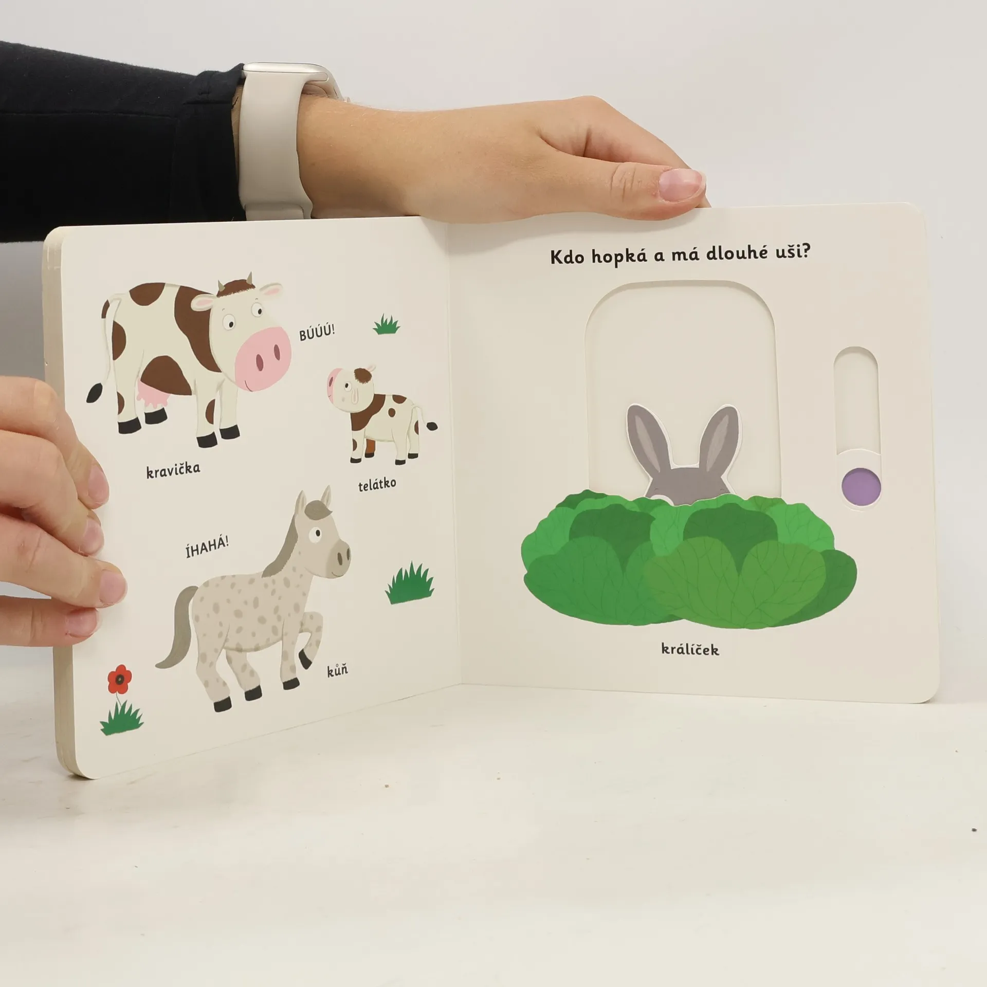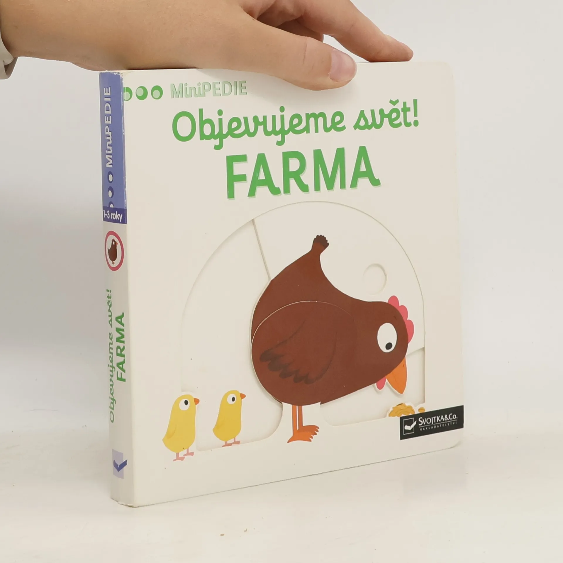 Objevovat svět na farmě s tímto leporelem je tak zábavné! Kdo každé ráno všechny budí? Kdo má legračně zakroucený ocásek? Kdo hopká a má dlouhé uši? Co táhne valník se senem? Stačí jen vložit prstík do správného otvoru a lehce vysunout, zatáhnout nebo otočit ve směru šipky a hned bude váš malý objevitel znát odpovědi. Leporelo je určeno pro nejmenší děti od jednoho roku a má pevné stránky s posuvnými a otočnými prvky, a tak si naši nejmenší mohou při prohlížení a rozeznávání zvířátek a věcí z farmy procvičit i jemnou motoriku.