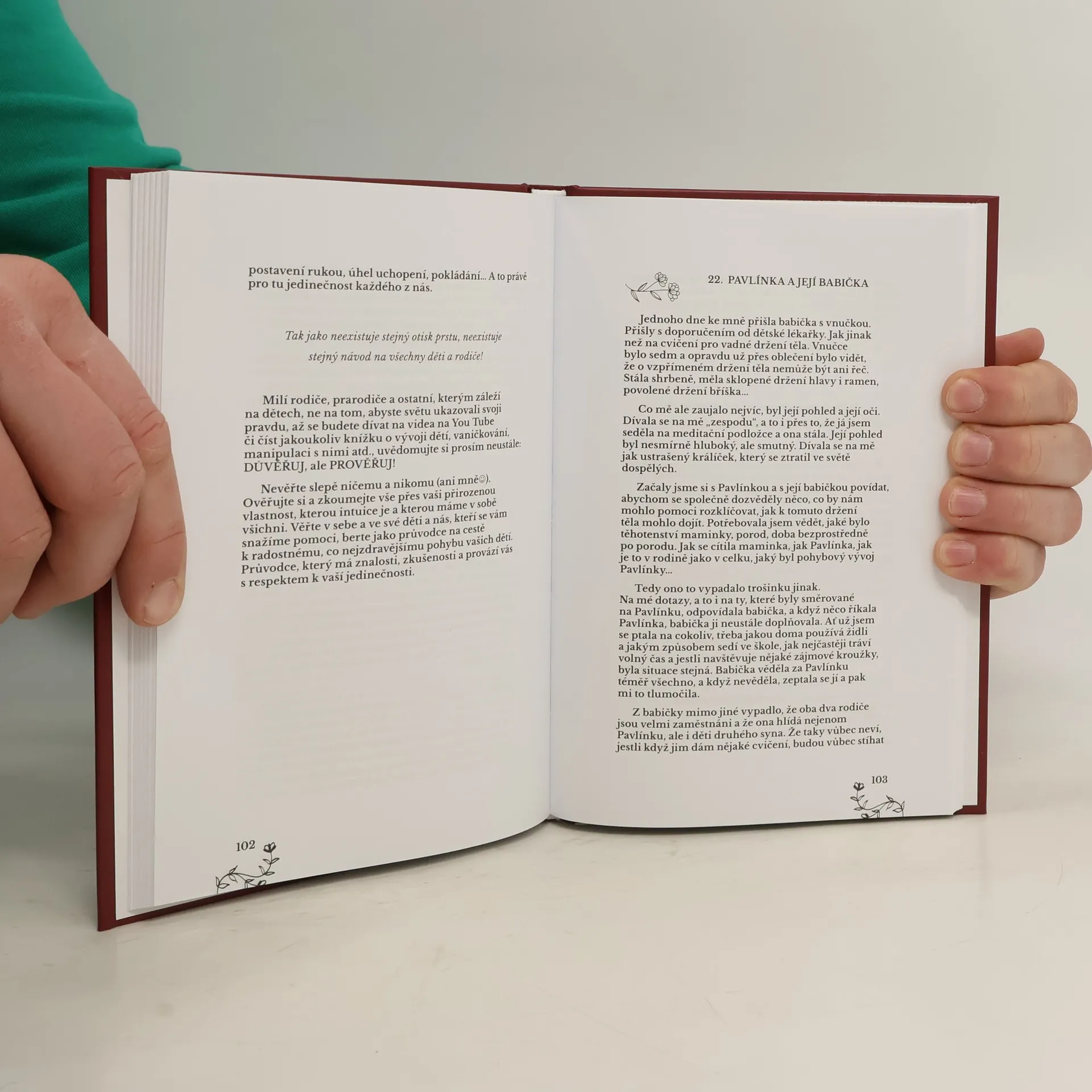 V této knížce najdete jednoduchý návod k pochopení a k respektování objevných cest vašich dětí k jejich zdravému, pro každého z nich originálnímu, pohybu. Zjistíte, že nemusíte „návody na děti“, hledat na internetu, ale jen a pouze ve svých srdcích, že vaši rodičovskou intuici stačí jen vyslyšet a že jak teď, tak potom, je zákonitost, která funguje po staletí. Autorka, dětská fyzioterapeutka, Jana Skalová, v ní velmi volně navazuje na předchozí knížku „S láskou ke zdravému pohybu našich dětí“ a své povídání doplňuje i konkrétními příklady z praxe. Jejím přáním je, aby nejenom děti, ale celá rodina, byla zdravě fungující na základě svých vlastních konkrétních prožitků, ne na základě mnohdy velmi nevhodných a ne zcela pravdivých informací z okolí.