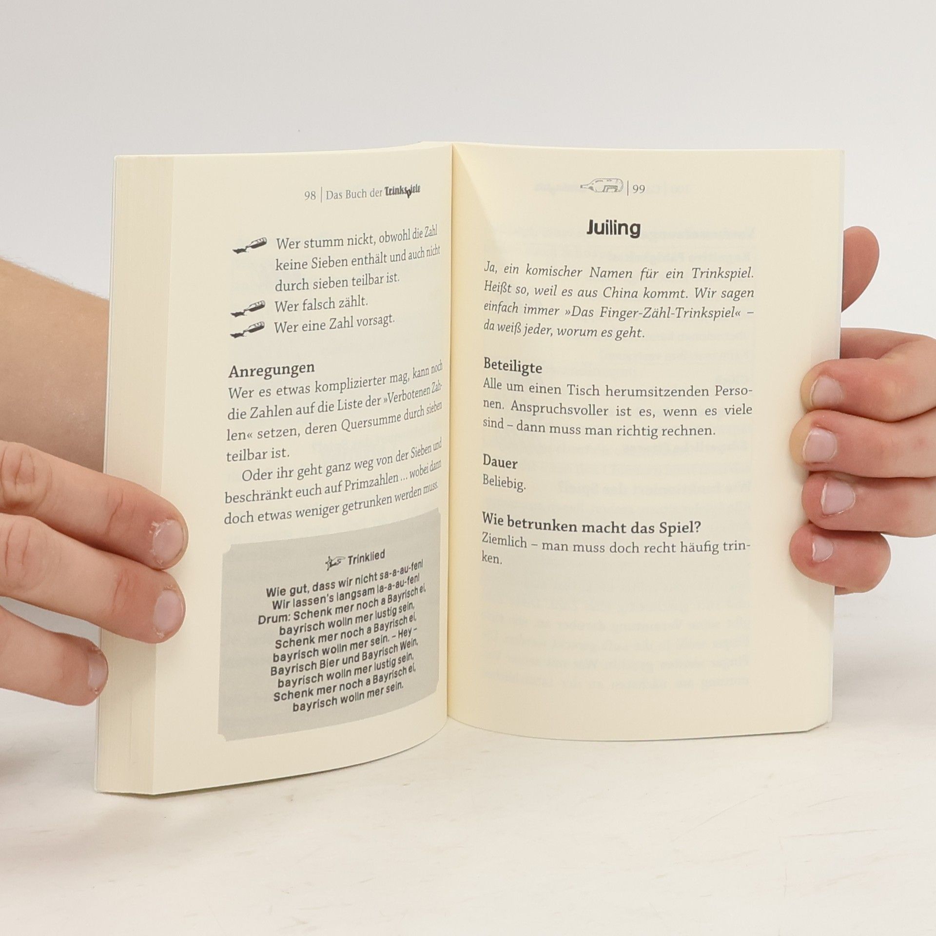»Kreis des Todes«, »Kohlfahrt«, »Frau Horst« oder »Wasserfall« – dieses Buch vereint die 69 genialsten Wege, sich mal wieder so richtig schön abzuschießen. Allein oder in der Gruppe, über den ganzen Tag hinweg oder innerhalb von nur wenigen Minuten. Mal stilvoll, mal derb, mal geistig fordernd, dann wieder schlicht bescheuert – Das Buch der Trinkspiele bietet für jeden Geschmack eine ganz besondere Spezialität und liefert so manchen witzigen Einfall fürs, zum und übers Saufen. Und für alle, die nicht nur bechern wollen, gibt es die besten Trinksprüche und Trinklieder gratis dazu. Ein Muss für jeden Anhänger der gesellschaftlich akzeptierten Trunkenheit.