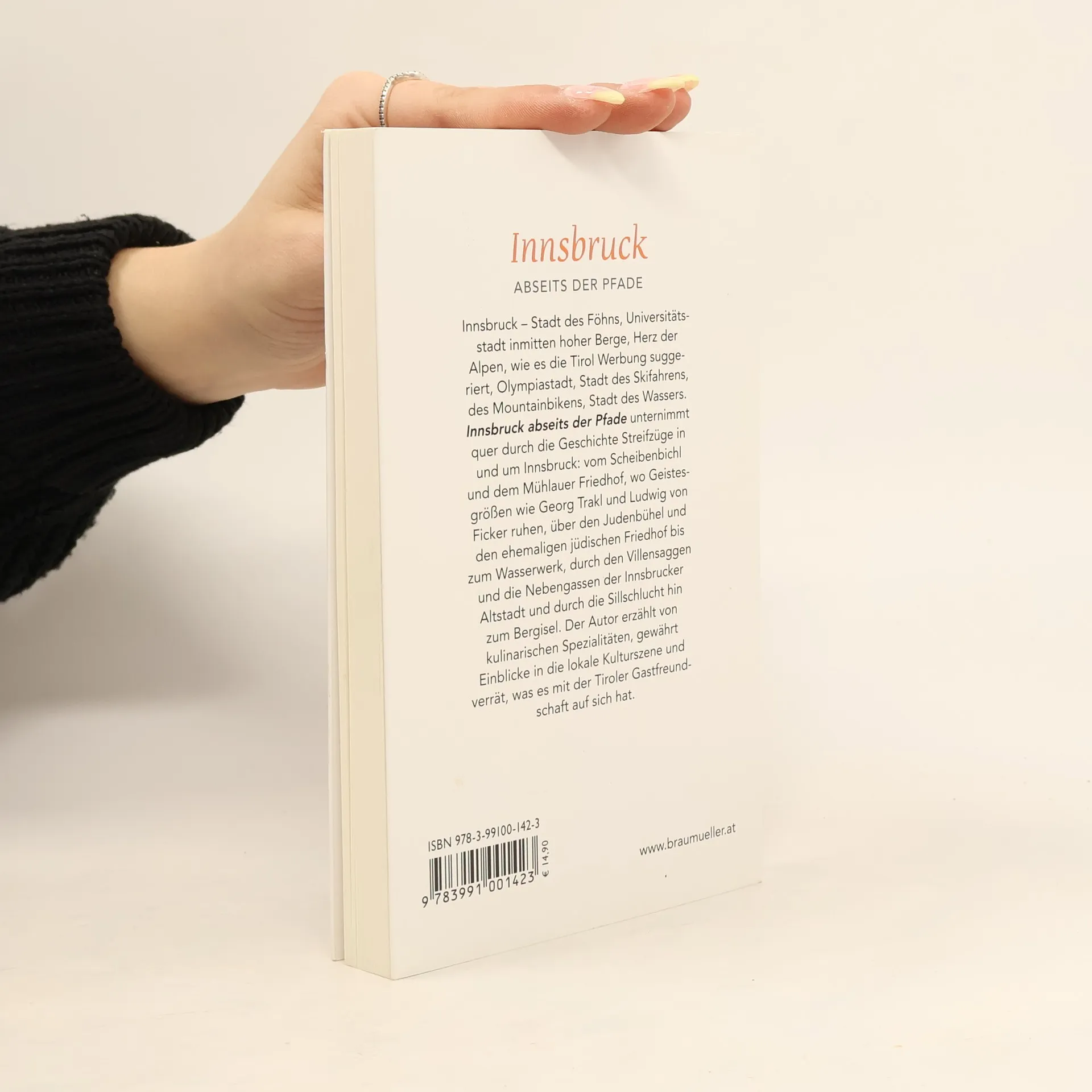 Innsbruck - Stadt des Föhns, Universitätsstadt inmitten hoher Berge, Herz der Alpen, wie es die Tirol-Werbung suggeriert, Olympiastadt, Stadt des Skifahrens, des Mountainbikens, Stadt des Wassers, Stadt der Baustellen. In „Innsbruck abseits der Pfade“ entdecken wir die Stadt in den Alpen als Verkehrsknotenpunkt seit dem Mittelalter, als Ort der kurzen Wege, als Eldorado für Radfahrer, als Schauplatz von Kunstskandalen, Kleinherzigkeit und Heldentaten; wir lernen Einwohner kennen, die so gar nichts mit dem Klischee der skifahrenden, in den Bergen wandernden, gesunden, kernigen Tiroler zu tun haben, als die sie bereits Heinrich Heine in seinen Reisebildern beschrieben hat. Obwohl jeder sechste Skitourist weltweit in Tirol Urlaub macht, gibt es in Innsbruck und Umgebung einen ruralen Unterbau, der weder den Fremdenverkehr noch die Mitterer'sche Piefke-Saga repräsentiert. „Innsbruck abseits der Pfade“ unternimmt quer durch die Geschichte Streifzüge in und um Innsbruck: vom Scheibenbichl und dem Mühlauer Friedhof, wo Geistesgrößen wie Georg Trakl und Ludwig von Ficker ruhen, über den Judenbühel und den ehemaligen Jüdischen Friedhof bis zum Wasserkraftwerk, durch den Villen-Saggen und die Nebengassen der Innsbrucker Altstadt und natürlich durch die Sillschlucht hin zum Bergisel, Schauplatz mehrerer Schlachten 1809.
