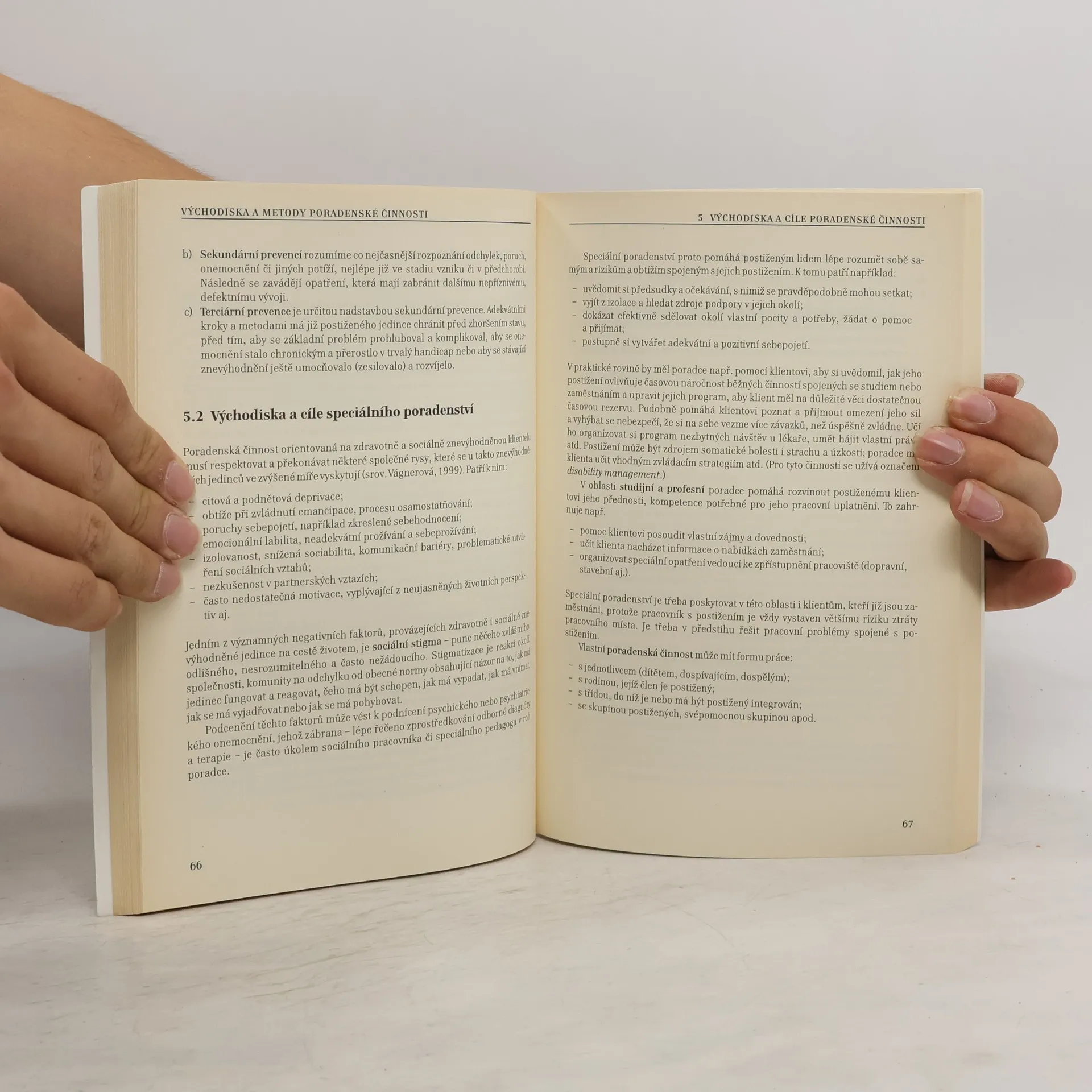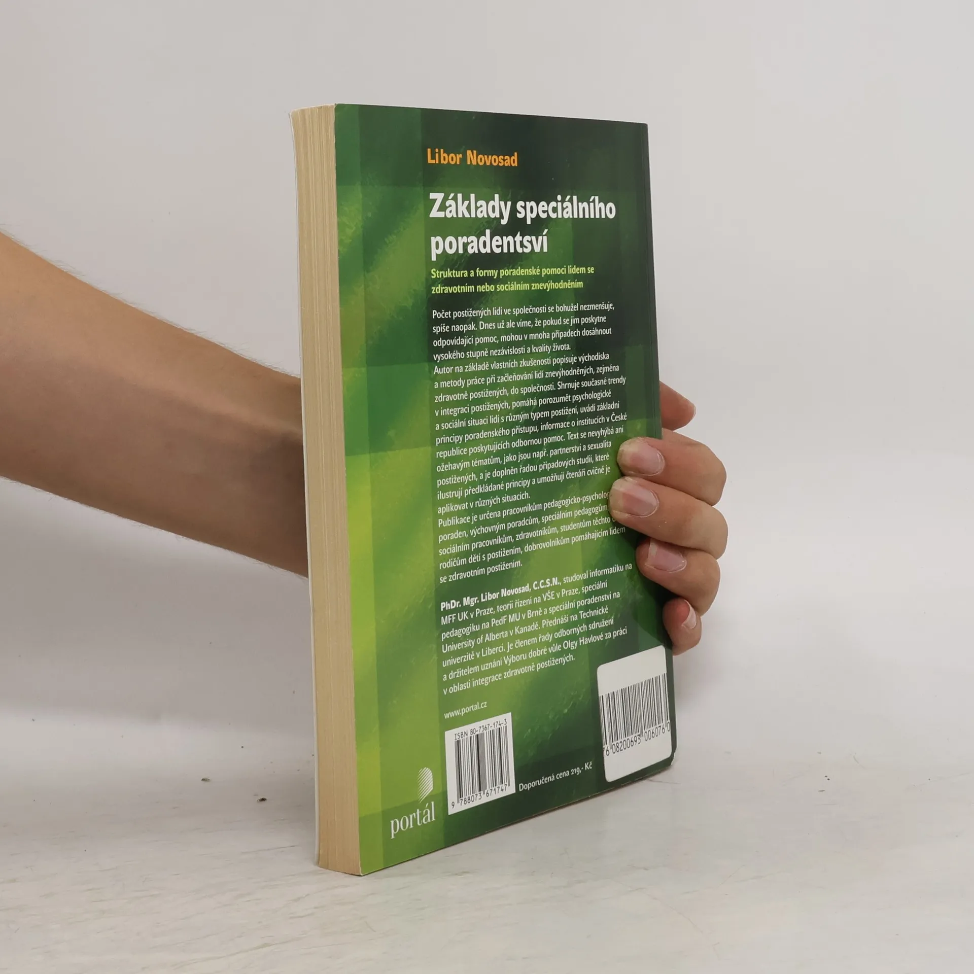 Struktura a formy poradenské pomoci lidem se zdravotním nebo sociálním znevýhodněním. Autor na základě vlastních zkušeností popisuje východiska a metody práce při začleňování lidí znevýhodněných, zejména zdravotně postižených, do společnosti. Shrnuje současné trendy v integraci postižených, pomáhá porozumět psychologické a sociální situaci lidí s různým typem postižení, uvádí základní principy poradenského přístupu, informace o institucích v České republice poskytujících odbornou pomoc. Text se nevyhýbá ani ožehavým tématům, jako je např. partnerství a sexualita postižených, a je doplněn řadou případových studií, které ilustrují předkládané principy a umožňují čtenáři cvičně je aplikovat v různých situacích. Publikace je určena pracovníkům pedagogicko-psychologických poraden, výchovným poradcům, speciálním pedagogům, sociálním pracovníkům, zdravotníkům, studentům těchto oborů, rodičům dětí s postižením, dobrovolníkům pomáhajícím lidem se zdravotním postižením.