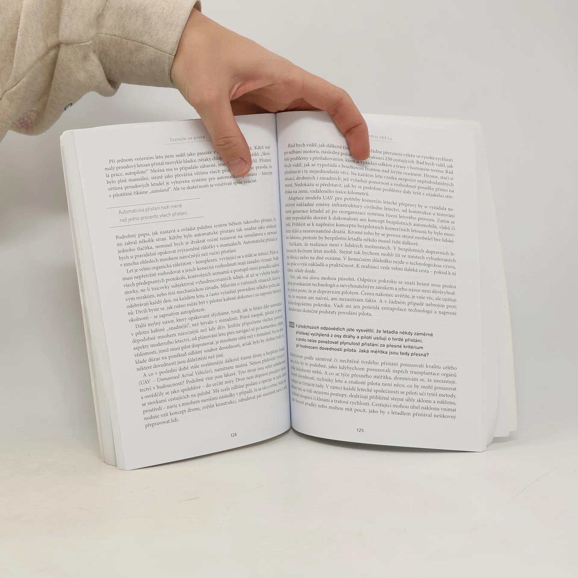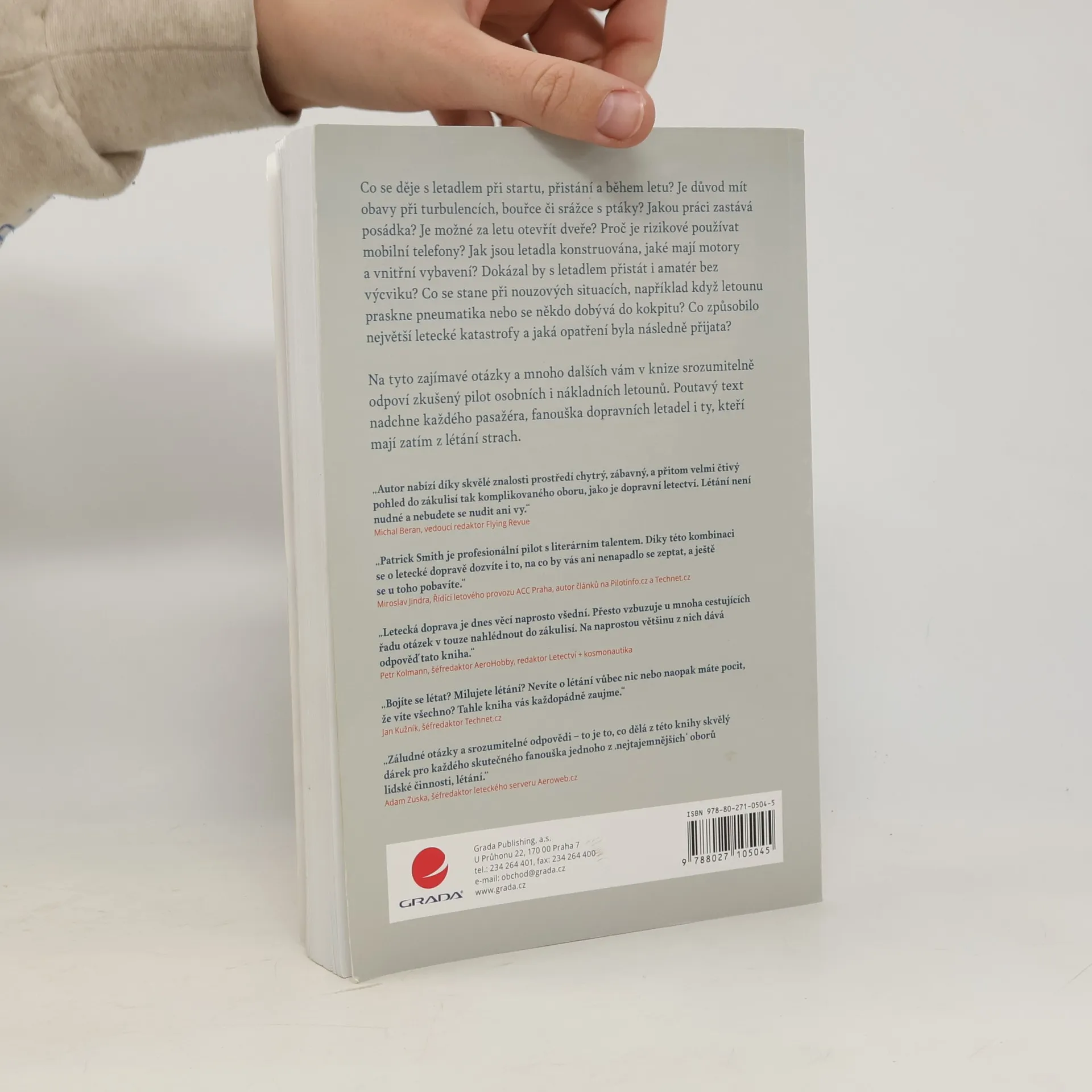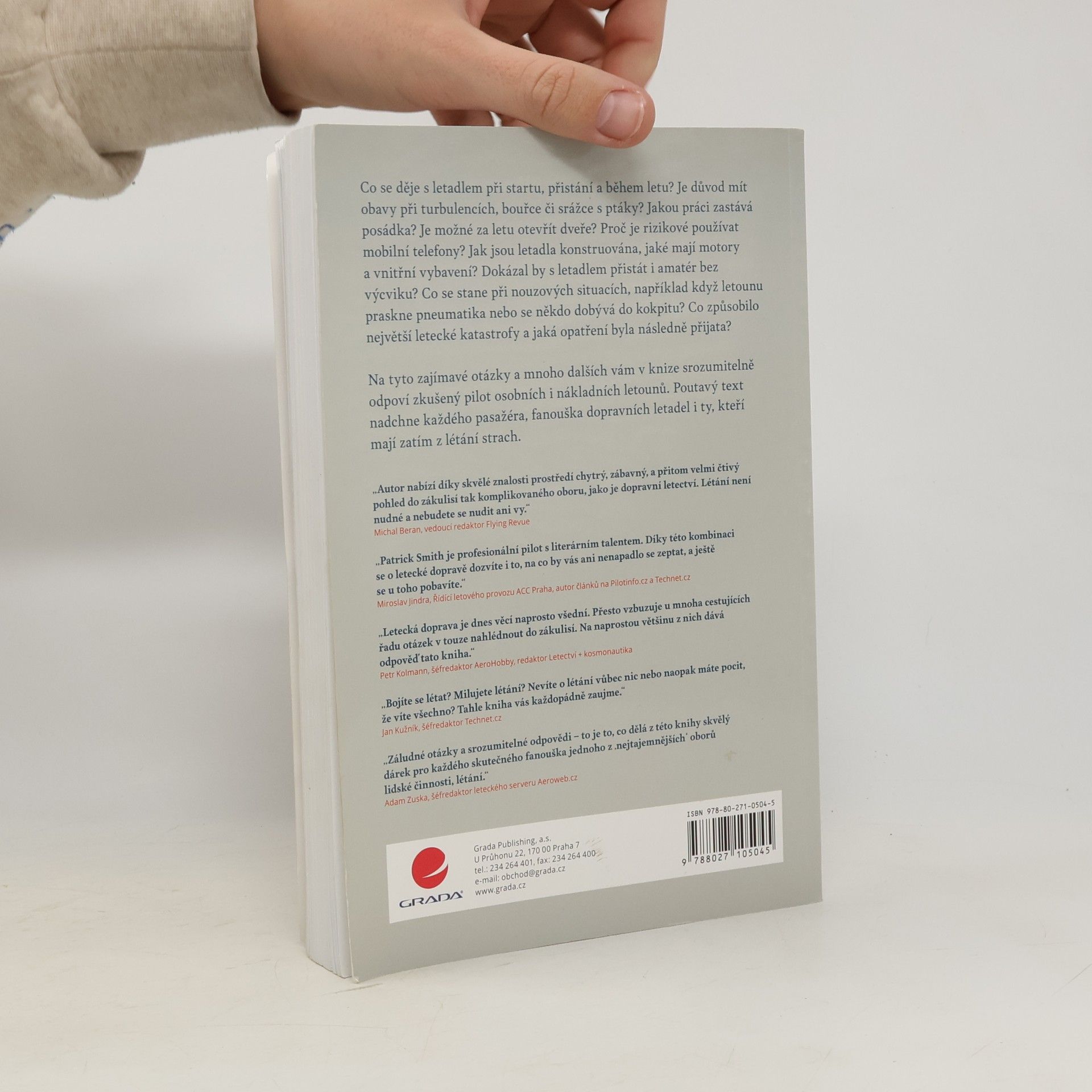 Co se děje s letadlem při startu, přistání a během letu? Je potřeba mít obavy při turbulencích, bouřce či srážce s ptáky? Jakou práci zastává posádka? Je možné za letu otevřít dveře? Proč je rizikové používání mobilních telefonů? Jak jsou letadla konstruována, jaké mají motory a vnitřní vybavení? Dokázal by s letadlem přistát i amatér bez výcviku? Co se stane při nouzových situacích, například když letounu praskne pneumatika nebo se někdo dobývá do kokpitu? Co způsobilo největší letecké katastrofy a jaká opatření byla následně přijata? Jaký je život pilotů a letušek? Na tyto zajímavé otázky a mnoho dalších vám v knize srozumitelně odpoví zkušený pilot osobních i nákladních letounů. Poutavý text nadchne každého pasažéra, fanouška dopravních letadel i ty, kteří mají zatím z létání strach.