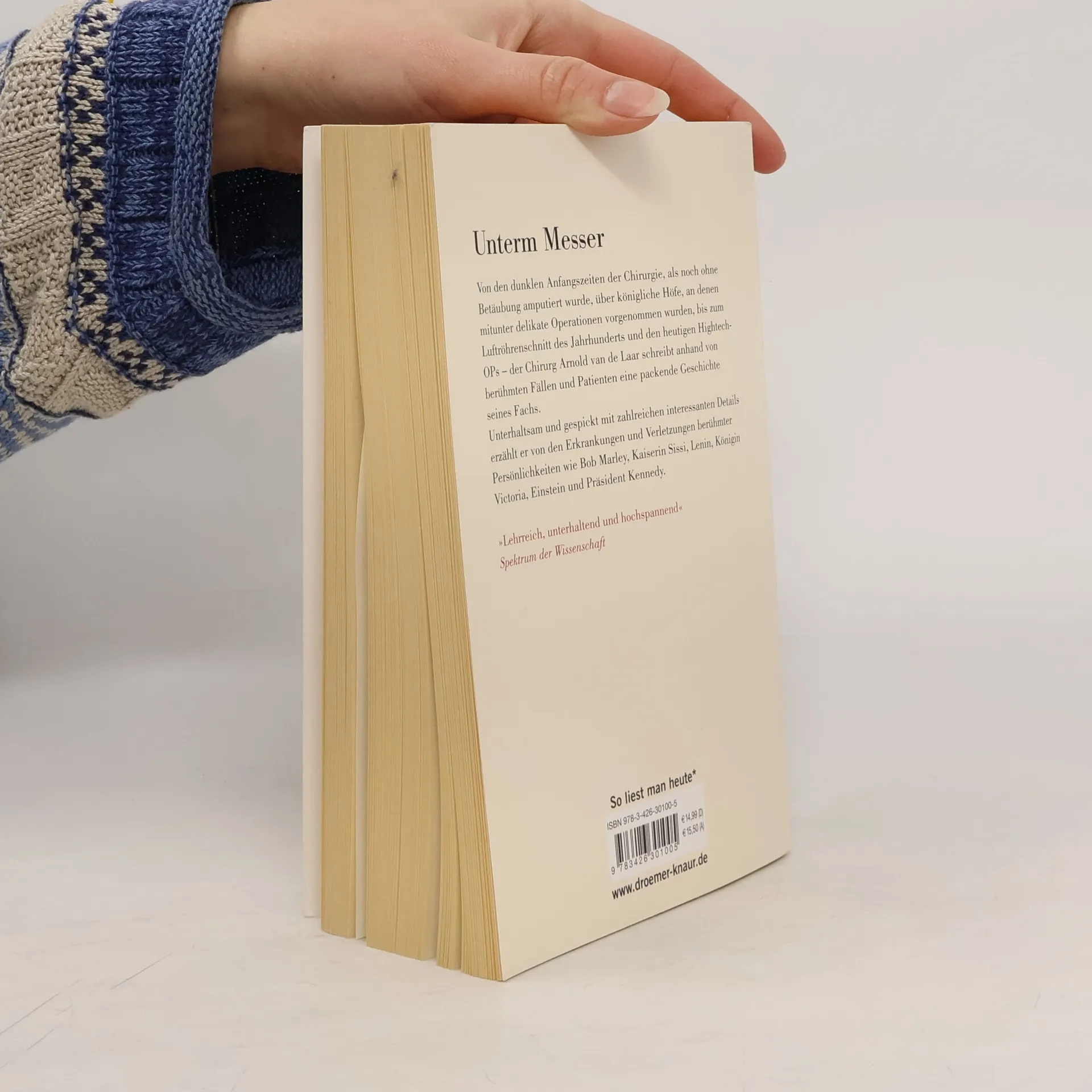 Von den dunklen Anfangszeiten der Chirurgie, als noch ohne Betäubung amputiert wurde, über königliche Operationen bis zu den heutigen High-Tech-OPs – der Chirurg Arnold van de Laar beschreibt in seinem Buch so packend wie allgemeinverständlich die Geschichte der Chirurgie. Ohne Fachbegriffe zu scheuen, aber doch leicht lesbar und gespickt mit zahlreichen interessanten Details gibt van de Laar einen spannenden Einblick in sein Fach. In 28 Kapiteln erzählt er anhand berühmter Operationen, was genau im Operationsaal geschieht. Eingehend widmet er sich Erkrankungen und Verletzungen bekannter Persönlichkeiten wie Bob Marley, Kaiserin Sissi, Lenin, Königin Victoria, Einstein und Präsident Kennedy. „Schnitt“ ist eine faszinierender Reise durch die Königsdisziplin der Medizin, fesselnd erzählt von einer Koryphäe auf dem Gebiet der Chirurgie.