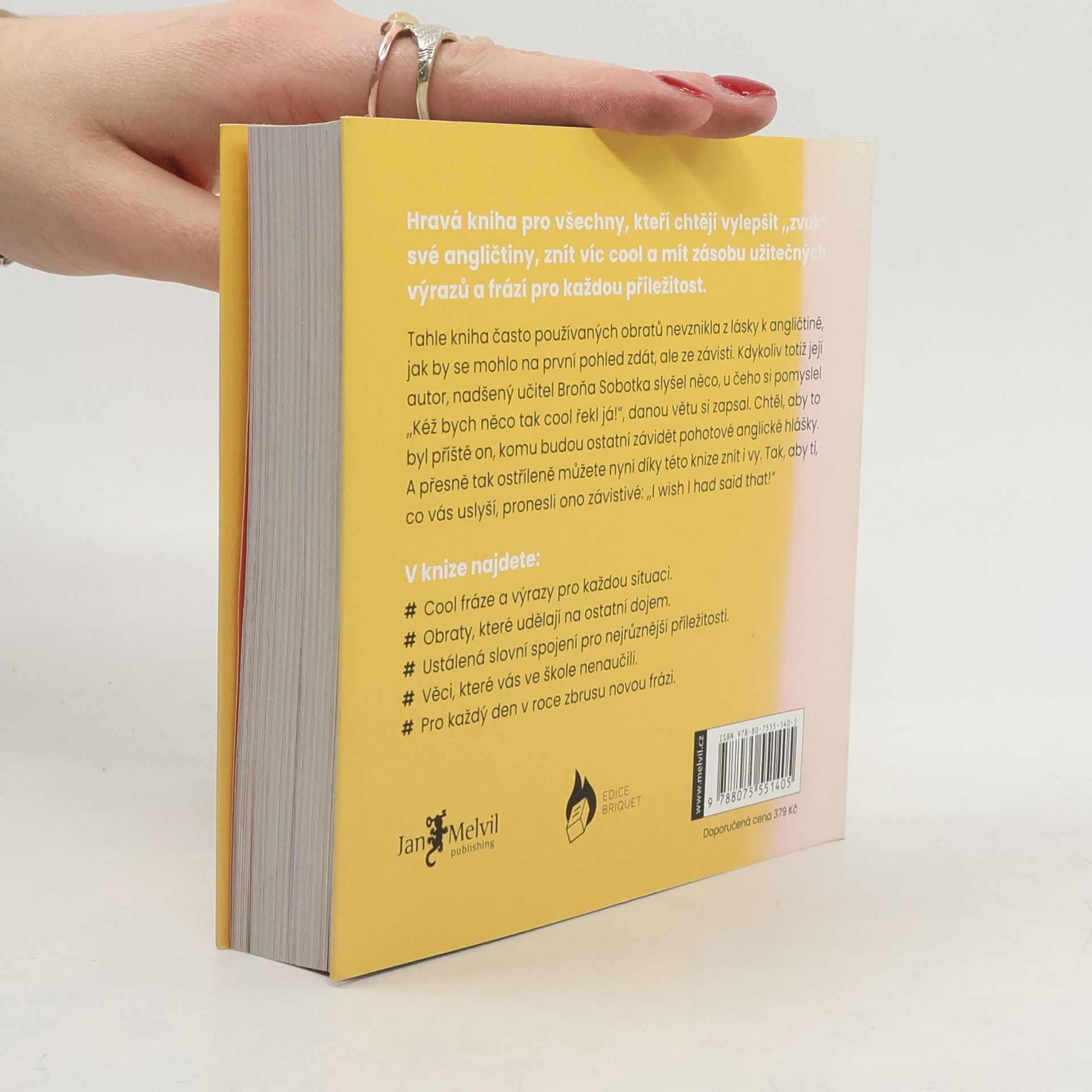 I wish I had said that! — Kéž bych to byl řekl! … takhle znělo jediné kritérium pro výběr 365 cool anglických frází a výrazů, které v této knize najdete. Broňa, nadšený učitel angličtiny z Brna, autor titulu Zamilujte se do angličtiny, přidává do svého knižního portfolia neodolatelný doplněk pro každého uživatele tohoto jazyka. Téměř rok vybíral se svým kamarádem, studujícím toho času v USA, často užívané fráze, idiomy či ustálená rčení, jejichž význam byste s pouhou znalostí jednotlivých slovíček nerozklíčovali. Výsledkem je jedna cool fráze pro každý den v roce, takže až za 365 dní pohlédnete na svůj pokrok, tak budete i díky připojené online cvičebnici v užívání i porozumění angličtiny o 365 frází protřelejší. Knihou vás doprovodí zábavné grafické zpracování Martiny Lagové, postavička malého Broni a ukázkové užití dané fráze.