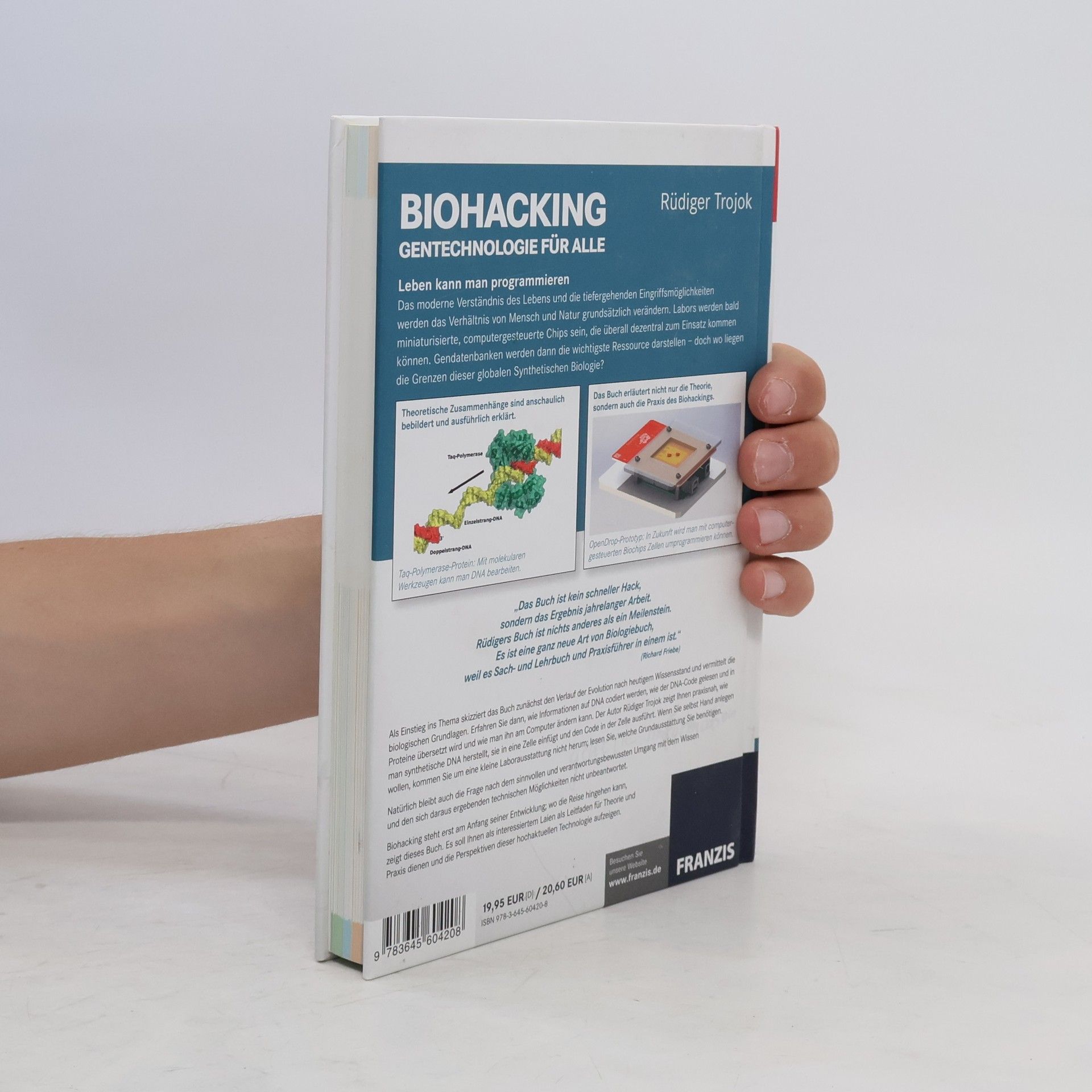 Das moderne Verständnis des Lebens und die Möglichkeiten tiefgreifender Eingriffe werden das Verhältnis von Mensch und Natur grundlegend verändern. Zukünftige Labors könnten miniaturisierte, computergesteuerte Chips sein, die dezentral eingesetzt werden. Gendatenbanken werden zur wichtigsten Ressource, doch wo liegen die Grenzen der globalen synthetischen Biologie? Das Buch bietet anschauliche Erklärungen und Bilder zu theoretischen Zusammenhängen, wie der Bearbeitung von DNA mit molekularen Werkzeugen. Es behandelt sowohl die Theorie als auch die Praxis des Biohackings. Zukünftig wird es möglich sein, Zellen mit computergesteuerten Biochips umprogrammieren. Der Autor Rüdiger Trojok skizziert zunächst die Evolution und vermittelt die biologischen Grundlagen, bevor er erklärt, wie Informationen auf DNA codiert werden, wie der DNA-Code gelesen und in Proteine übersetzt wird und wie man ihn am Computer ändert. Praktische Anleitungen zur Herstellung synthetischer DNA und deren Einfügen in Zellen werden gegeben. Eine kleine Laborausstattung ist erforderlich, und das Buch informiert über die nötige Grundausstattung. Zudem wird die Verantwortung im Umgang mit diesen Technologien thematisiert. Biohacking steht am Anfang seiner Entwicklung, und das Buch dient als Leitfaden für interessierte Laien, um die Perspektiven dieser Technologie zu erkunden.