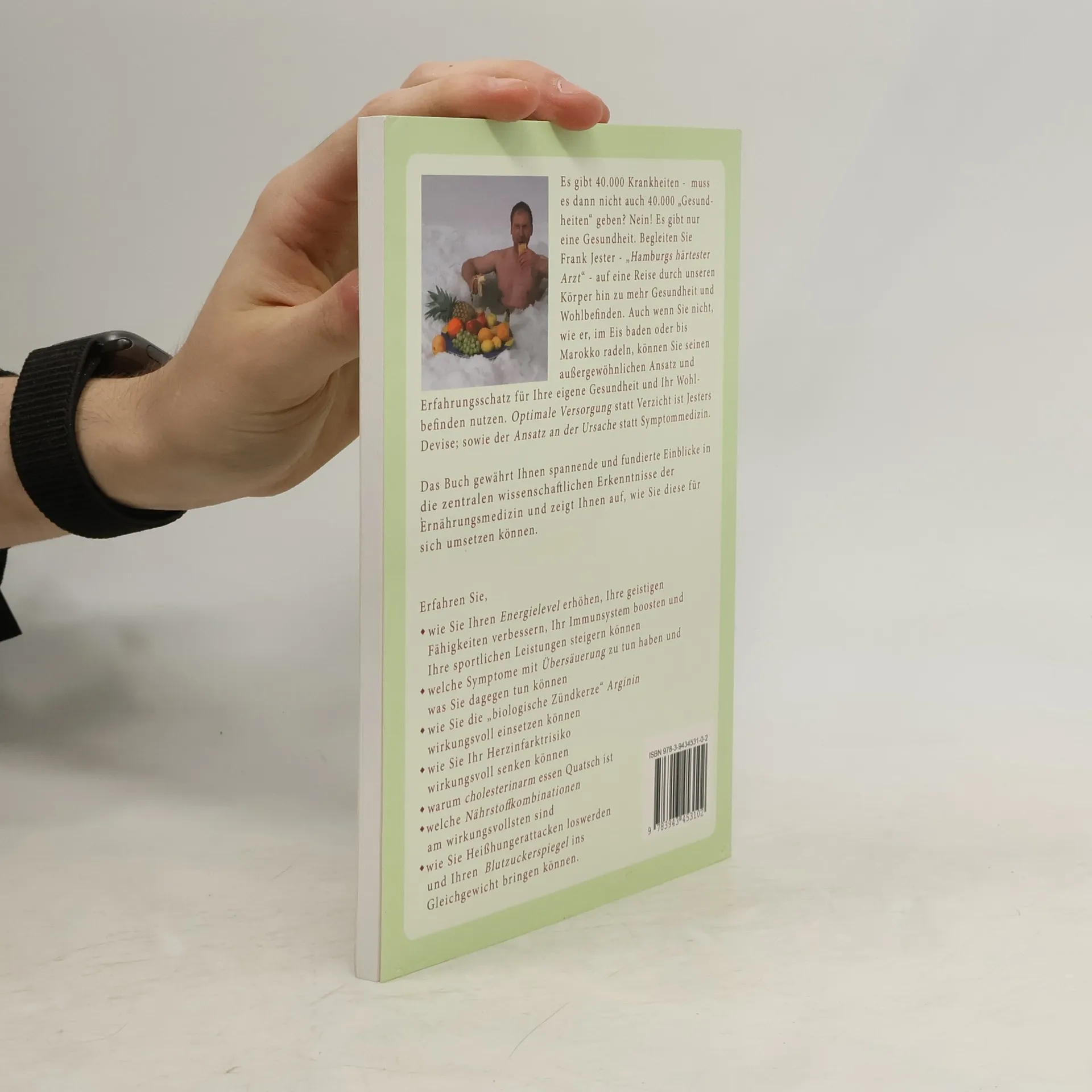 Es gibt 40.000 Krankheiten – muss es dann nicht auch 40.000 „Gesundheiten“ geben? Nein! Es gibt nur eine Gesundheit. Begleiten Sie Frank Jester - „Hamburgs härtester Arzt“ - auf eine Reise durch unseren Körper hin zu mehr Gesundheit und Wohlbefinden. Auch wenn Sie nicht, wie er, im Eis baden oder bis Marokko radeln, können Sie seinen außergewöhnlichen Ansatz und Erfahrungsschatz für Ihre eigene Gesundheit und Ihr Wohlbefinden nutzen. Optimale Versorgung statt Verzicht ist Jesters Devise; sowie der Ansatz an der Ursache statt Symptommedizin. Das Buch gewährt Ihnen spannende und fundierte Einblicke in die zentralen wissenschaftlichen Erkenntnisse der Ernährungsmedizin und zeigt Ihnen auf, wie Sie diese für sich umsetzen können. Erfahren Sie, - wie Sie Ihren Energielevel erhöhen, Ihre geistigen Fähigkeiten verbessern, Ihr Immunsystem boosten und Ihre sportlichen Leistungen steigern können - welche Symptome mit Übersäuerung zu tun haben und was Sie dagegen tun können - wie Sie die „biologische Zündkerze“ Arginin wirkungsvoll einsetzen können - Wie Sie Ihr Herzinfarktrisiko wirkungsvoll senken können - Warum cholesterinarm essen Quatsch ist - Welche Nährstoffkombinationen am wirkungsvollsten sind - Wie Sie Heißhungerattacken loswerden und Ihren Blutzuckerspiegel ins Gleichgewicht bringen können