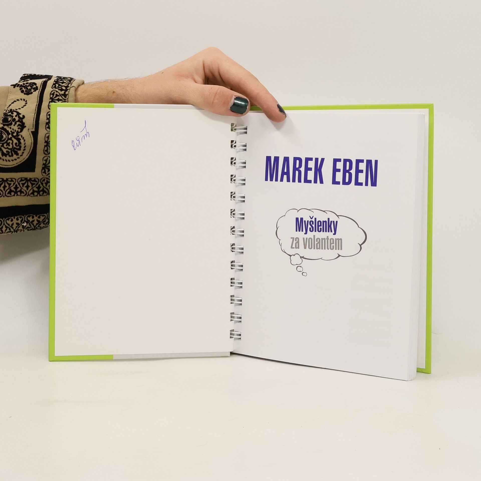 Kniha Marka Ebena Myšlenky za volantem představuje soubor sloupků a fejetonů, které vycházely časopisecky v letech 2014–2020. „Moje zkušenost s podobnými knížkami je taková, že se mi vždycky něco líbí a něco zase ne. A byl bych vlastně rád, kdyby v té knížce zbylo jen to, co se mi líbí, abych nemusel otravně listovat a přeskakovat to, co se mi nelíbí. Ale nikdy jsem neměl to srdce z knížky něco vytrhnout, připadá mi to barbarské. A proto je tato knížka ve formě kroužkového bloku, protože z bloku člověk vytrhne list jako nic a nemusí se trápit. Pokud někomu po přečtení zbudou jen desky, velice se omlouvám.“