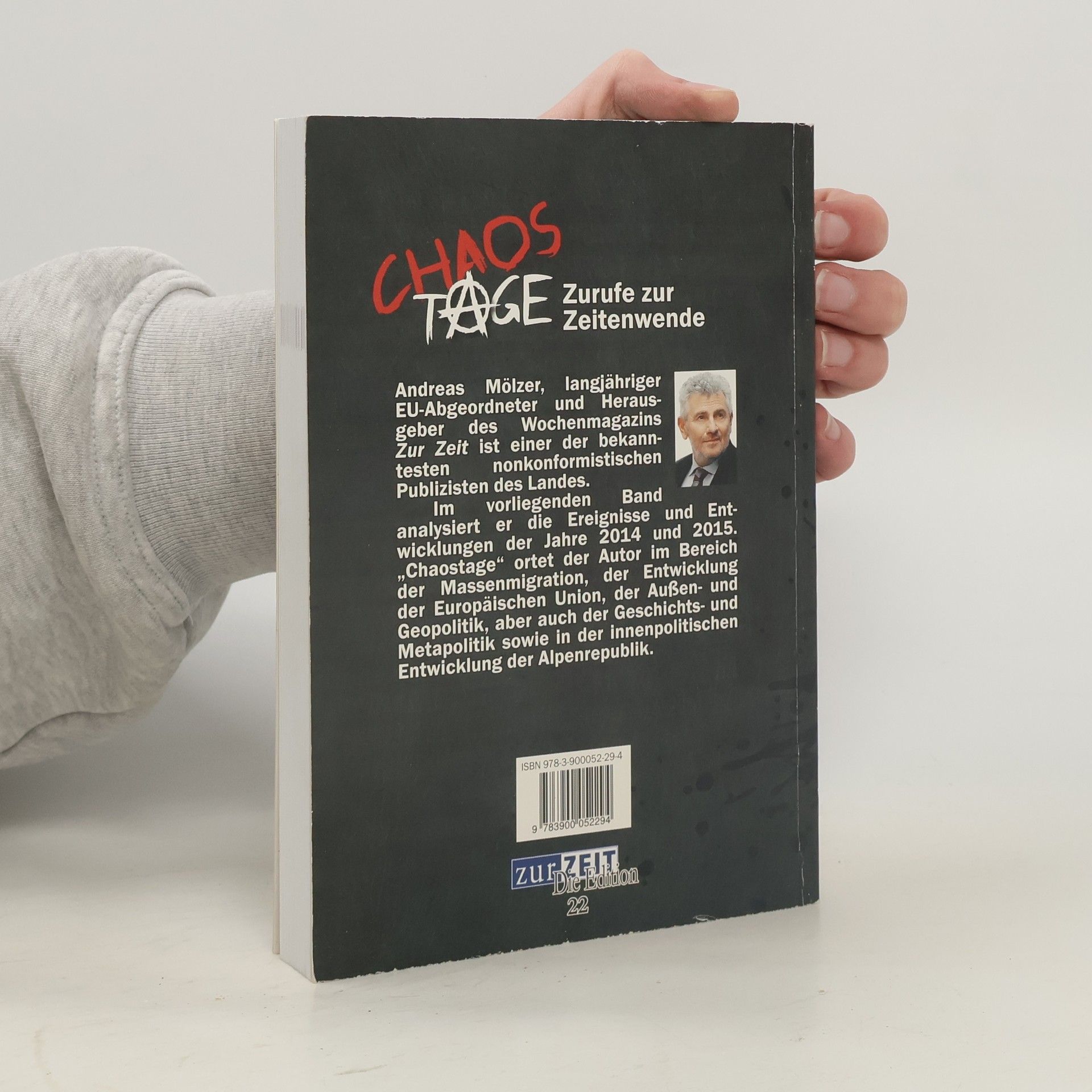 Andreas Mölzer, langjähriger EU-Abgeordneter und Herausgeber des Wochenmagazins Zur Zeit ist einer der bekanntesten nonkonformistischen Publizisten des Landes. Im vorliegenden Band analysiert er die Ereignisse und Entwicklungen der Jahre 2014 und 2015. „Chaostage“ ortet der Autor im Bereich der Massenmigration, der Entwicklung der Europäischen Union, der Außen- und Geopolitik, aber auch der Geschichts- und Metapolitik sowie in der innenpolitischen Entwicklung der Alpenrepublik.