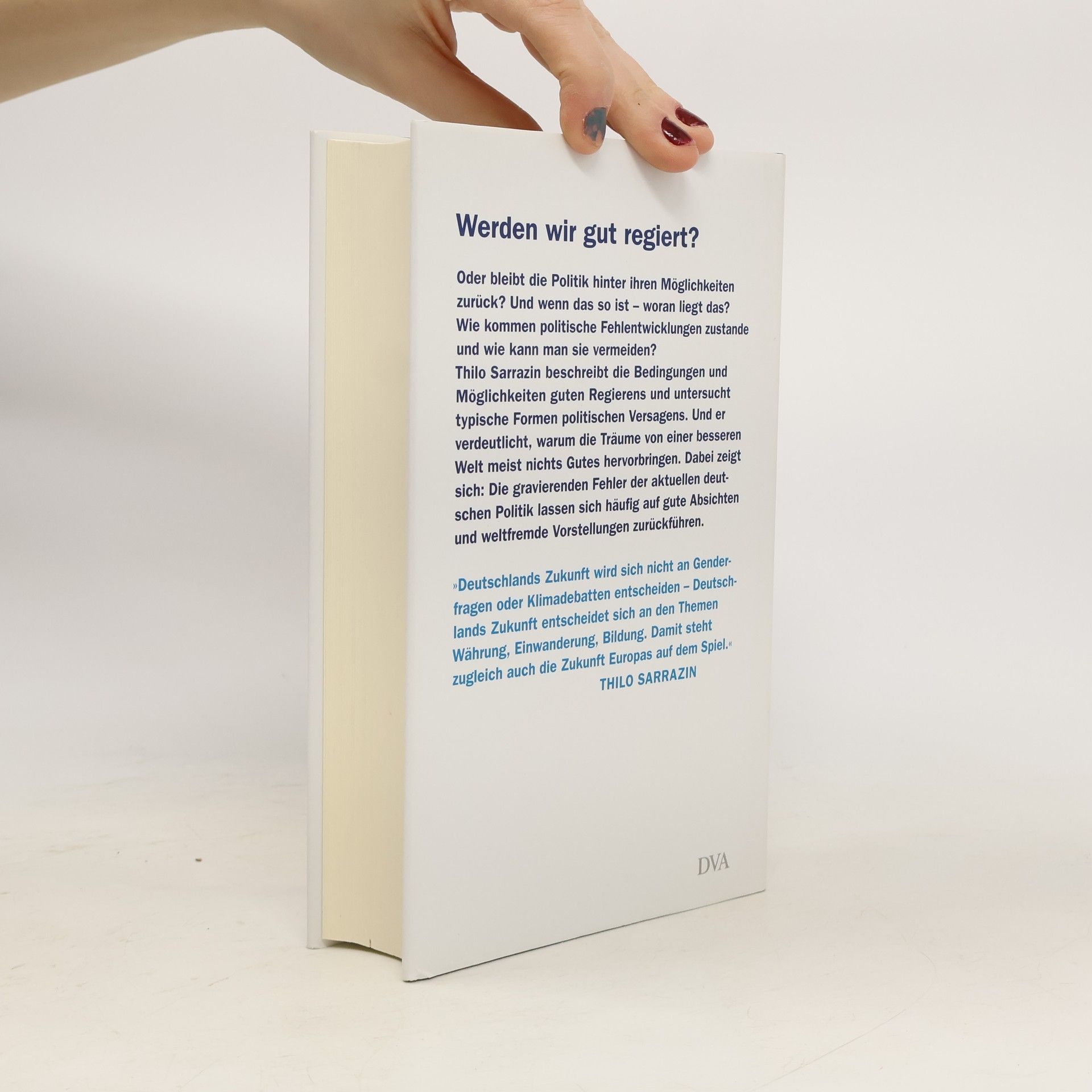Werden wir gut regiert? Oder bleibt die Politik hinter ihren Möglichkeiten zurück? Und wenn das so ist – woran liegt das? Gibt es Techniken guten Regierens?In seinem neuen Buch beschreibt Thilo Sarrazin die Mechaniken von Politik, ihre typischen Fehler und die Gründe für den Erfolg oder Misserfolg von Gesellschaften. Er verdeutlicht, warum die Vorstellungen und Träume von einer besseren Gesellschaft oft nichts Gutes hervorgebracht haben.Von hier schlägt der Autor den Bogen zu den gravierenden Fehlern der aktuellen deutschen Politik von der Einwanderung bis zur Energiewende und erklärt ihre tieferen Ursachen. Auf dieser Grundlage gibt er seine Antworten auf die großen Fragen zur Zukunft Deutschlands. Wer dieses Buch gelesen hat, wird Politik mit anderen Augen betrachten und besser verstehen, wie politische Fehlentwicklungen zustande kommen und wie sie vermieden werden können. „Zu lange hat die Politik versäumt, die wirklich wichtigen Fragen zu adressieren. Deutschlands Zukunft wird sich nicht an Genderfragen oder Klimadebatten entscheiden - Deutschlands Zukunft entscheidet sich an den Themen Währung, Einwanderung, Bildung. Damit steht zugleich auch die Zukunft Europas auf dem Spiel.“ Thilo Sarrazin