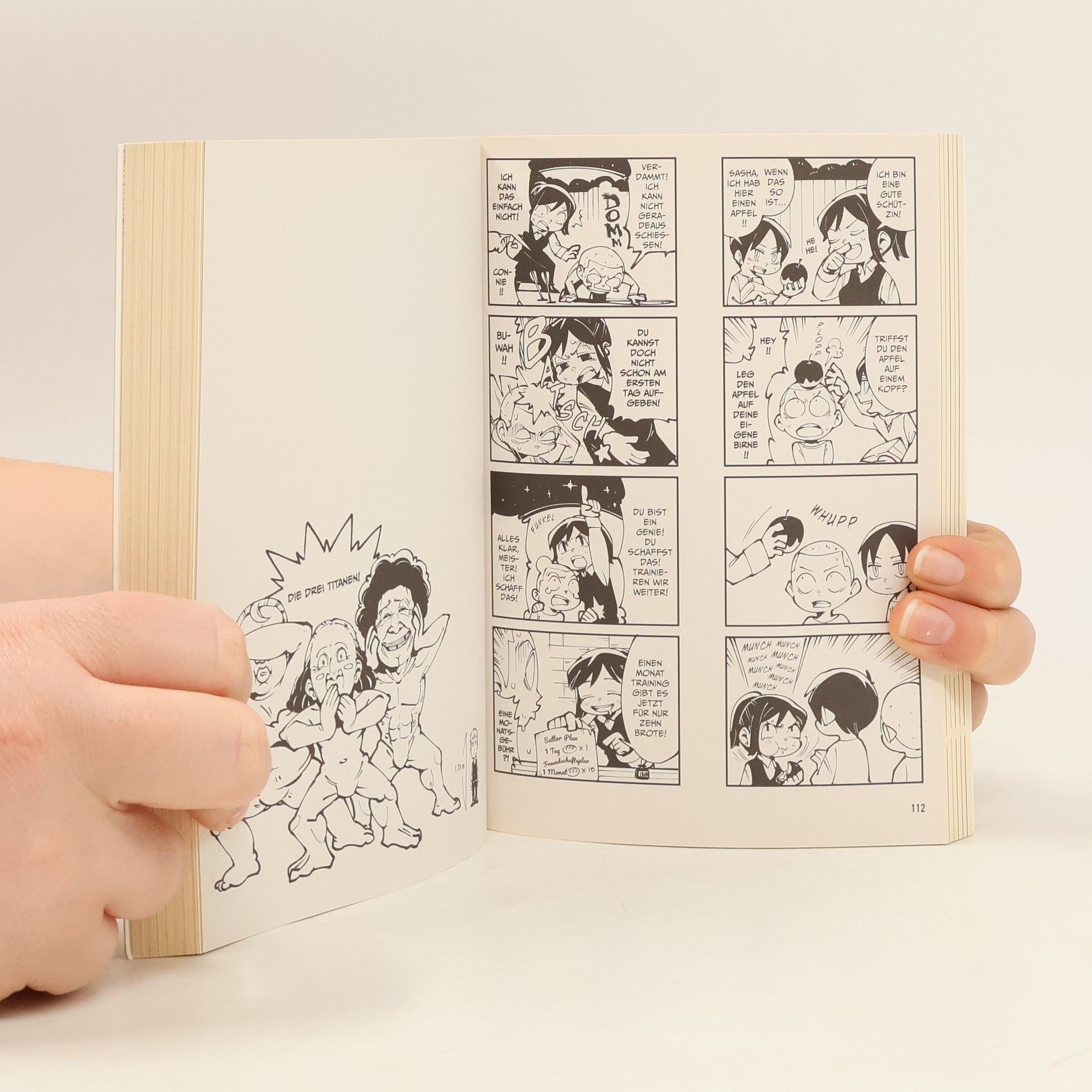 Eren, Mikasa und Armin sind allesamt geschrumpft und jagen keine Titanen, sondern immer die nächste Pointe. Was tun, wenn Connie der Kopf raucht vom vielen Lernen? Genau, erstmal Tee darauf kochen. Für alle, die das Ende der Menschheit schon immer mit Humor gesehen haben!