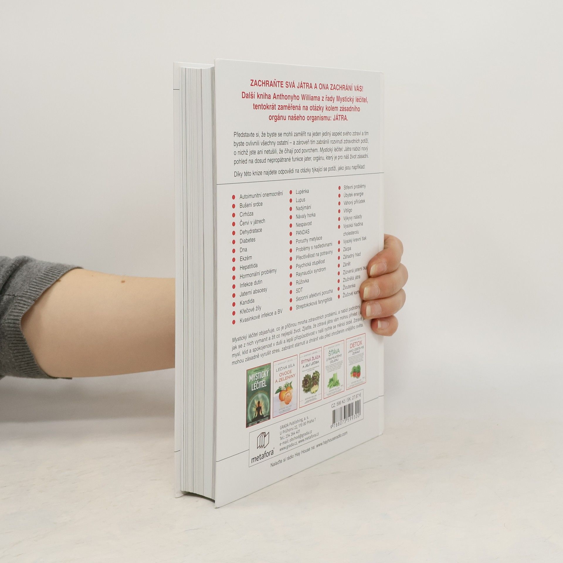Představte si, že byste se mohli zaměřit na jeden jediný aspekt vašeho zdraví a tím byste ovlivnili všechny ostatní – a zároveň tím i preventivně zabránili rozvinutí zdravotních potíží, o nichž jste ani netušili, že číhají pod povrchem. Kniha Mystický léčitel JÁTRA nabízí odpovědi, které byste měli znát. Anthony William se čtenáři nadšeně sdílí naprosto nový pohled na dosud nepropátrané funkce jater, orgánu, který je pro náš život zásadní. ​ Mystický léčitel objasňuje, co je příčinou mnoha zdravotních problémů, a nabízí podrobný návod, jak se z nich vymanit a žít co nejlepší život. Zjistíte, že zdravá játra vám mohou přinést i jasnou mysl, klid a spokojenost a lepší přizpůsobivost v dnešní rychle se měnící době. A díky nim můžete dosáhnout i toho, že budete dobře spát, mít vyrovnanou hladinu krevního cukru, nižší krevní tlak i hmotnost, budete vypadat mladší a hlavně se tak i cítit. Zdravá játra mohou zásadně vyrušit stres, zabránit stárnutí a chránit vás před ohrožením vnějšího světa – jen pokud jim dopřejete tu správnou péči.