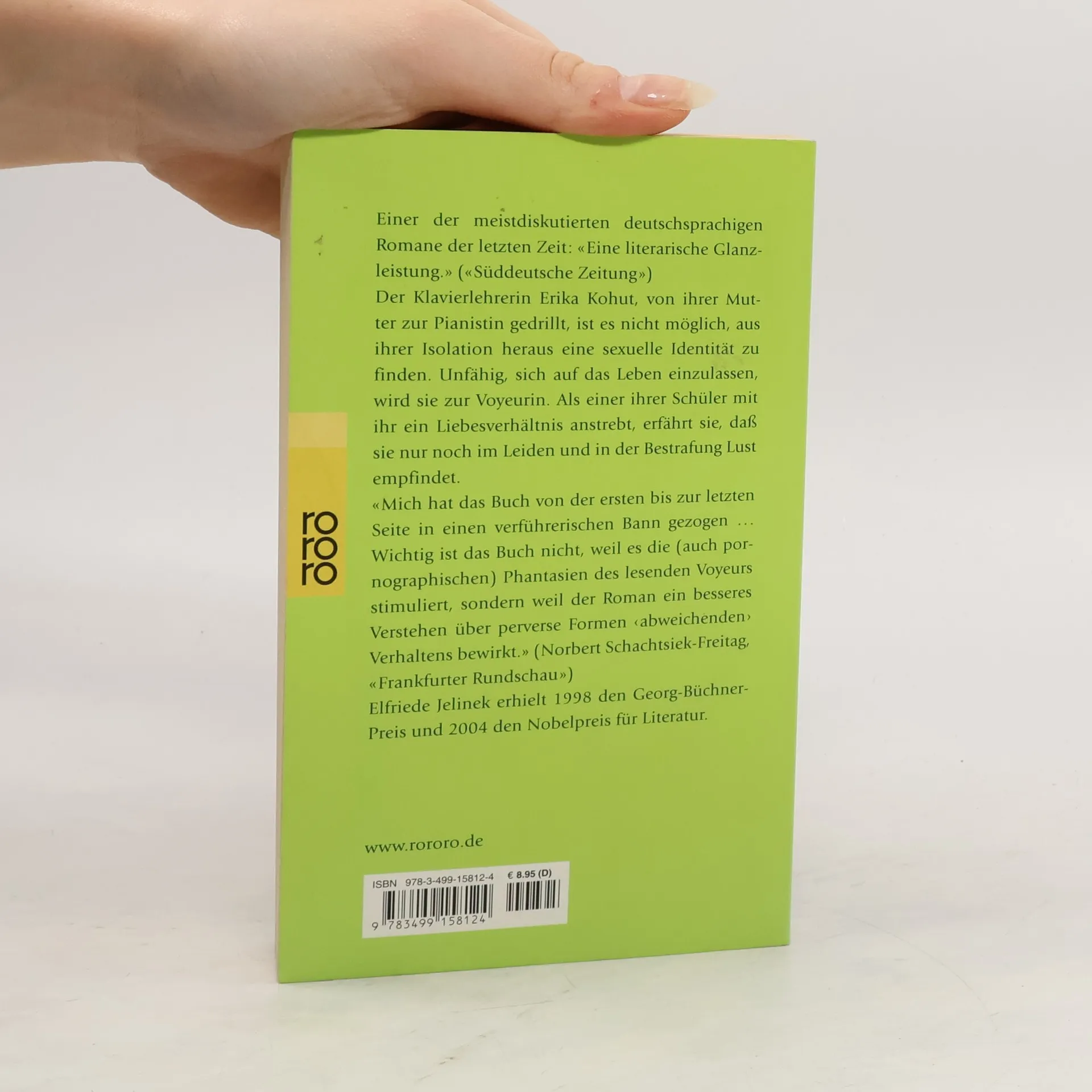 «Eine literarische Glanzleistung.» (Süddeutsche Zeitung)Von ihrer Mutter wurde sie unerbittlich zur Pianistin gedrillt. Und nun findet die Klavierlehrerin Erika Kohut nicht mehr aus der Isolation heraus. Unfähig, sich auf das Leben einzulassen, wird sie zur Voyeurin. Als einer ihrer Schüler ein Liebesverhältnis mit ihr anstrebt, erkennt sie, dass sie nur noch im Leiden und in der Bestrafung Lust empfindet.«Die Klavierspielerin» brachte Elfriede Jelinek den endgültigen Durchbruch. Michael Hanekes Verfilmung triumphierte auf dem Filmfestival 2001 in Cannes: Grand Prix der Jury und Darstellerpreise für Isabelle Huppert und Benoît Magimel. Die Autorin wurde für ihr Werk im Jahr 2004 mit dem Nobelpreis für Literatur ausgezeichnet.