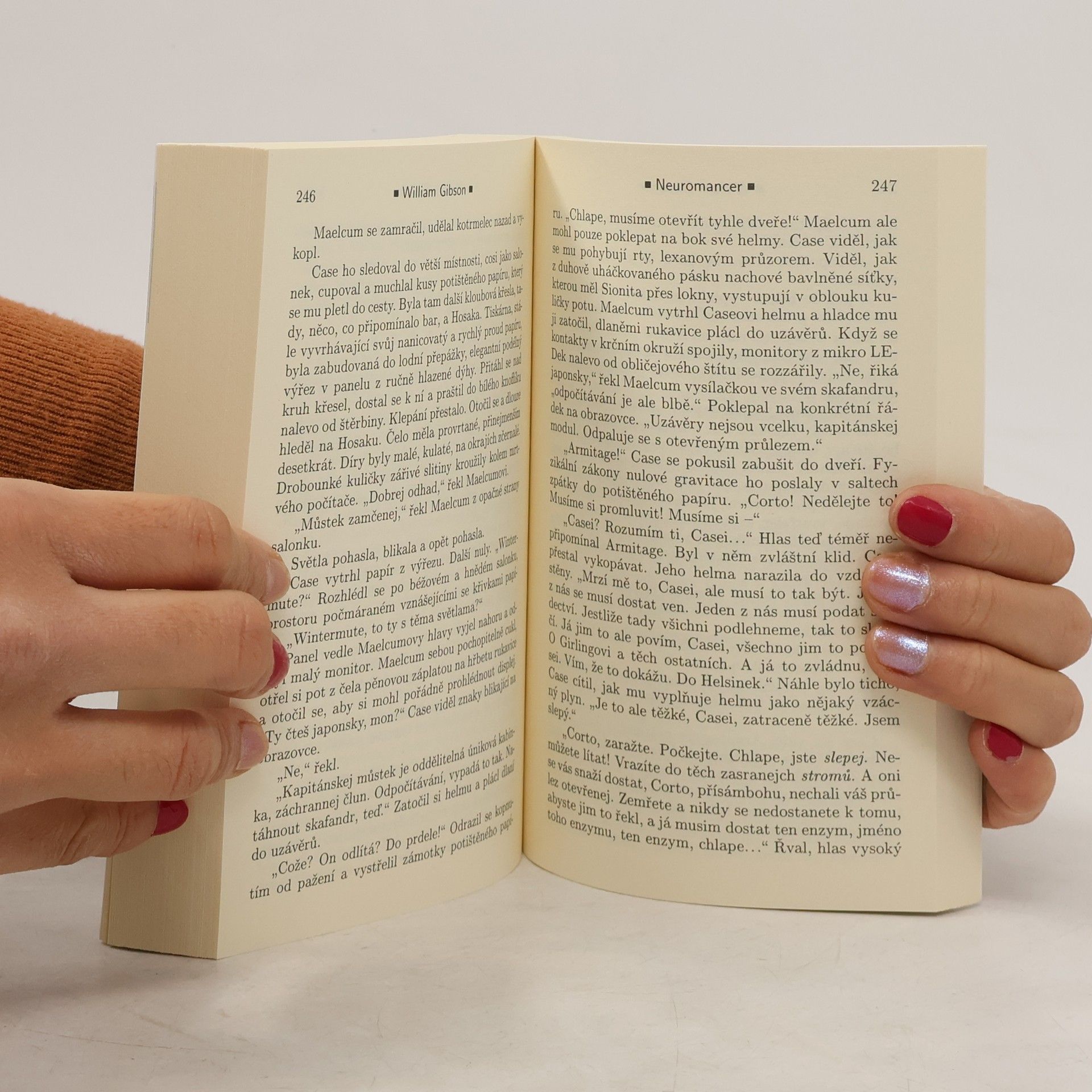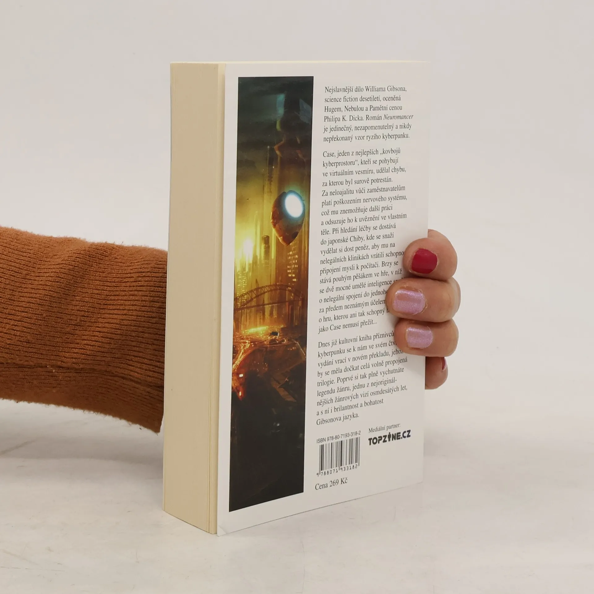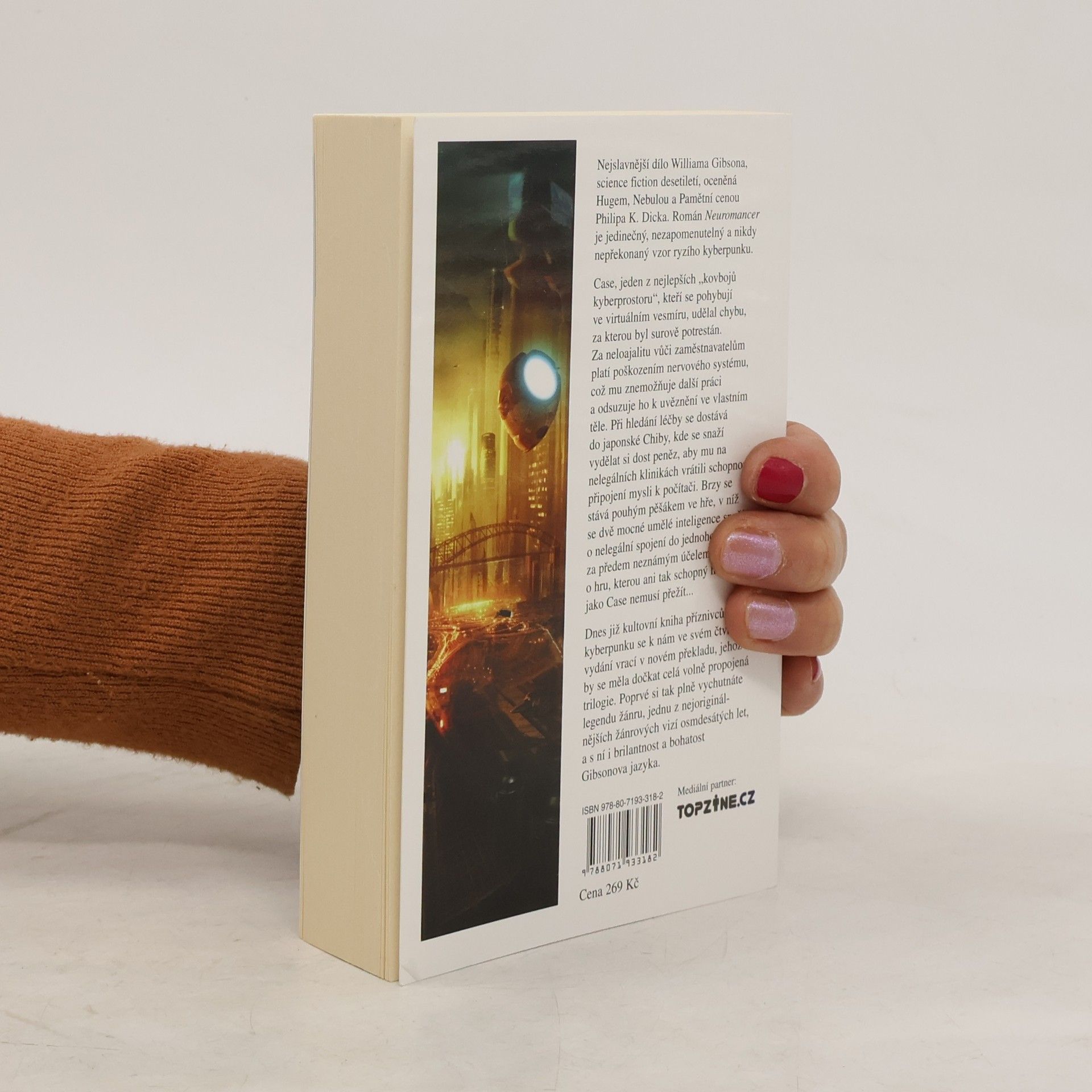 Case, jeden z nejlepších „kovbojů kyberprostoru“, kteří se pohybují ve virtuálním vesmíru, udělal chybu, za kterou byl surově potrestán. Za neloajalitu vůči zaměstnavatelům platí poškozením nervového systému, což mu znemožňuje další práci a odsuzuje ho k uvěznění ve vlastním těle. Při hledání léčby se dostává do japonské Chiby, kde se snaží vydělat si dost peněz, aby mu na nelegálních klinikách vrátili schopnost připojení mysli k počítači. Brzy se stává pouhým pěšákem ve hře, v níž se dvě mocné umělé inteligence snaží o nelegální spojení do jednoho celku za předem neznámým účelem. Jde o hru, kterou ani tak schopný hacker jako Case nemusí přežít... Dnes již kultovní kniha příznivců kyberpunku se k nám ve svém čtvrtém vydání vrací v novém překladu, jehož by se měla dočkat celá volně propojená trilogie. Poprvé si tak plně vychutnáte legendu žánru, jednu z nejoriginálnějších žánrových vizí osmdesátých let, a s ní i brilantnost a bohatost Gibsonova jazyka. Science fiction desetiletí odměněná Hugem, Nebulou a Pamětní cenou Philipa K. Dicka.