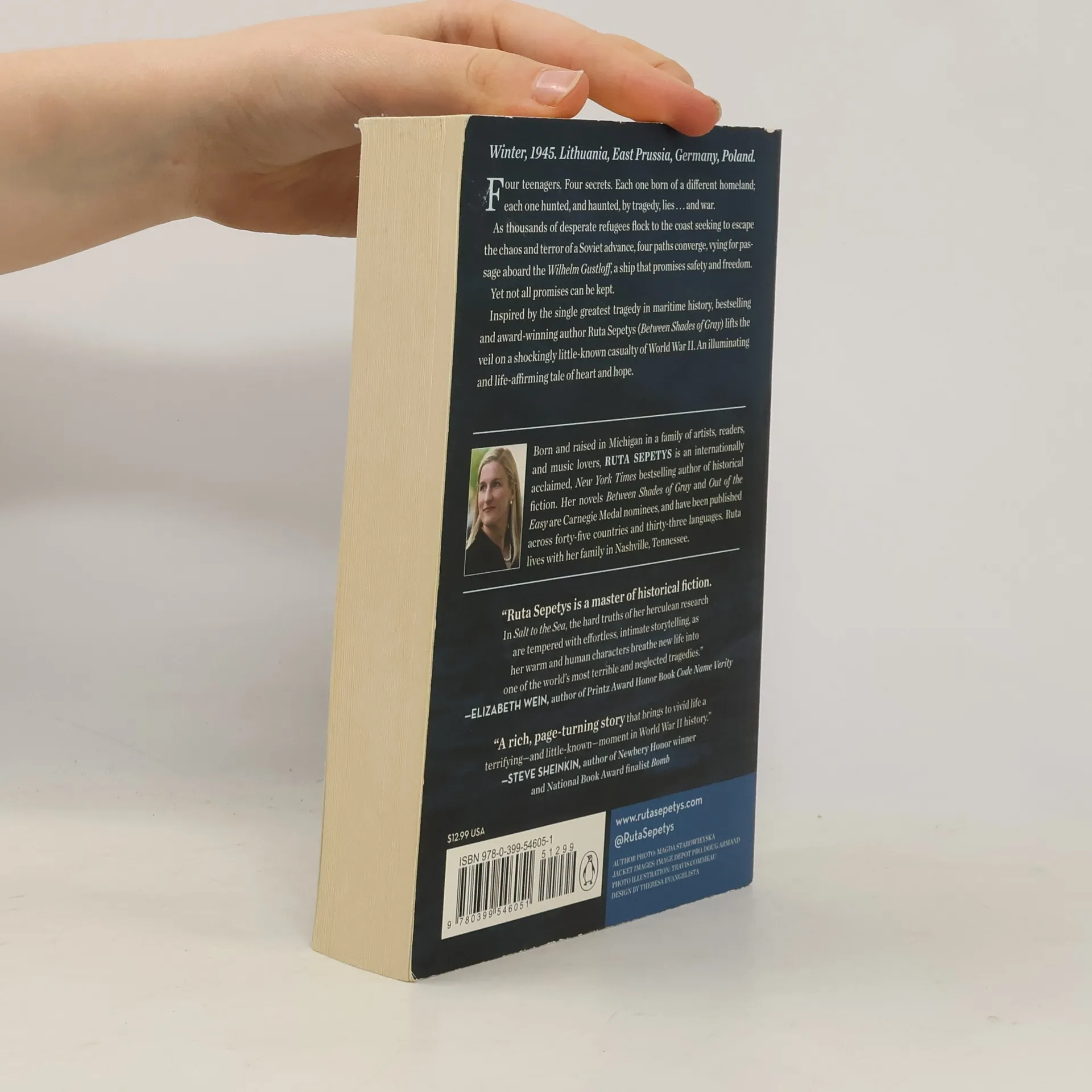 Winter, 1945. Four teenagers. Four secrets. Each one born of a different homeland; each one hunted, and haunted, by tragedy, lies…and war. As thousands of desperate refugees flock to the coast in the midst of a Soviet advance, four paths converge, vying for passage aboard the Wilhelm Gustloff, a ship that promises safety and freedom. Yet not all promises can be kept. Inspired by the single greatest tragedy in maritime history, bestselling and award-winning author Ruta Sepetys (Between Shades of Gray) lifts the veil on a shockingly little-known casualty of World War II. An illuminating and life-affirming tale of heart and hope.