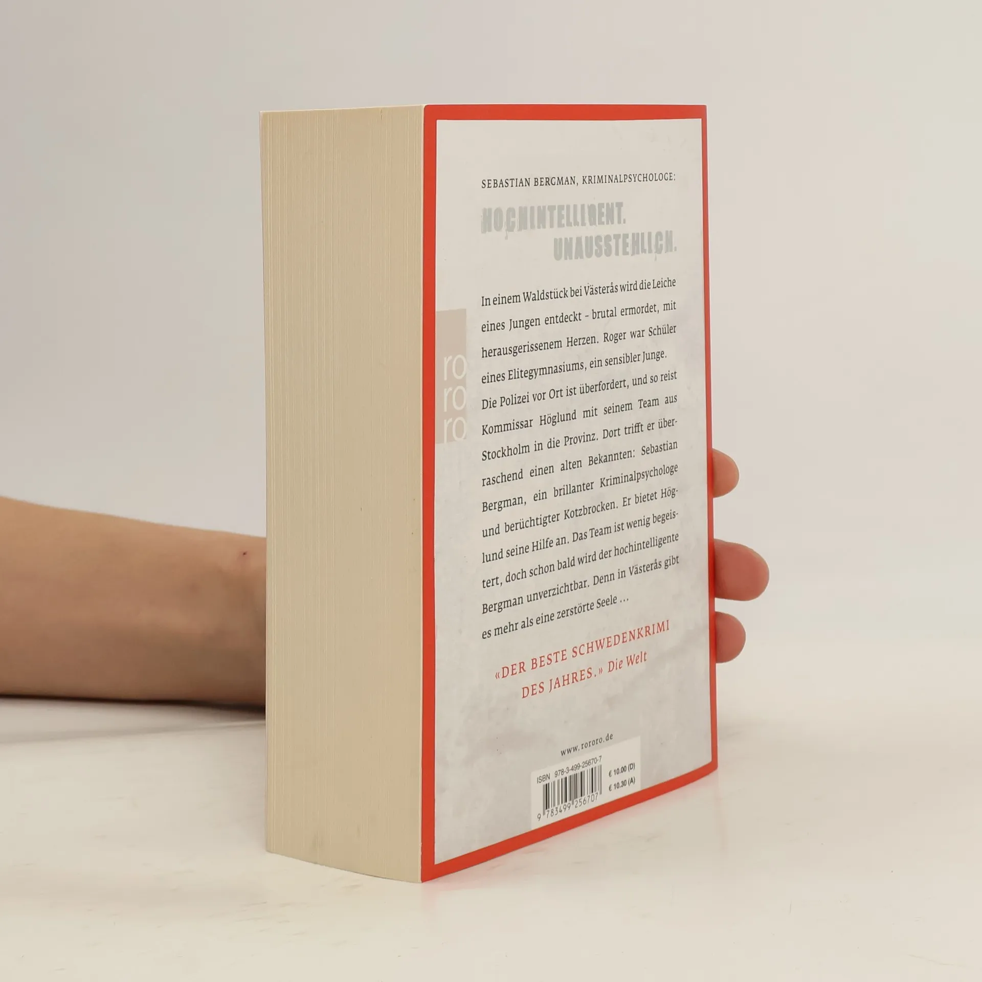 Sebastian Bergman, Kriminalpsychologe: Hochintelligent. Unausstehlich. In einem Waldstück bei Västerås wird die Leiche eines Jungen entdeckt – brutal ermordet, mit herausgerissenem Herzen. Roger war Schüler eines Elitegymnasiums, ein sensibler Junge. Die Polizei vor Ort ist überfordert, und so reist Kommissar Höglund mit seinem Team aus Stockholm in die Provinz. Dort trifft er überraschend einen alten Bekannten: Sebastian Bergman, ein brillanter Kriminalpsychologe und berüchtigter Kotzbrocken. Er bietet Höglund seine Hilfe an. Das Team ist wenig begeistert, doch schon bald wird der hochintelligente Bergman unverzichtbar. Denn in Västerås gibt es mehr als eine zerstörte Seele ... Sebastian Bergmans erster Fall
