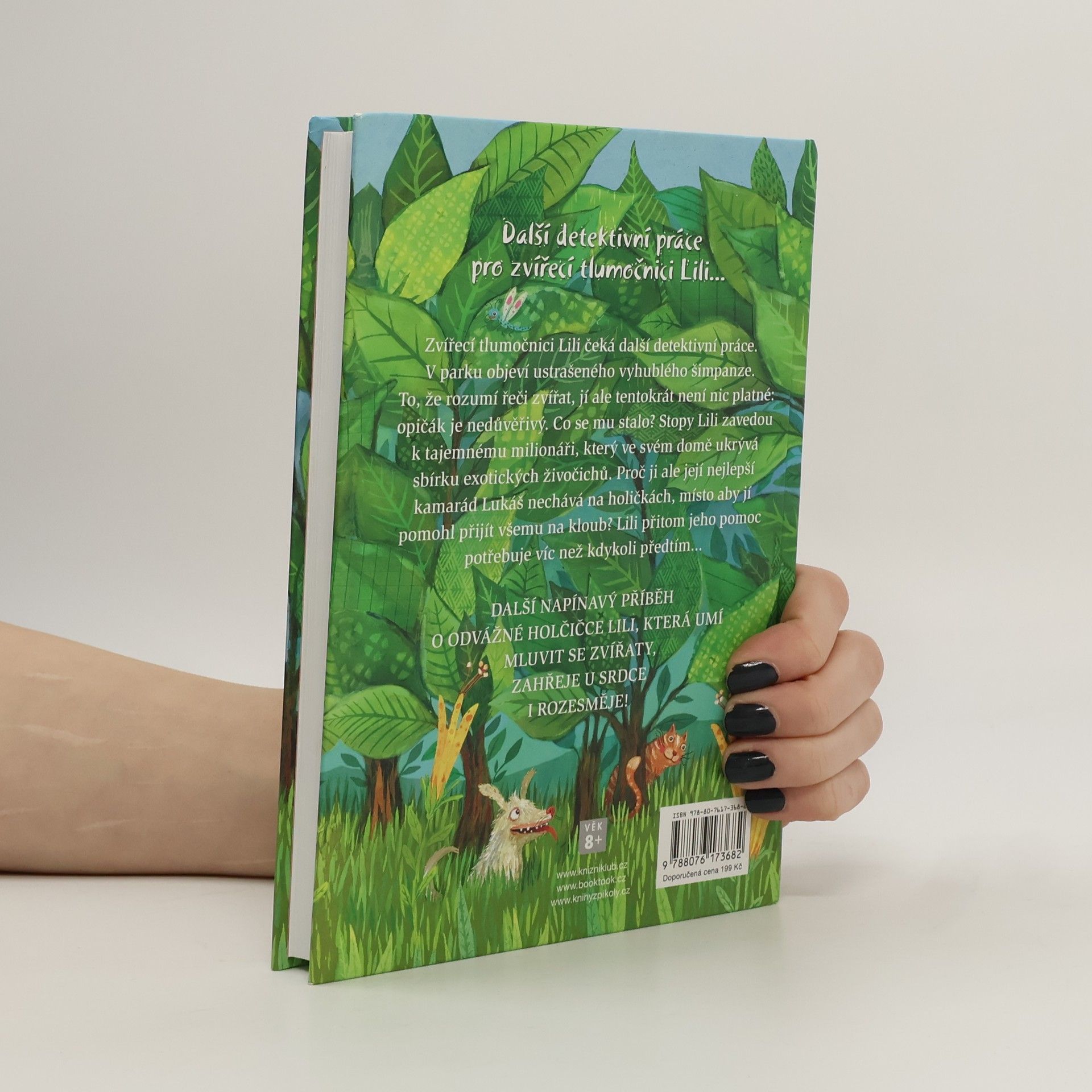 Zvířecí tlumočnici Lili čeká další detektivní práce. V parku objeví vyhublého ustrašeného šimpanze. Schopnost mluvit se zvířaty jí tentokrát není nic platná: opičák je nedůvěřivý. Co se mu stalo? Stopy dívku zavedou k tajemnému milionáři, který ve svém domě skrývá sbírku exotických zvířat. Proč ji ale její nejlepší kamarád Lukáš nechává na holičkách, místo aby jí pomohl přijít všemu na kloub? Lili přitom jeho pomoc potřebuje víc než kdykoli předtím… Další napínavý příběh o odvážné holčičce Lili, která umí mluvit se zvířaty, zahřeje u srdce i rozesměje! Kniha je určena dětem od 8 let.