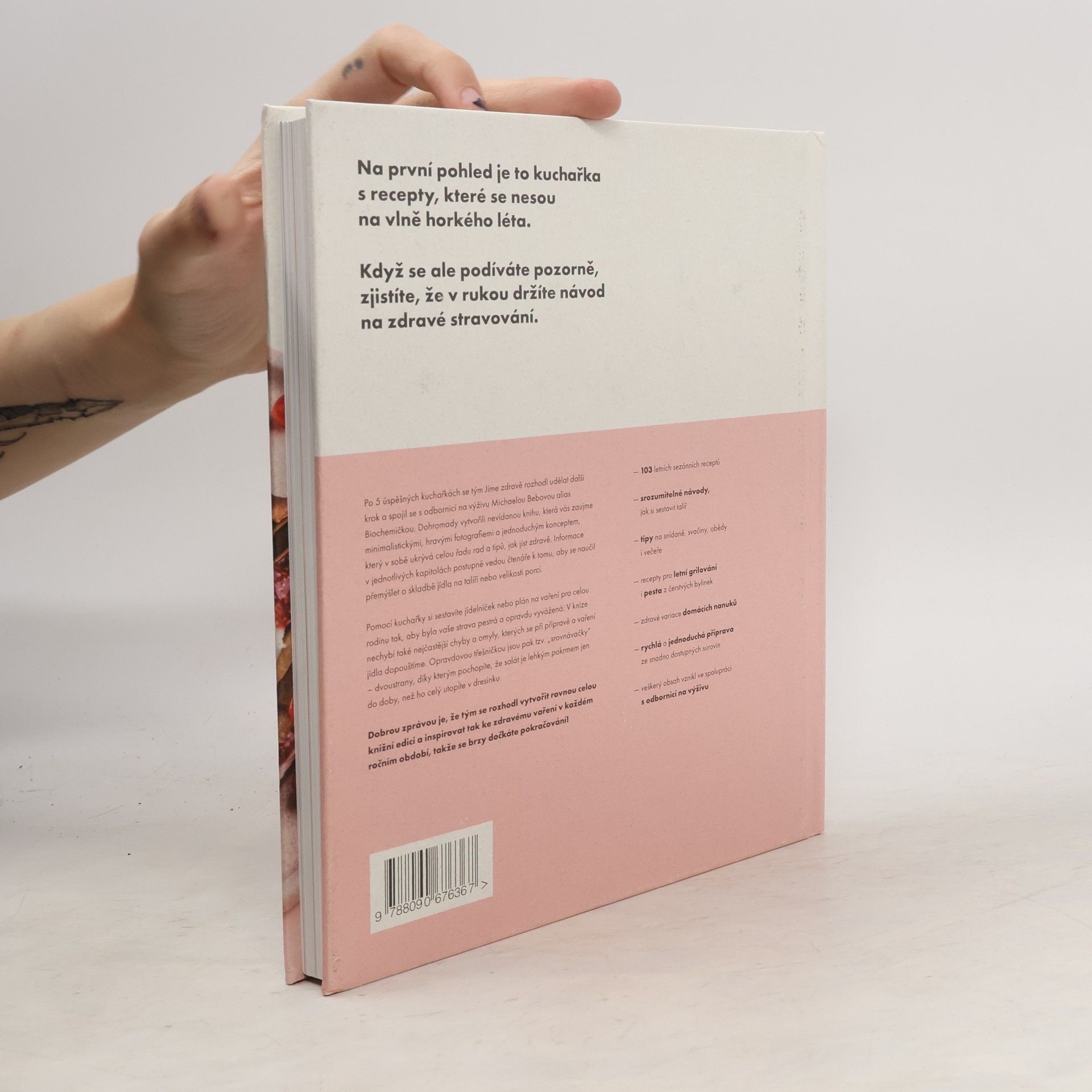 Na první pohled je to kuchařka s recepty, které se nesou na vlně horkého léta. Když se ale podíváte pozorně, zjistíte, že držíte v rukou návod na zdravé stravování. Po 5 úspěšných kuchařkách se tým Jíme zdravě rozhodl udělat další krok a spojil se s odbornicí na výživu Michaelou Bebovou alias Biochemičkou. Dohromady vytvořili knihu, která vás zaujme minimalistickými, hravými fotografiemi a jednoduchým konceptem, který v sobě ukrývá celou řadu rad a tipů, jak jíst zdravě. Informace v jednotlivých kapitolách postupně vedou čtenáře k tomu, aby se naučil přemýšlet o skladbě jídla na talíři nebo velikosti porcí. Pomocí kuchařky si sestavíte jídelníček nebo plán na vaření pro celou rodinu tak, aby byla vaše strava pestrá a opravdu vyvážená. V knize nechybí také nejčastější chyby a omyly, kterých se při přípravě a vaření jídla dopouštíme. Opravdovou třešničkou jsou pak tzv. „srovnávačky“ – dvoustrany, díky kterým pochopíte, že salát je lehkým pokrmem jen do doby, než ho celý utopíte v dresinku. Na co se v kuchařce těšit? * 103 letních sezónních receptů * srozumitelné návody, jak si sestavit talíř * tipy na snídaně, svačiny, obědy i večeře * recepty pro letní grilování i pesta z čerstvých bylinek * zdravé variace domácích nanuků * rychlá a jednoduchá příprava ze snadno dostupných surovin *veškerý obsah vznikl ve spolupráci s odbornicí na výživu?