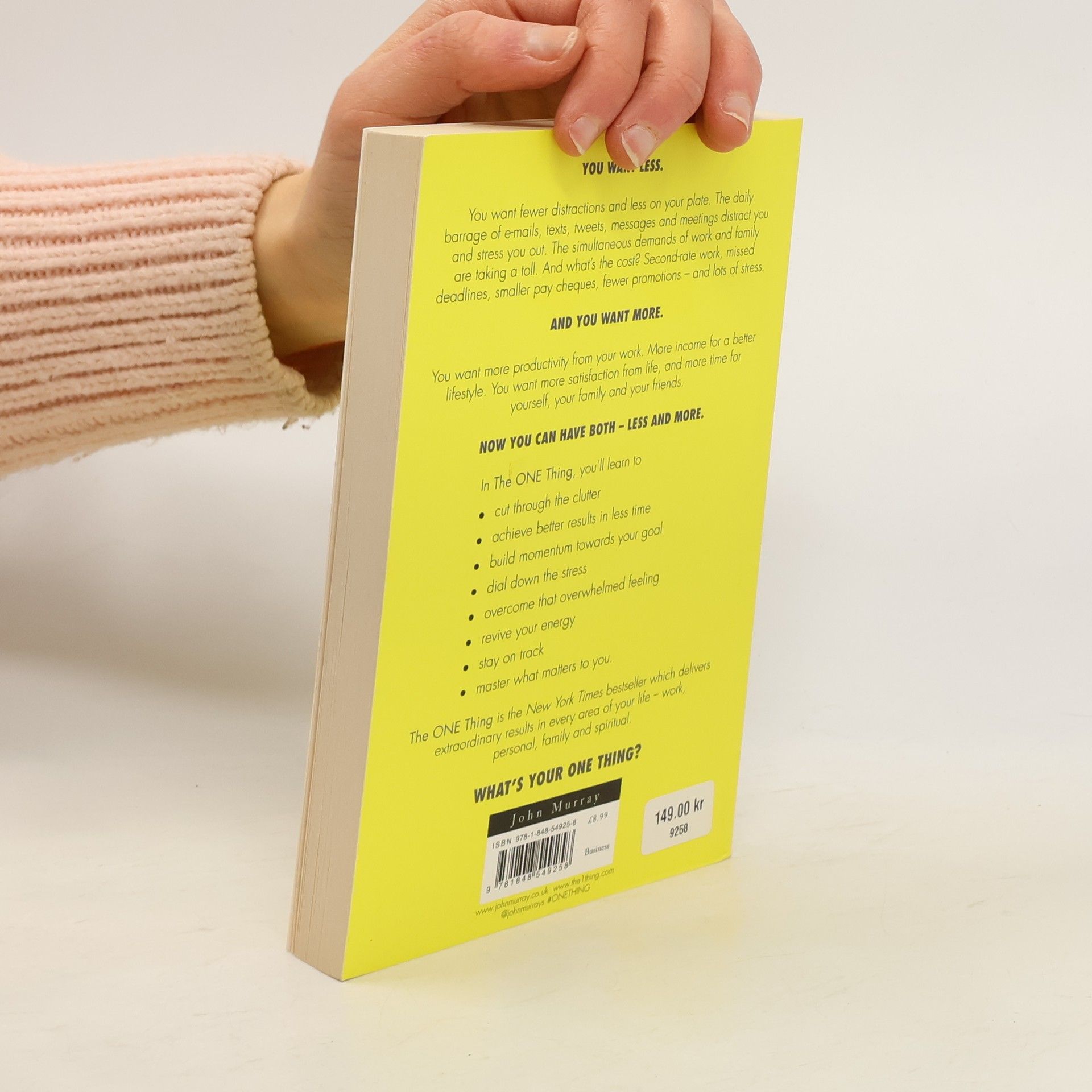 "YOU WANT LESS. You want fewer distractions and less on your plate. The daily barrage of e-mails, texts, tweets, messages, and meetings distract you and stress you out. The simultaneous demands of work and family are taking a toll. And what's the cost? Second-rate work, missed deadlines, smaller pay cheques, fewer promotions-and lots of stress. AND YOU WANT MORE. You want more productivity from your work. More income for a better lifestyle. You want more satisfaction from life, and more time for yourself, your family, and your friends. NOW YOU CAN HAVE BOTH-LESS AND MORE. In The ONE Thing, you'll learn to cut through the clutter achieve better results in less time build momentum toward your goal dial down the stress overcome that overwhelmed feeling revive your energy stay on track master what matters to you The ONE Thing is the New York Times bestseller which delivers extraordinary results in every area of your life-work, personal, family, and spiritual. WHAT'S YOUR ONE THING? "--Publisher's description