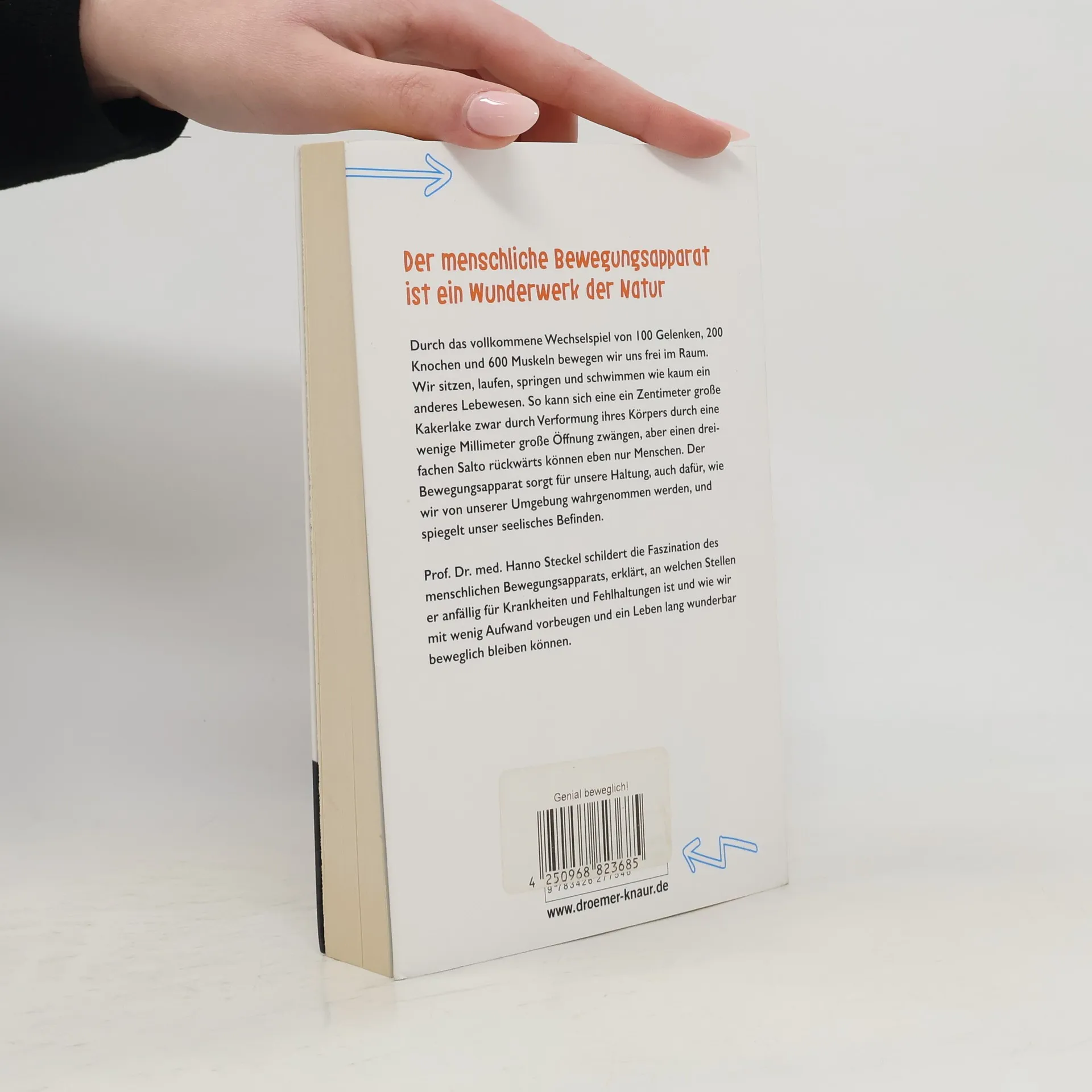 Rücken, Schulter, Hüfte, Knie, Arm-, Hand- und Fußgelenk: Was uns beweglich macht, was den Menschen tanzen, turnen, springen lässt, bereitet ihm oft genug Schmerzen. 10 Millionen Deutsche leiden an Knie-, 60 Millionen irgendwann im Leben an Rückenproblemen. Professor Steckel erklärt anschaulich und spannend den menschlichen Bewegungsapparat und die Beschwerden, die von ihm ausgehen können. Unser Bewegungsapparat ist ein Wunderwerk. Durch das perfekte Wechselspiel von 100 Gelenken, 200 Knochen und 600 Muskeln bewegen wir uns frei im Raum wie kaum ein anderes Lebewesen. Das Bewegungsorgan sorgt für unsere Körperhaltung, dafür, wie wir von unserer Umgebung wahrgenommen werden und spiegelt unser seelisches Befinden. Es beeinflusst wie wenig andere Aspekte unseres Körpers das tägliche Leben jedes Einzelnen. Das zeigt sich schmerzlich darin, dass ein Viertel aller Krankschreibungen durch Muskel- und Skeletterkrankungen bedingt sind. Prof. Dr. Hanno Steckel erklärt den Bewegungsapparat des Menschen in diesem populären, kurzweiligen Sachbuch.