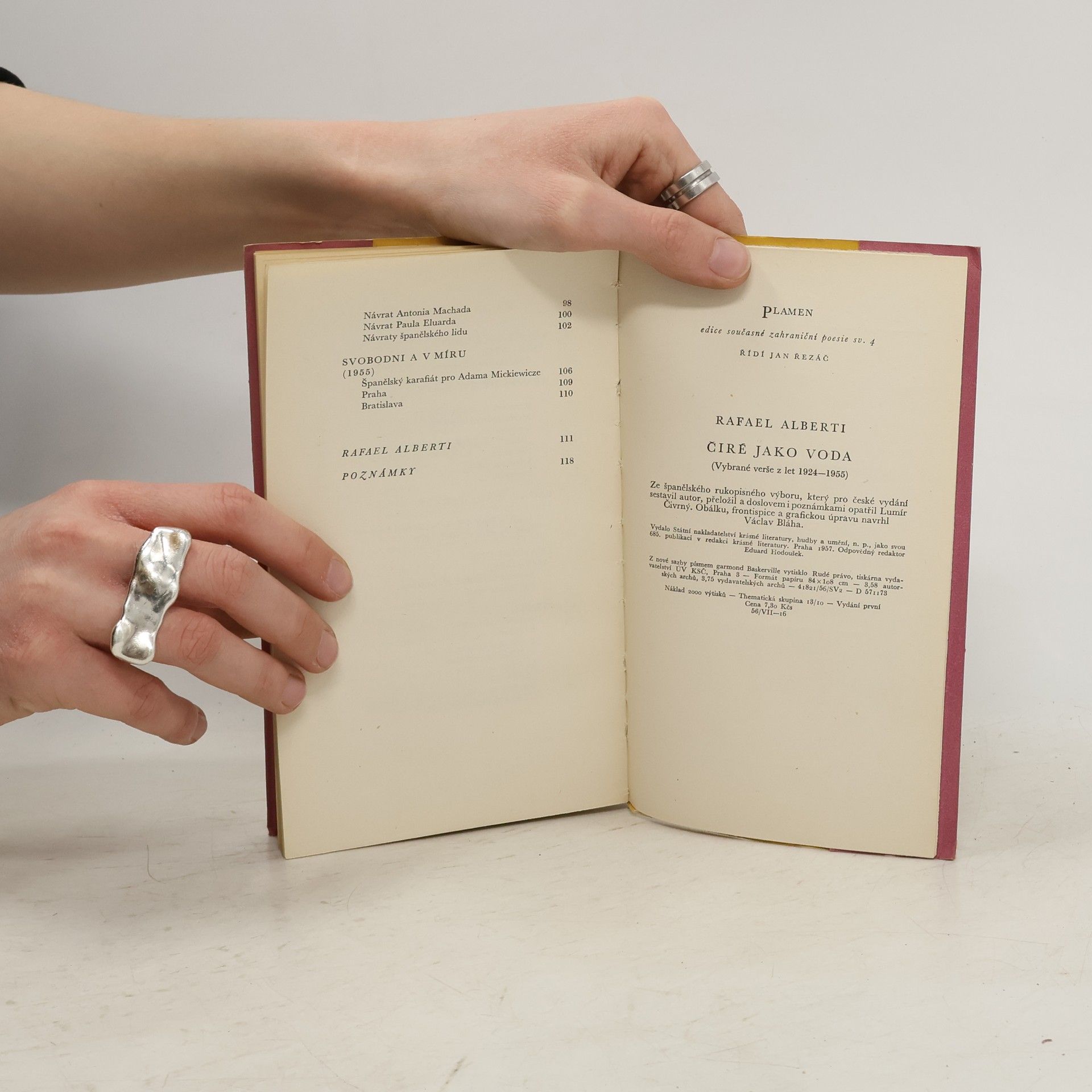 Vybrané verše španělského básníka z let 1924–1955 v překladu Lumíra Čivrného (výbor sestavil sám autor pro české vydání). Ve výboru jsou zahrnuty jak básníkovy verše lyrické, z nichž vane stesk po rodném přímořském kraji, opuštěném již v mládí, i vášnivá láska k celé španělské zemi, její přírodě a jejímu lidu, tak i jeho poesie občanská. V celé své tvorbě jeví se Alberti mistrem verše, suverénně ovládajícím nejrozmanitější básnické formy.
