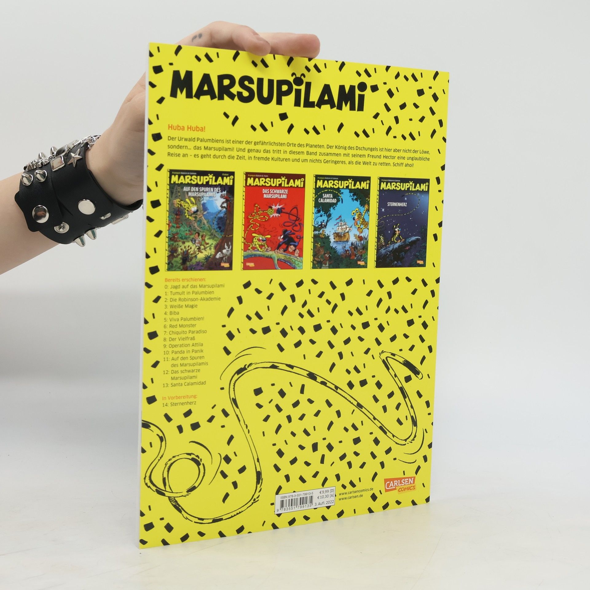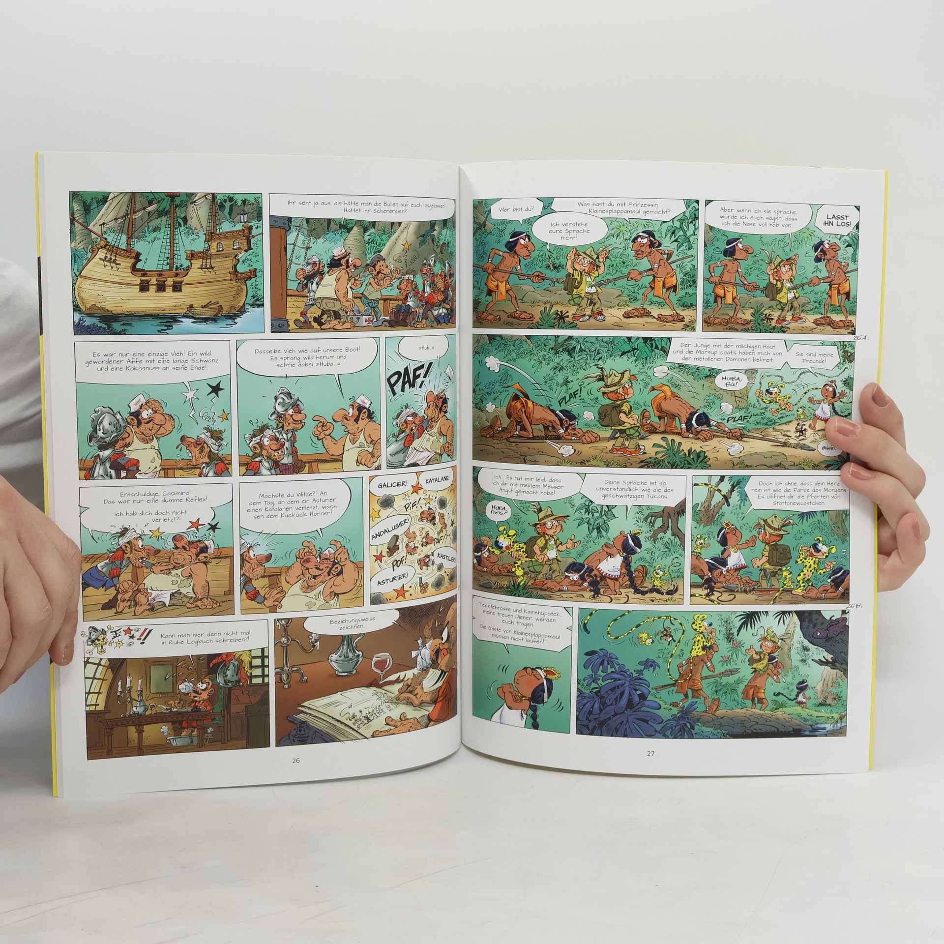 Abenteuer für Leseanfänger Das Marsupilami ist eines der tollsten Tiere des palumbianischen Dschungels! Es ist super intelligent, super stark und es kann super wütend werden, wenn jemand seiner Familie oder dem Dschungel etwas Böses will. Dann macht es aus seinem acht Meter langen Schwanz eine Keule und verteilt Beulen für die Bösewichte! Conquistadoren in Palumbien Hector und die Marsupilamis machen eine Expedition in den Dschungel. Dabei entdecken sie etwas Unglaubliches: eine alte spanische Galeone ! Eingewachsen und halb vermodert liegt sie im Wasser des Flusses. Als sie das alte Schiff erkunden, geschehen seltsame Dinge, und auf einmal finden sie sich an einem sehr weit entfernten Ort wieder. Die Galeone vor ihre Augen glänzt auf einmal, als wäre sie neu ! Wie ist das nur möglich? Mit dem Marsupilami macht das Lesen lernen richtig Spaß!