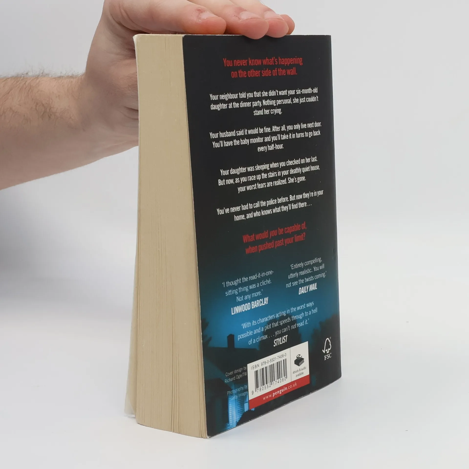 You never know what's happening on the other side of the wall. Your neighbour told you that she didn't want your six-month-old daughter at the dinner party. Nothing personal, she just couldn't stand her crying. Your husband said it would he fine. After all, you only live next door. You'll have the baby monitor and you'll take it in turns to go back every half-hour. Your daughter was sleeping when you checked on her last. But now, as you race up the stairs in your deathly quiet house, your worst fears are realized. She's gone. You've never had to call the police before. But now they're in your home, and who knows what they'll find there... What would you be capable of, when pushed past your limit ?
