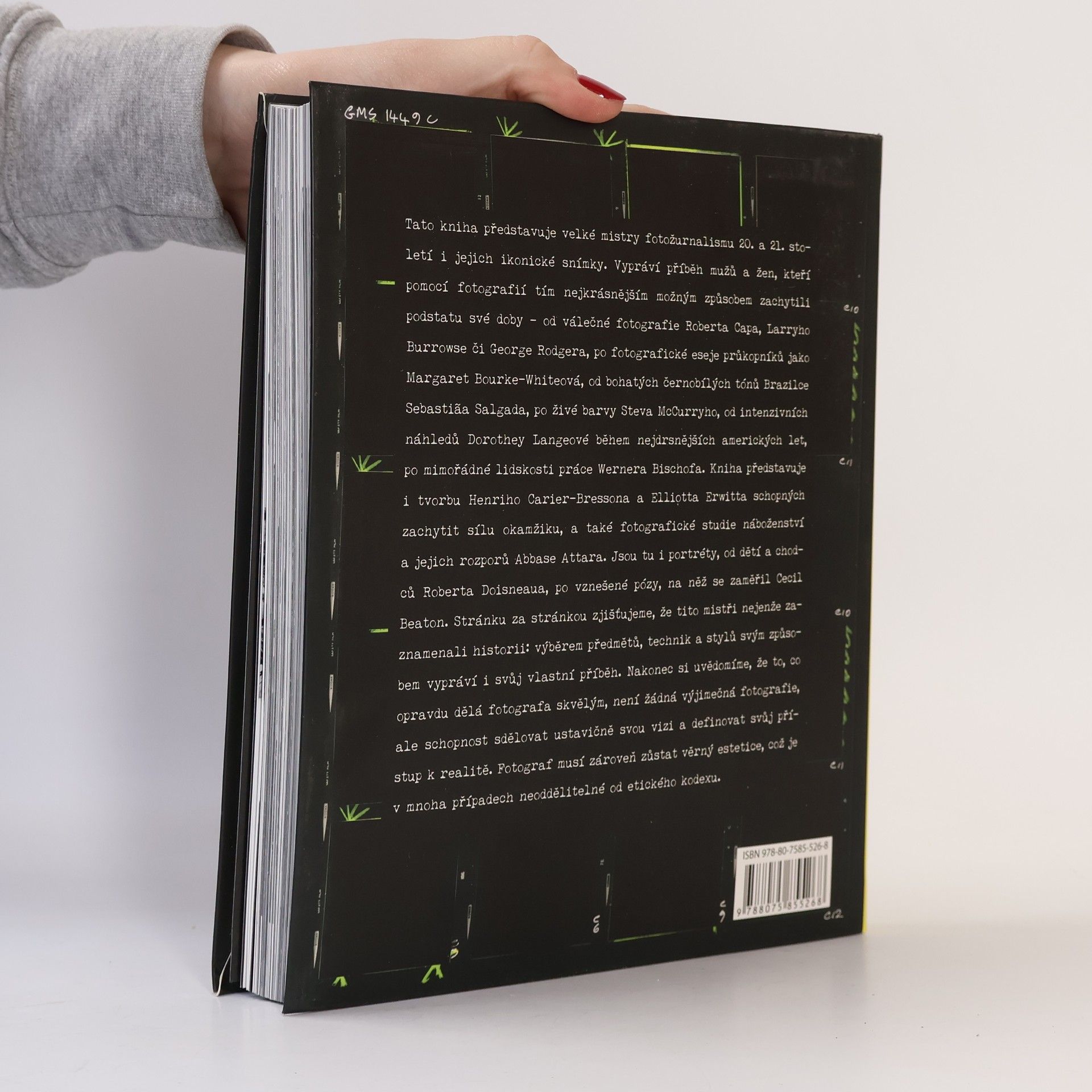 Tato kniha představuje velké mistry fotožurnalismu 20. a 21. Století i jejich ikonické snímky. Vypráví příběh mužů a žen, kteří pomocí fotografií tím nejkrásnějším možným způsobem zachytili podstatu své doby – od válečné fotografie Roberta Capa, Larryho Burrowse či George Rodgera, po fotografické eseje průkopníků jako Margaret Bourke-Whiteová, od bohatých černobílých tónů Brazilce Sebastia~a Salgada, po živé barvy Steva McCurryho, od intenzivních náhledů Dorothey Langeové během nejdrsnějších amerických let, po mimořádné lidskosti práce Wernera Bischofa. Kniha představuje i tvorbu Henriho Carier-Bressona a Elliotta Erwitta schopných zachytit sílu okamžiku, a také fotografické studie náboženství a jejich rozporů Abbase Attara. Jsou tu i portréty, od dětí a chodců Roberta Doisneaua, po vznešené pózy, na něž se zaměřil Cecil Beaton. Stránku za stránkou zjišťujeme, že tito mistři nejenže zaznamenali historii: výběrem předmětů, technik a stylů svým způsobem vypráví i svůj vlastní příběh. Nakonec si uvědomíme, že to, co opravdu dělá fotografa skvělým, není žádná výjimečná fotografie, ale schopnost sdělovat ustavičně svou vizi a definovat svůj přístup k realitě. Fotograf musí zároveň zůstat věrný estetice, což je v mnoha případech neoddělitelné od etického kodexu.