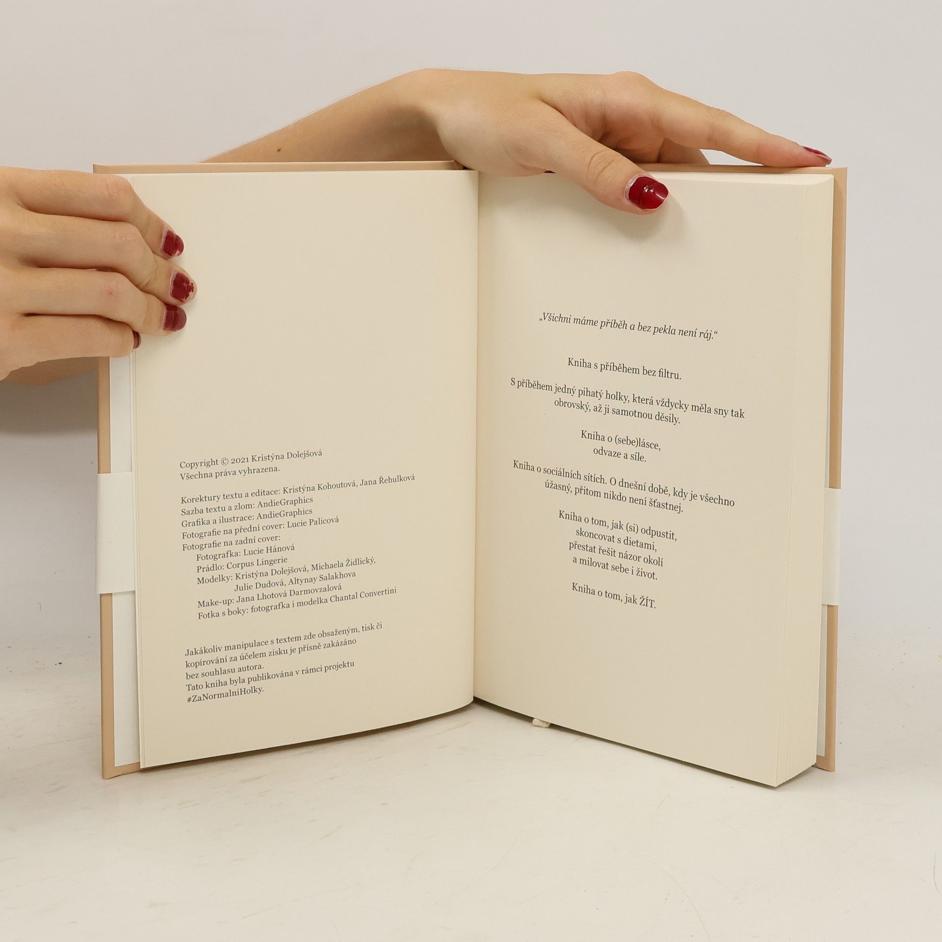O ČEM JE KNIHA BEZ FILTRU? Knihu BEZ FILTRU jsem napsala já, Kristýna Dolejšová, autorka projektu #ZaNormalniHolky. Co na vás v knize čeká? Můj osobní příběh. O mém dětství, závislosti na sladkém, neustálých dietách, toxickém vztahu a mnohem víc. Jak a proč vzniknul projekt #ZaNormalniHolky Výsledky anonymního dotazníku o těle a sebevědomí, jenž vyplnilo přes 5000 dívek Odpovědi na vašich 50 nejčastějších otázek Sociální sítě a jejich vliv na sebedůvěru dětí Kyberšikana, sexting a bezpečnost na internetu Sebeláska - co to je a proč ji praktikovat Tři zásadní způsoby, jak praktikovat sebelásku Vztah k jídlu a jak ho zahojit Mých 13 osobních hodnot, které mi vždy pomohou odpustit si a vrátit se do hry Skutečný rozhovor mezi mnou a jednou čtenářkou Perličky z projektu WORKBOOK - 30 stran připravených na Tvou kreativní energii a (znovu)objevení ženskosti
