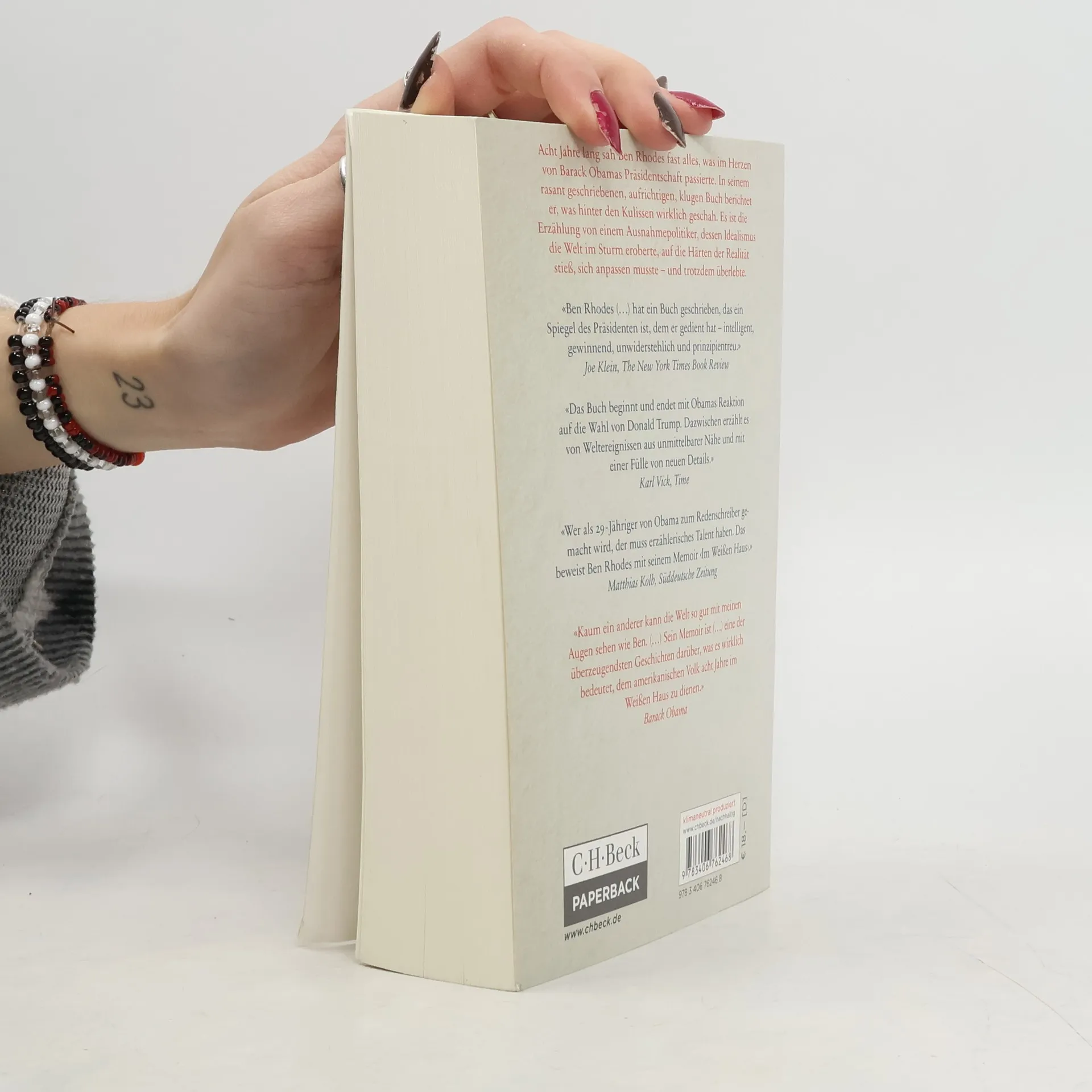 Acht Jahre lang sah Ben Rhodes fast alles, was im Herzen von Barack Obamas Präsidentschaft passierte. In seinem rasant geschriebenen, aufrichtigen, klugen Buch berichtet er, was hinter den Kulissen wirklich geschah. Es ist die Erzählung von einem Ausnahmepolitiker, dessen Idealismus die Welt im Sturm eroberte, auf die Härten der Realität stieß, sich anpassen musste - und trotzdem überlebte. Mit 29 Jahren und einem Sack voll Hoffnung stößt Ben Rhodes 2007 zum Team von Barack Obama und wird zu einem seiner engsten Vertrauten. Er ist mittendrin, als das Atomabkommen mit dem Iran ausgehandelt wird, als die Annäherung an Kuba eingeleitet wird, als die Entscheidung fällt, in Syrien nicht zu intervenieren, und als die Wahl von Donald Trump das Projekt Obama jäh beendet. Ben Rhodes schildert grandios die Dramen dieser Präsidentschaft, die Konflikte, in die Obama geriet, und die Grenzen des Machbaren, auf die er traf - selten hat man einen so intimen, luziden Einblick in die inneren Gesetze der Politik bekommen. Wir sehen Barack Obama aus nächster Nähe, mit seiner großen Persönlichkeit, seinem scharfen Verstand, seinen Träumen und Zweifeln, seinem Charisma und Charme. Ein einzigartiges Zeitdokument und ein Lehrstück darüber, was in der Politik möglich ist.