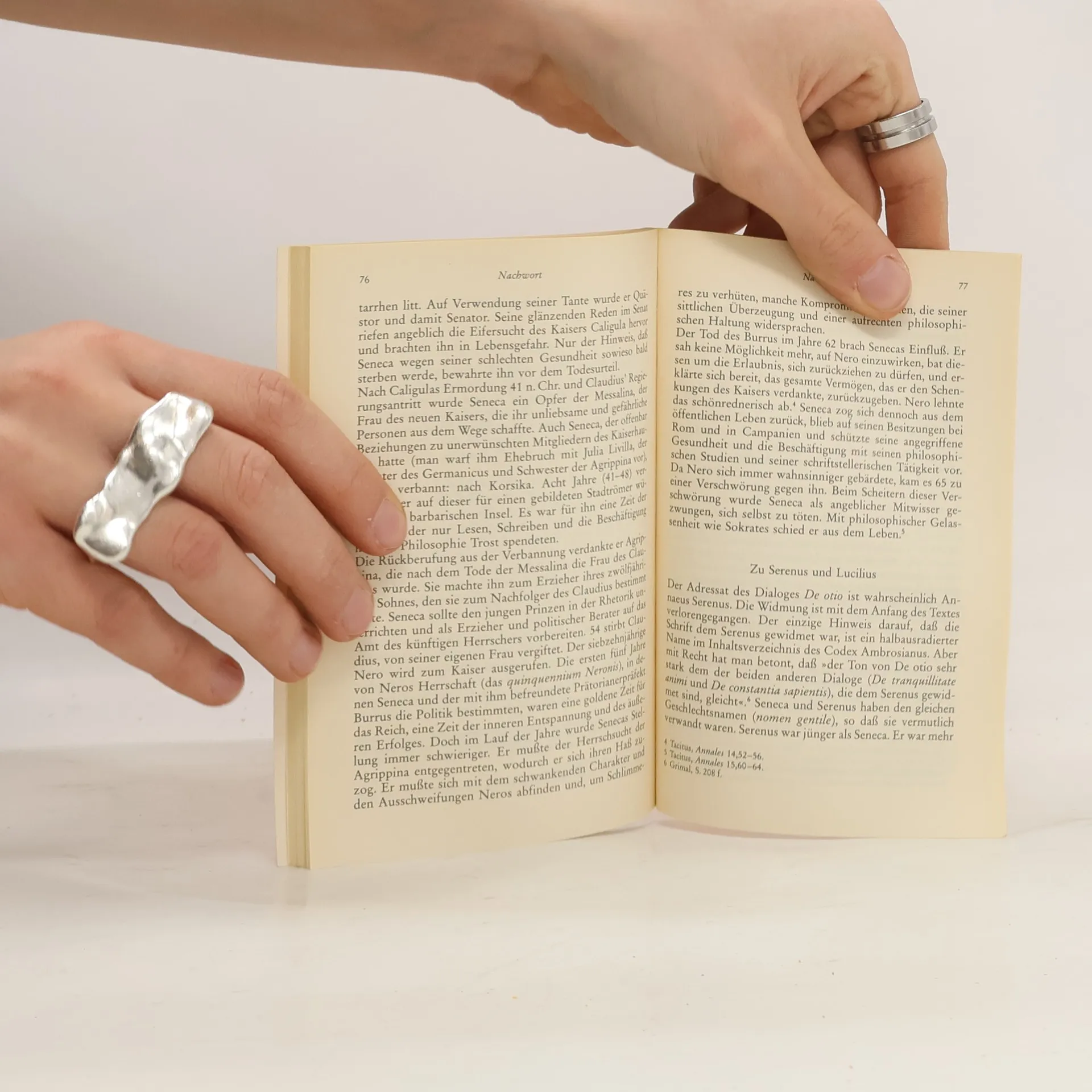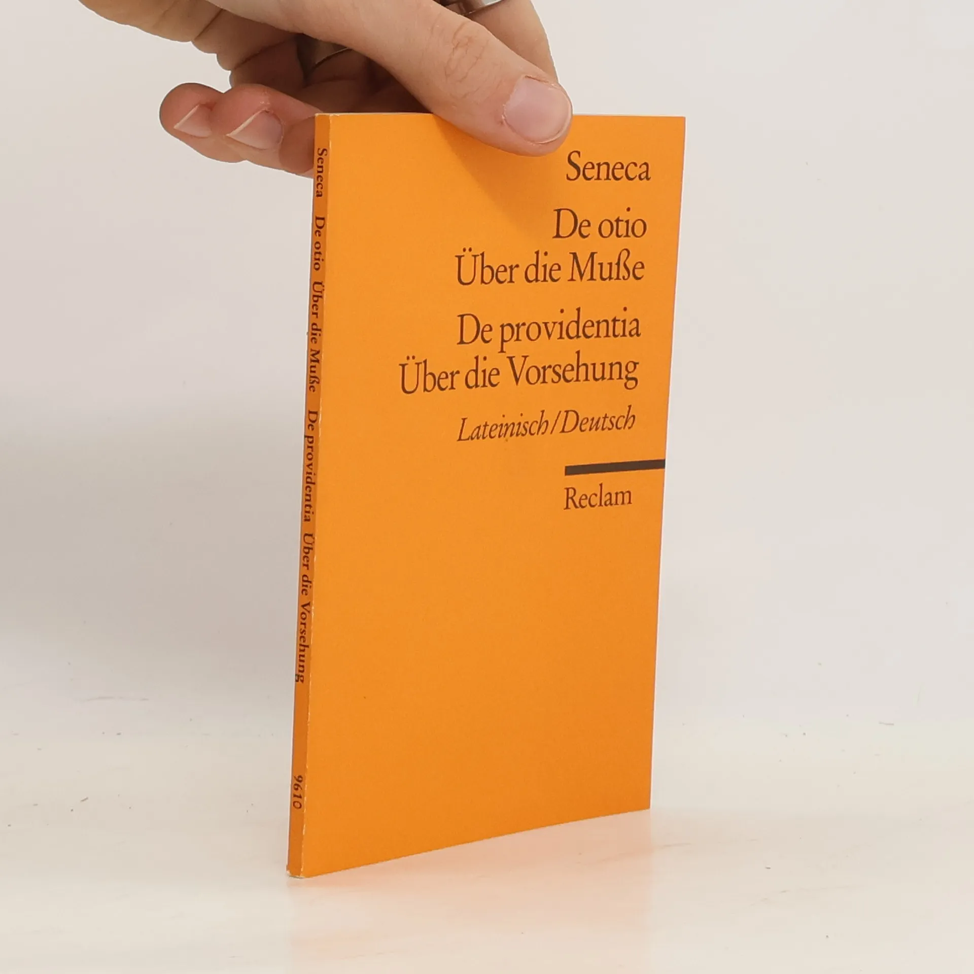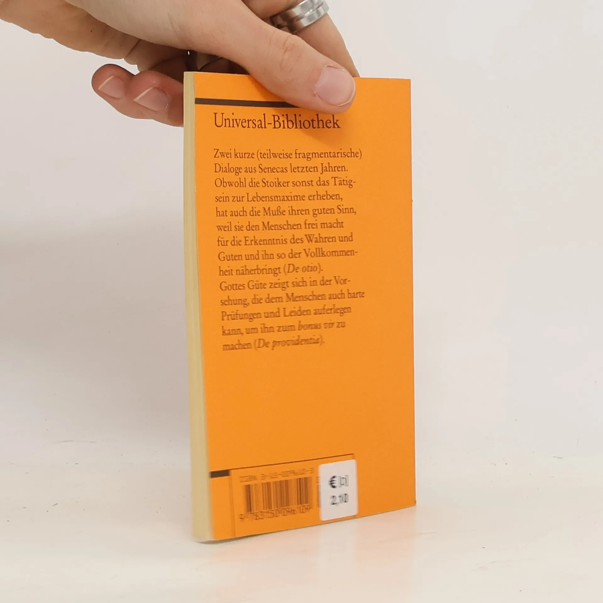 Zwei kurze (teilweise fragmentarische) Dialoge aus Senecas letzten Jahren. Obwohl die Stoiker sonst das Tätigsein zur Lebensmaxime erheben, hat auch die Muße ihren guten Sinn, weil sie den Menschen frei macht für die Erkenntnis des Wahren und Guten und ihn so der Vollkommenheit näherbringt (»De otio«). Gottes Güte zeigt sich in der Vorsehung, die dem Menschen auch harte Prüfungen und Leiden auferlegen kann, um ihn zum »bonus vir« zu machen (»De providentia«). Sprachen: Deutsch, Latein