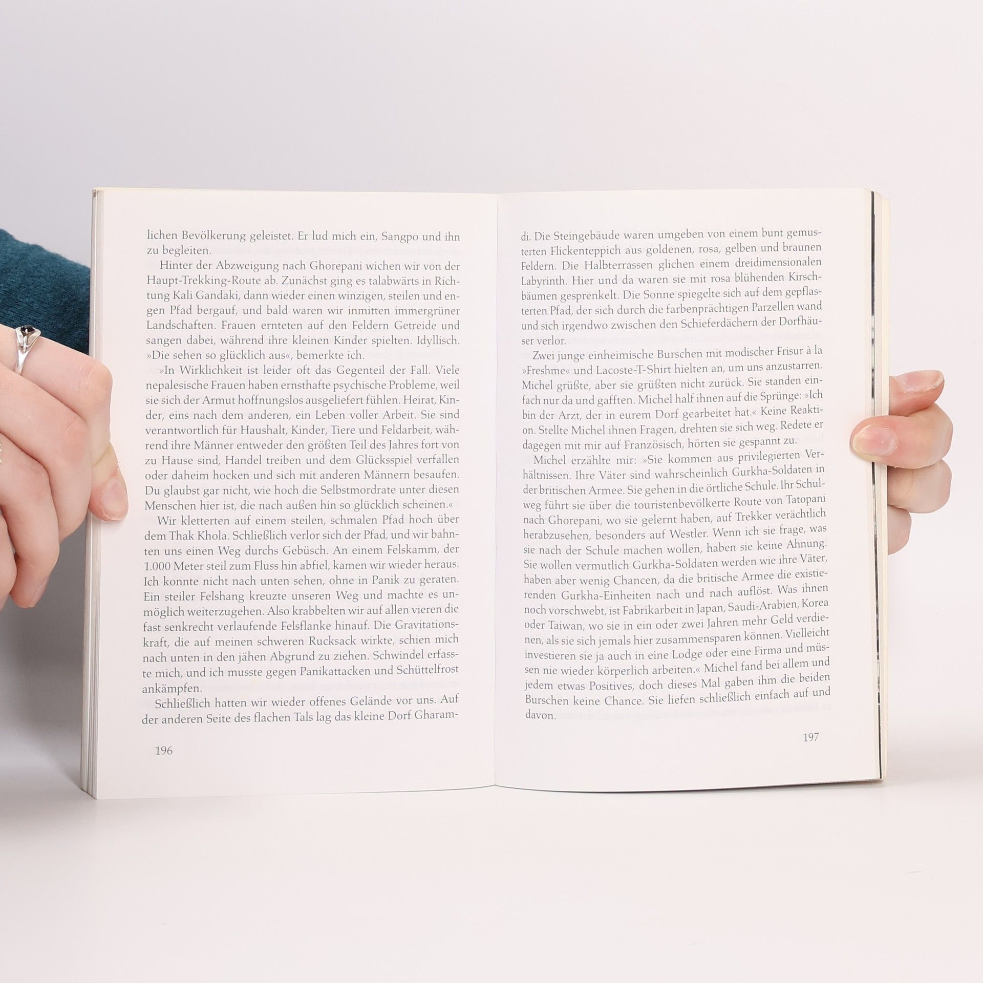 Anfangs hat er große Schwierigkeiten mit der Höhenkrankheit und seinem schweren Rucksack, doch allmählich lebt er sich ein, schließt Freundschaften, die ihm weiterhelfen, körperlich wie auch spirituell. Denn in einer so außergewöhnlichen Natur mit seinen freundlichen, tief gläubigen Menschen öffnet sich einem das Herz, tiefe Gedanken sind möglich. Mehr und mehr wandert er allein, hält sich von den Touristen fern, freundet sich mit Nepalesen an, versucht ihre Lebensart und Lebensweise zu verstehen und kann aus der Distanz das hektische Leben der westlichen Welt mit der Gier nach Luxus und Perfektion kritisch betrachten. Ganz allmählich wird die Reise zu einer inneren Reise. Angenehm bei diesem Bericht ist, dass der Autor sich nicht für etwas Besonderes hält und sich ganz von seiner Herkunft aus der westlichen Welt zu distanzieren versucht - ein Grundübel vieler Fernreisender. Er ist Tourist wie jeder andere auch, und so erfreut er sich bei aller Kritik am übertriebenen Luxus der westlichen Welt durchaus auch an einer heißen Dusche oder einem komfortablen Bett. Ein amüsanter aber auch nachdenklicher Bericht.