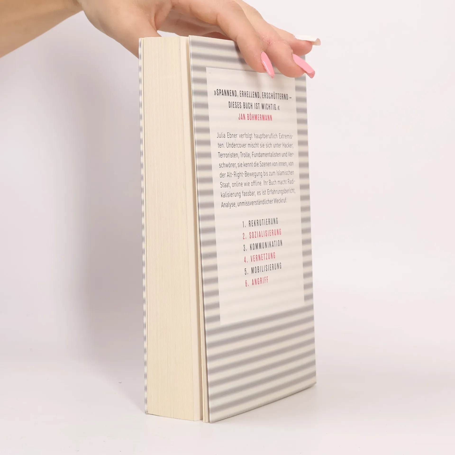 „Spannend, erhellend, erschütternd – dieses Buch ist wichtig.“ Jan Böhmermann Julia Ebner verfolgt hauptberuflich Extremisten. Undercover mischt sie sich unter Hacker, Terroristen, Trolle, Fundamentalisten und Verschwörer, sie kennt die Szenen von innen, von der Alt-Right-Bewegung bis zum Islamischen Staat, online wie offline. Ihr Buch macht Radikalisierung fassbar, es ist Erfahrungsbericht, Analyse, unmissverständlicher Weckruf. Als Extremismusforscherin stellen sich ihr folgende Fragen: Wie rekrutieren, wie mobilisieren Extremisten ihre Anhänger? Was ist ihre Vision der Zukunft? Mit welchen Mitteln wollen sie diese Vision erreichen? Um Antworten zu finden, schleust sich Julia Ebner ein in zwölf radikale Gruppierungen quer durch das ideologische Spektrum. Sozusagen von der anderen Seite beobachtet sie Planungen terroristischer Anschläge, Desinformationskampagnen, Einschüchterungsaktionen, Wahlmanipulationen. Sie erkennt, Radikalisierung folgt einem klaren Skript: Rekrutierung, Sozialisierung, Kommunikation, Mobilisierung, Angriff.