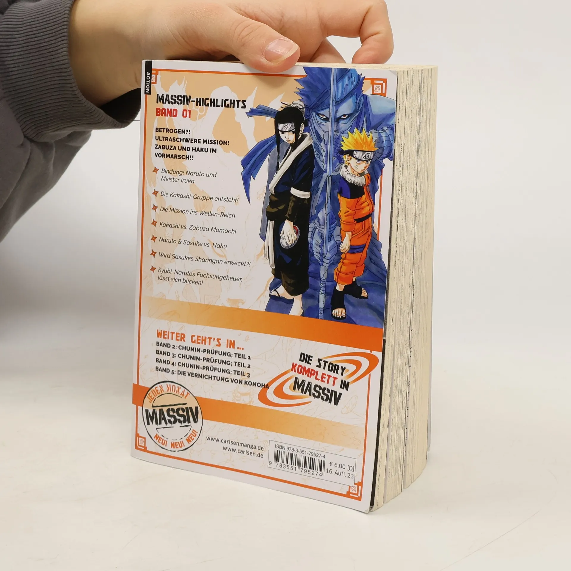Erlebe atemberaubende Abenteuer und Ninja-Action mit NARUTO! Jetzt als tolle Sammelbandedition mit insgesamt 24 Bänden im größeren Format und neuen Covermotiven! Naruto ist ein berüchtigter Tunichtgut in seinem Dorf, das fast ausschließlich aus Ninja besteht. Er liebt Nudelsuppe und spielt anderen gern Streiche. So ist es kein Wunder, dass er nicht gerade beliebt ist. Doch gerade deshalb will er der beste Ninja seines Dorfes werden. Zu diesem Zweck gehen er und seine Mitschüler Sasuke und Sakura beim großen Meister Kakashi in die Lehre... Band 1 der Naruto-Massiv Reihe enthält die Kapitel 1 - 33. Für Fans von One Piece, My Hero Academia, Demon Slayer, Jujutsu Kaisen, Dragon Ball, Dr. Stone und Fairy Tail! Massiv-Highlights in Band 1: - Bindung! Naruto und Meister Iruka - Die Kakashi-Gruppe entsteht! - Die Mission ins Wellenreich - Kakashi vs. Zabuza Momochi - Naruto & Sasuke vs. Haku - Wird Sasukes Sharingan erweckt?! - Kyubi, Narutos Fuchsungeheuer, lässt sich blicken!