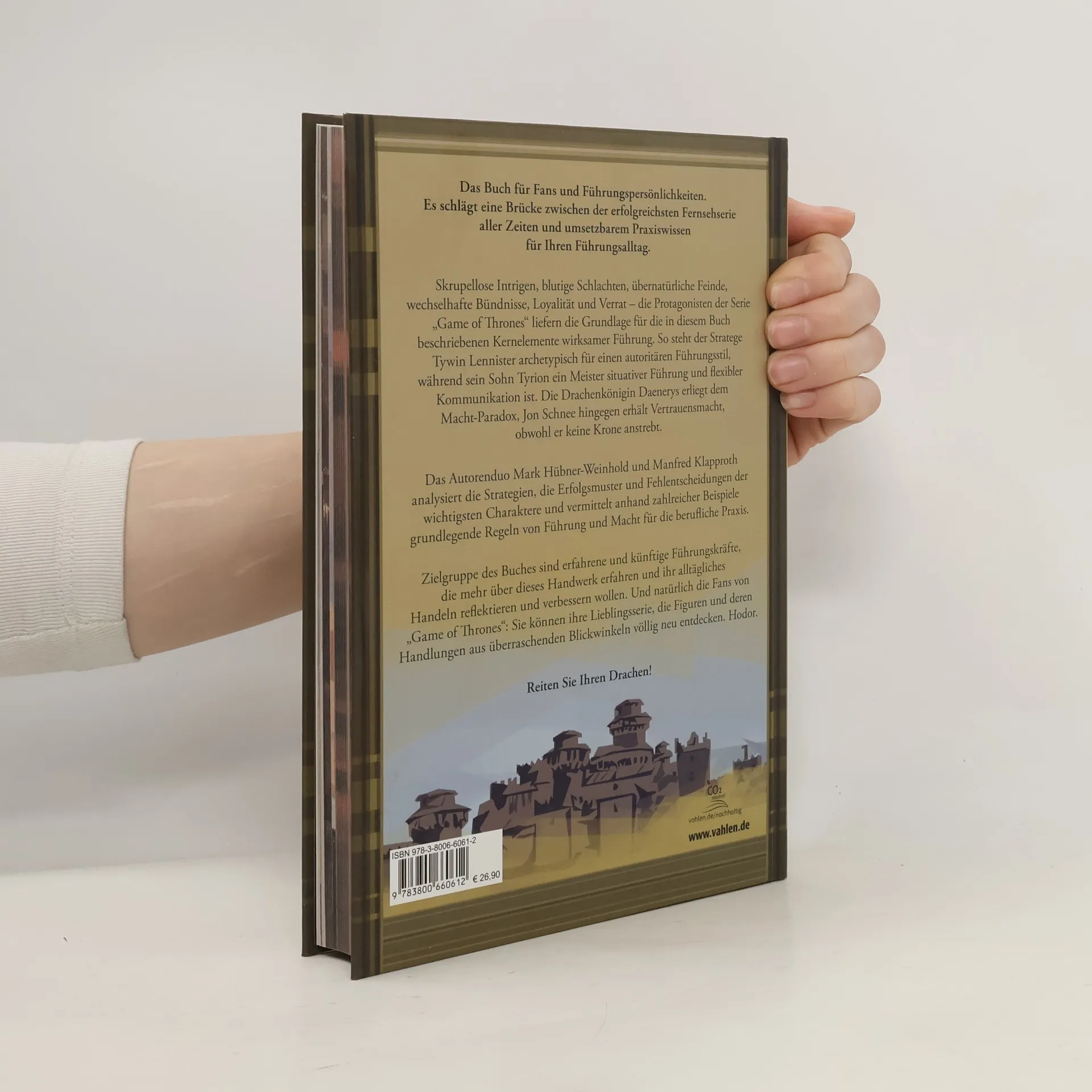 Das Buch für Fans und Führungspersönlichkeiten. Es schlägt eine Brücke zwischen der erfolgreichsten Fernsehserie aller Zeiten und umsetzbarem Praxiswissen für Ihren Führungsalltag. Skrupellose Intrigen, blutige Schlachten, übernatürliche Feinde, wechselhafte Bündnisse, Loyalität und Verrat – die Protagonisten der Serie „Game of Thrones“ liefern die Grundlage für die in diesem Buch beschriebenen Kernelemente wirksamer Führung. So steht der Stratege Tywin Lennister archetypisch für einen autoritären Führungsstil, während sein Sohn Tyrion ein Meister situativer Führung und flexibler Kommunikation ist. Die Drachenkönigin Daenerys erliegt dem Macht-Paradox, Jon Schnee hingegen erhält Vertrauensmacht, obwohl er keine Krone anstrebt. Das Autorenduo Mark Hübner-Weinhold und Manfred Klapproth analysiert die Strategien, die Erfolgsmuster und Fehlentscheidungen der wichtigsten Charaktere und vermittelt anhand zahlreicher Beispiele grundlegende Regeln von Führung und Macht für die berufliche Praxis. Zielgruppe des Buches sind erfahrene und künftige Führungskräfte, die mehr über dieses Handwerk erfahren und ihr alltägliches Handeln reflektieren und verbessern wollen. Und natürlich die Fans von „Game of Thrones“: Sie können ihre Lieblingsserie, die Figuren und deren Handlungen aus überraschenden Blickwinkeln völlig neu entdecken. Hodor. Reiten Sie Ihren Drachen!