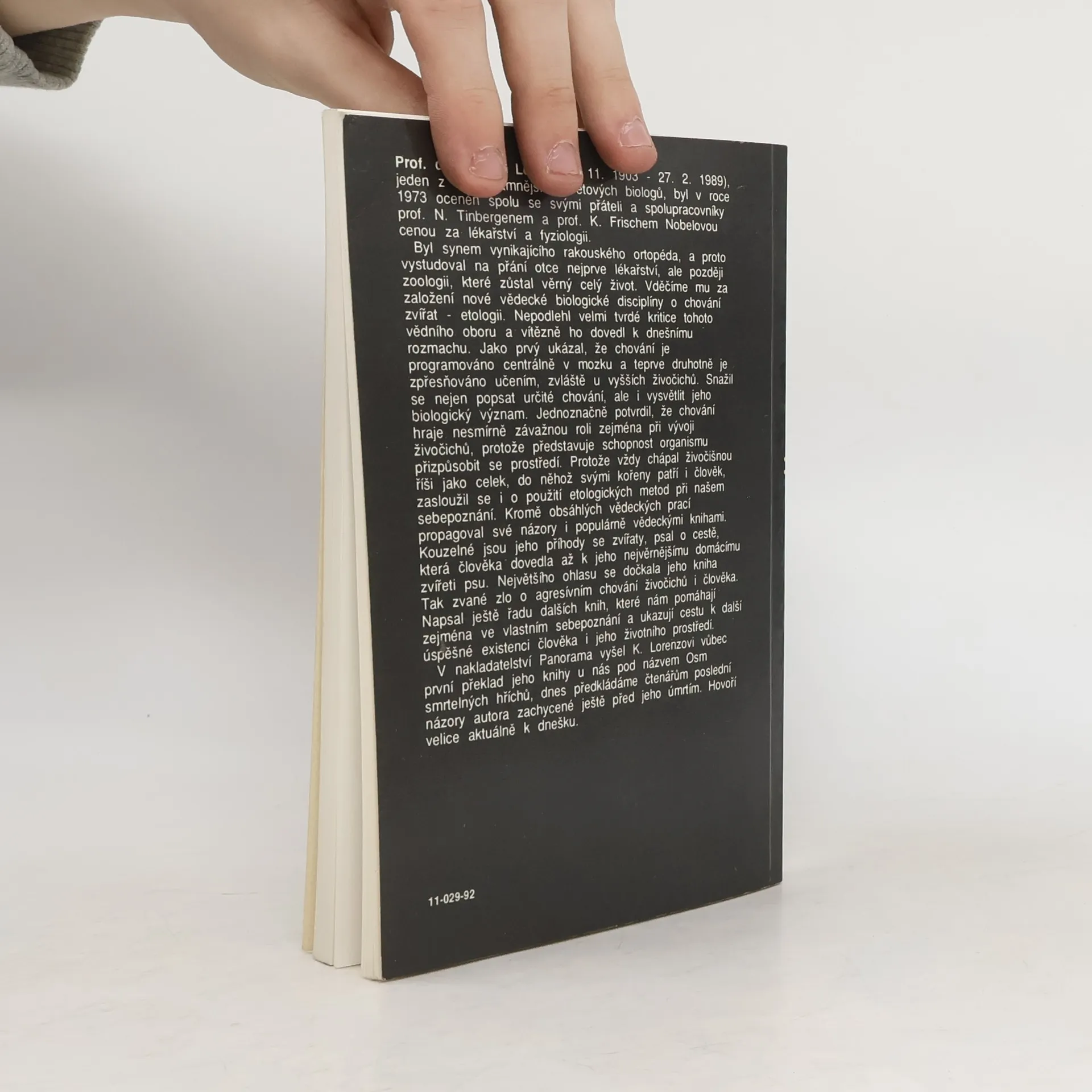 Rozhovory rakouského biologa, filmaře a spisovatele s nositelem Nobelovy ceny Konradem Lorenzem. V knize je zmapován životopis K. Lorenze a v jednotlivých rozhovorech se seznámíme s názory a pohledy vynikajícího vědce na otázky, které si dnes musí klást každý člověk. Doslov Zdeněk Veselovský.