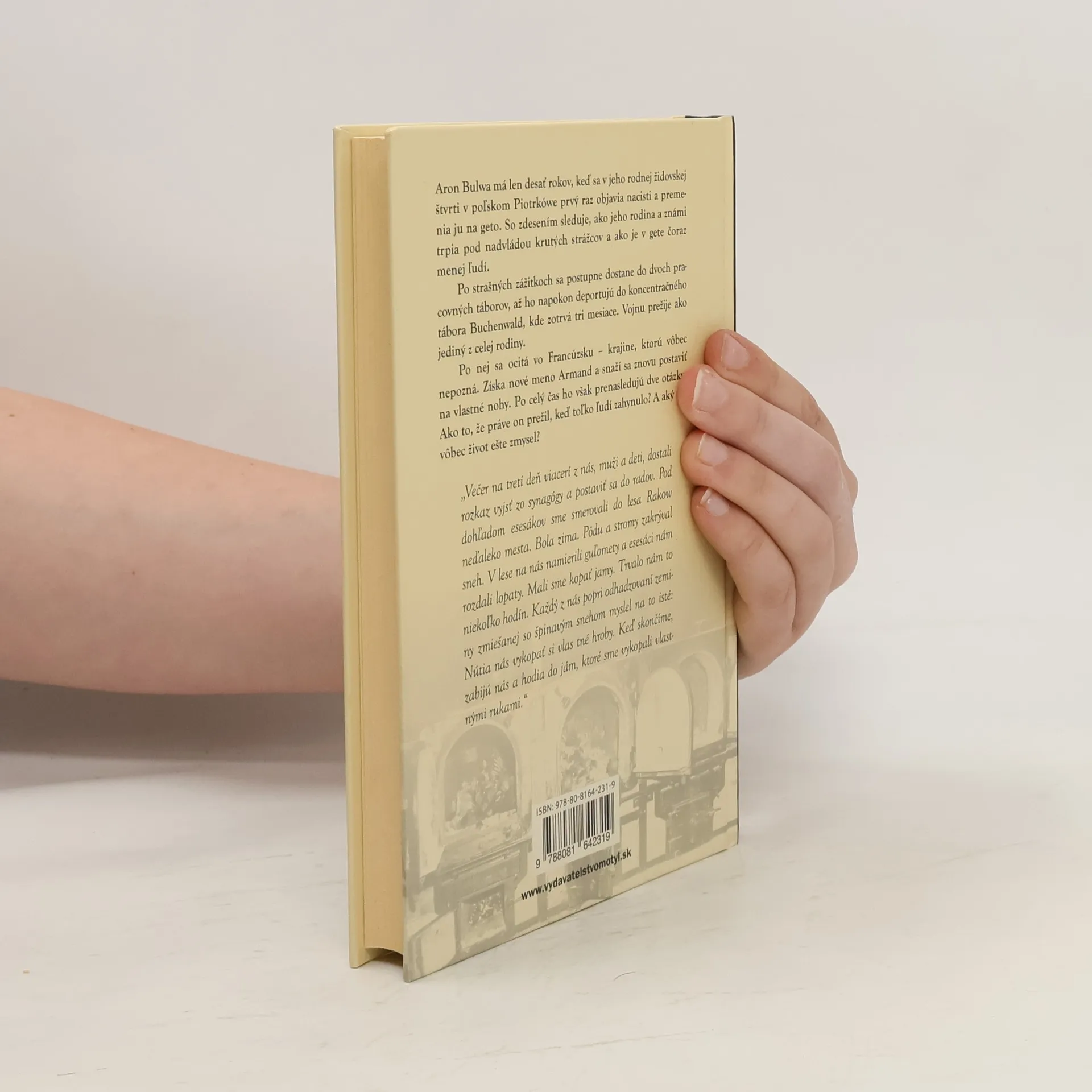 Aron Bulwa má len desať rokov, keď sa v jeho rodnej židovskej štvrti v poľskom Piotrkówe prvý raz objavia nacisti a premenia ju na geto. So zdesením sleduje, ako jeho rodina a známi trpia pod nadvládou krutých strážcov a ako je v gete čoraz menej ľudí. Po strašných zážitkoch sa postupne dostane do dvoch pracovných táborov, až ho napokon deportujú do koncentračného tábora Buchenwald, kde zotrvá tri mesiace. Vojnu prežije ako jediný z celej rodiny. Po nej sa ocitá vo Francúzsku - krajine, ktorú vôbec nepozná. Získa nové meno Armand a snaží sa znovu postaviť na vlastné nohy. Po celý čas ho však prenasledujú dve otázky: Ako to, že práve on prežil, keď toľko ľudí zahynulo? A aký má vôbec život ešte zmysel? „Večer na tretí deň viacerí z nás, muži a deti, dostali rozkaz vyjsť zo synagógy a postaviť sa do radov. Pod dohľadom esesákov sme smerovali do lesa Rakow neďaleko mesta. Bola zima. Pôdu a stromy zakrýval sneh. V lese na nás namierili guľomety a esesáci nám rozdali lopaty. Mali sme kopať jamy. Trvalo nám to niekoľko hodín. Každý́ z nás popri odhadzovaní zeminy zmiešanej so špinavým snehom myslel na to iste: Nútia nás vykopať si vlastne hroby. Keď skončime, zabijú nás a hodia do jám, ktoré sme vykopali vlastnými rukami."