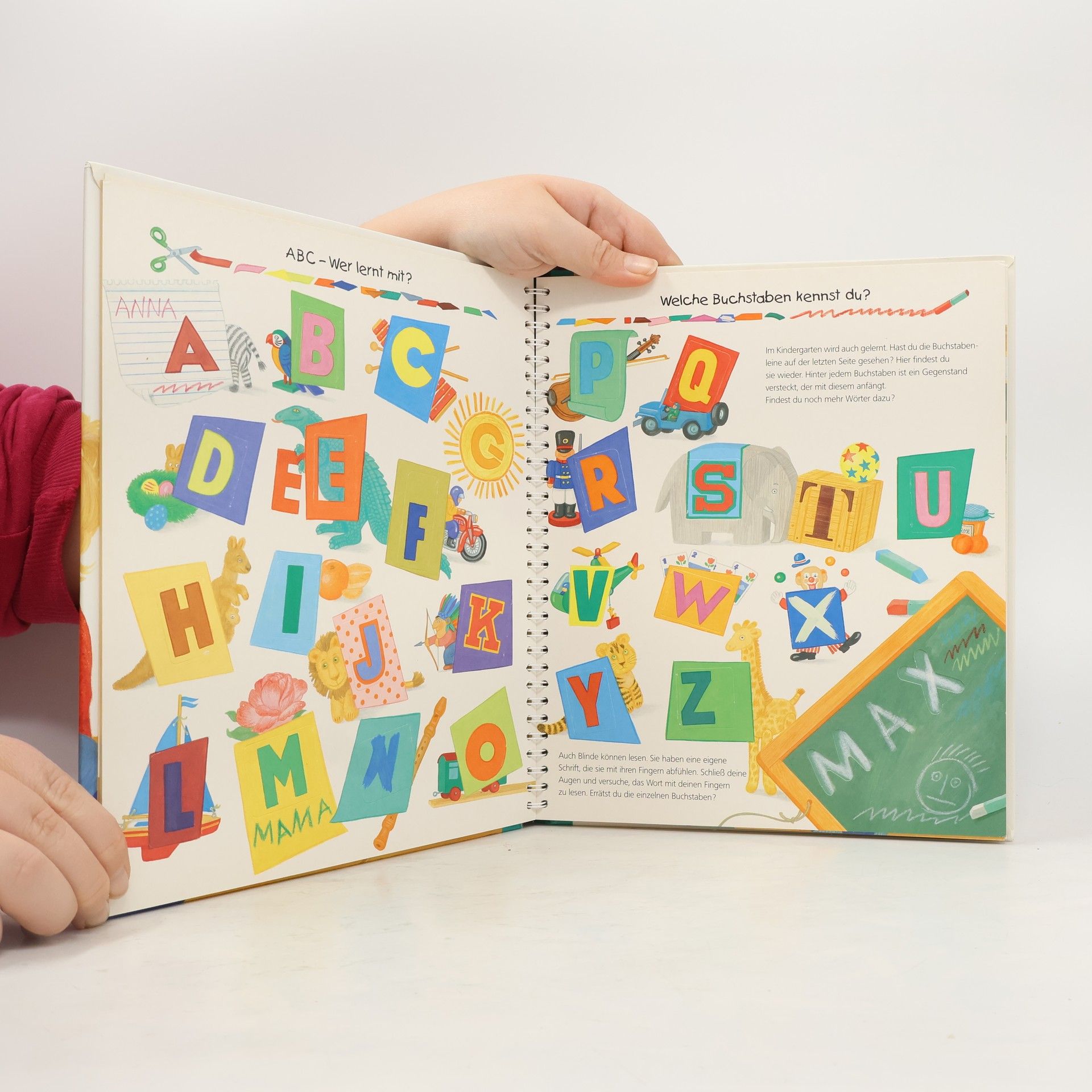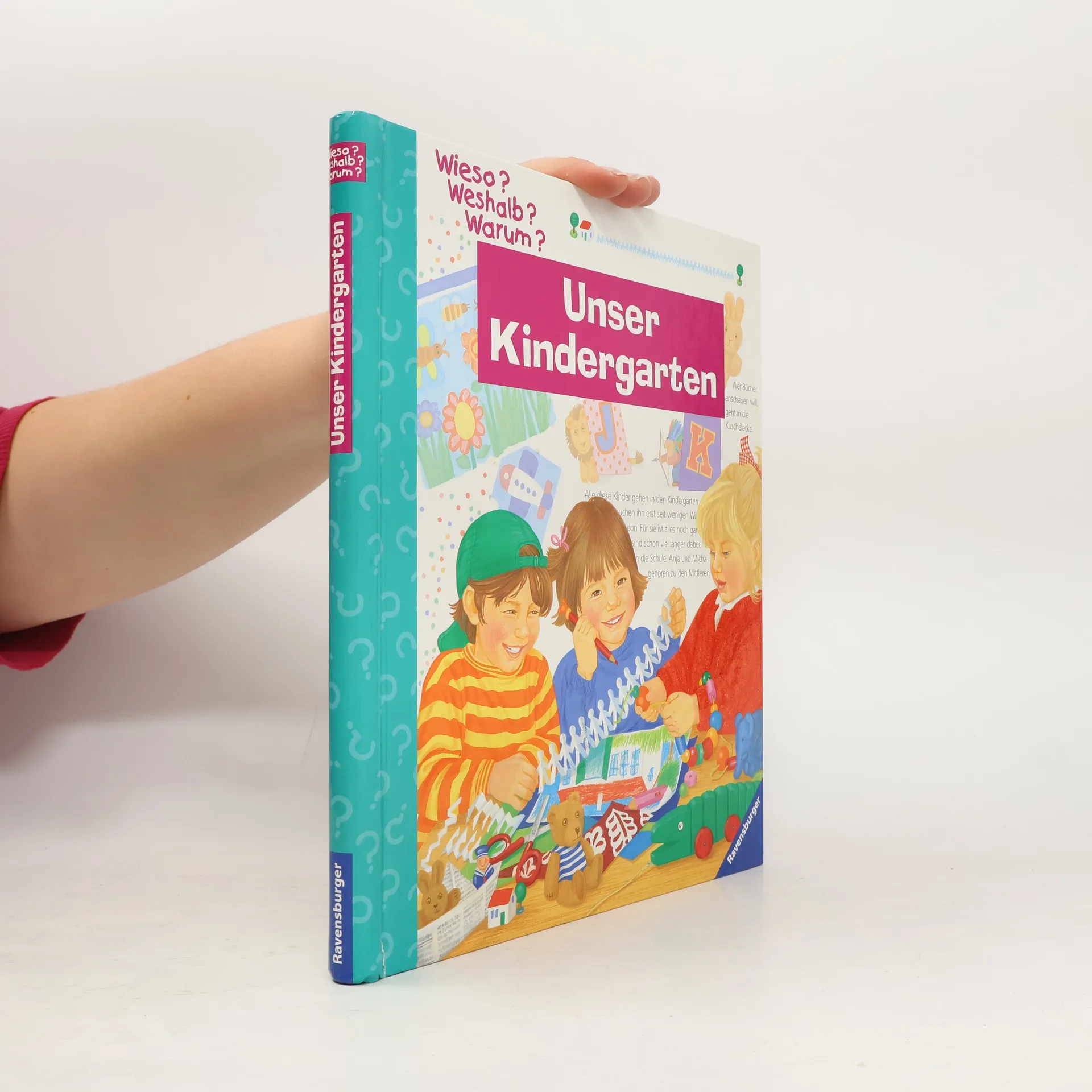 In einem Kindergarten ist immer etwas los. Das Buch führt durch den Alltag und vermittelt durch Klappen allererste Lerninhalte, wie das spielerische Erleben und Kennenlernen vom ABC.