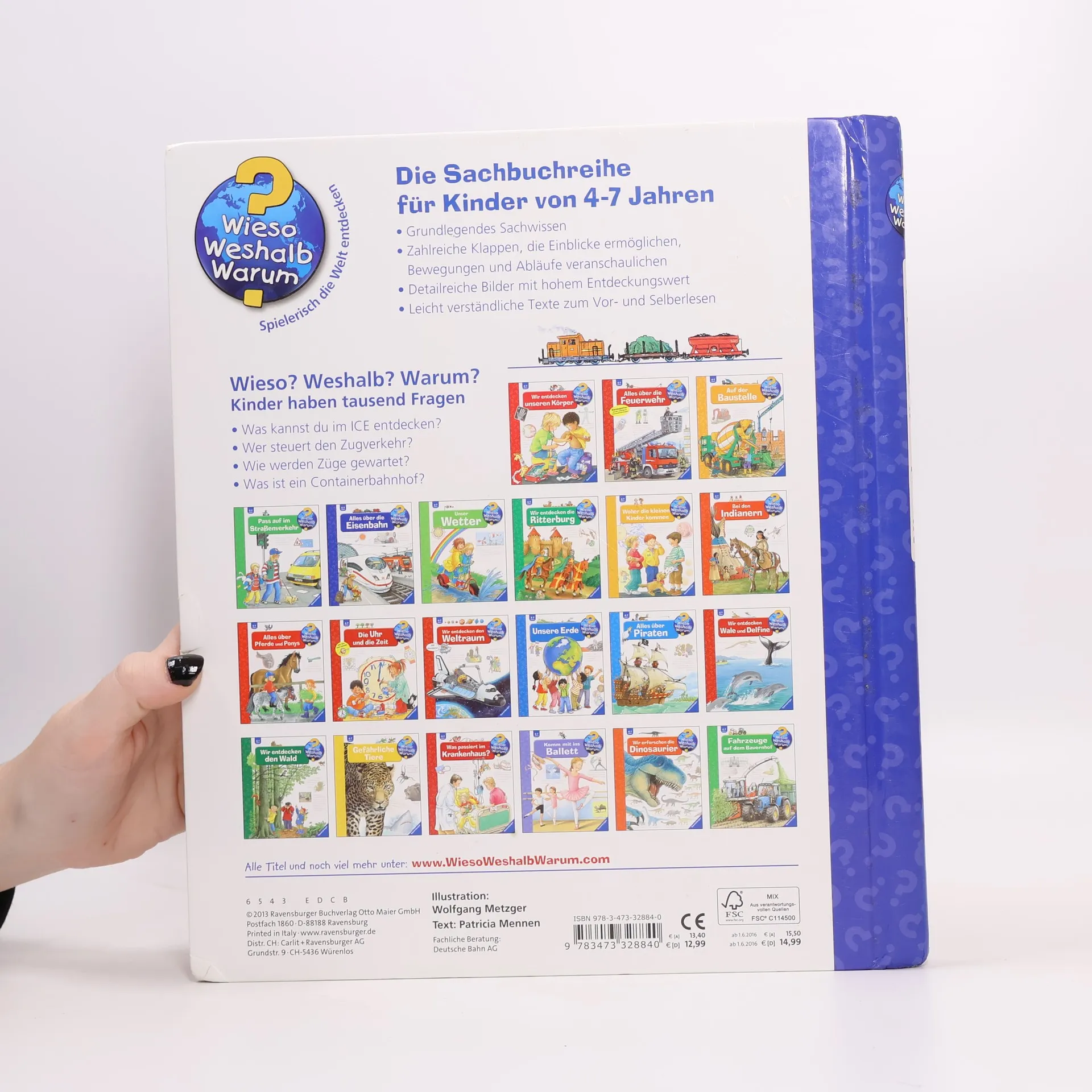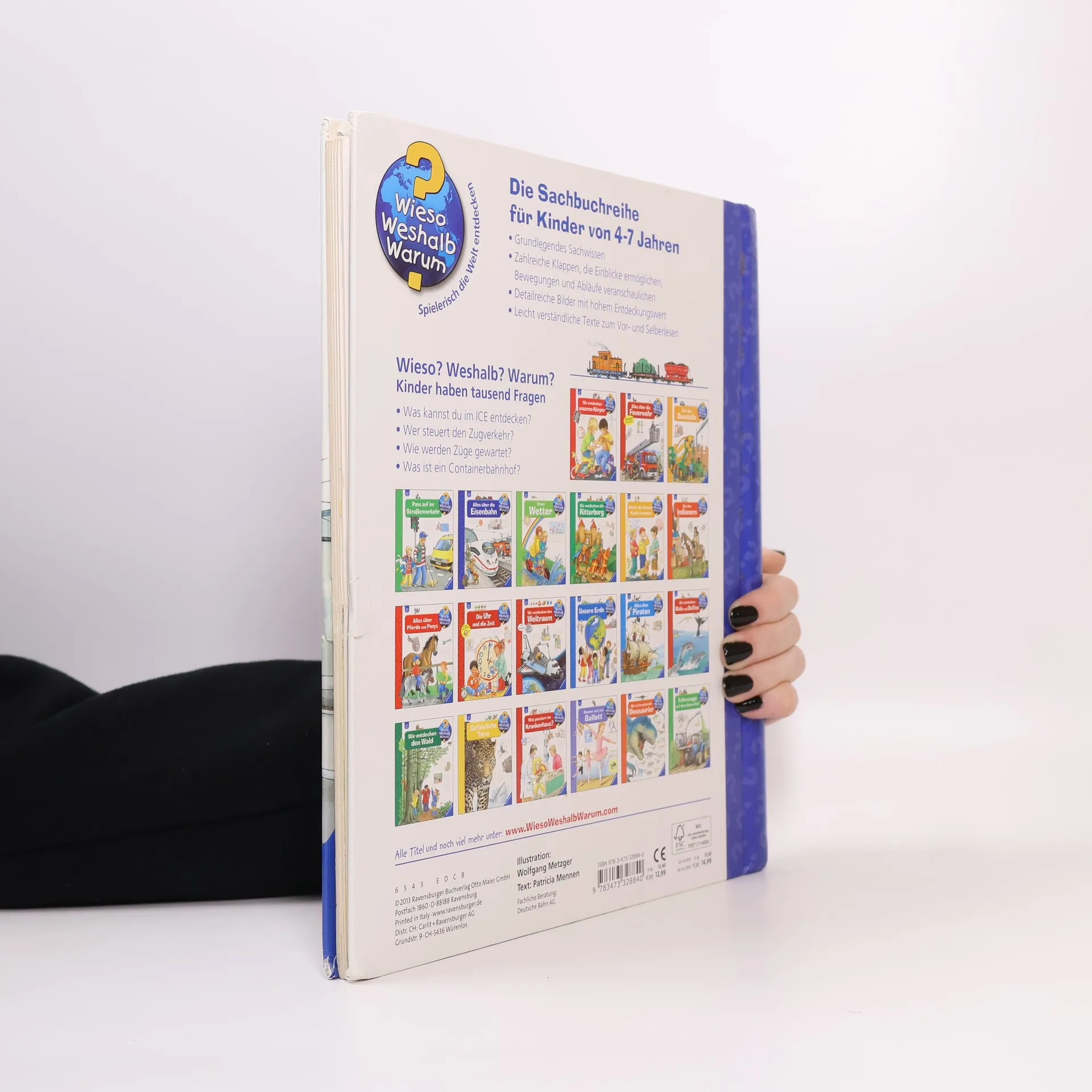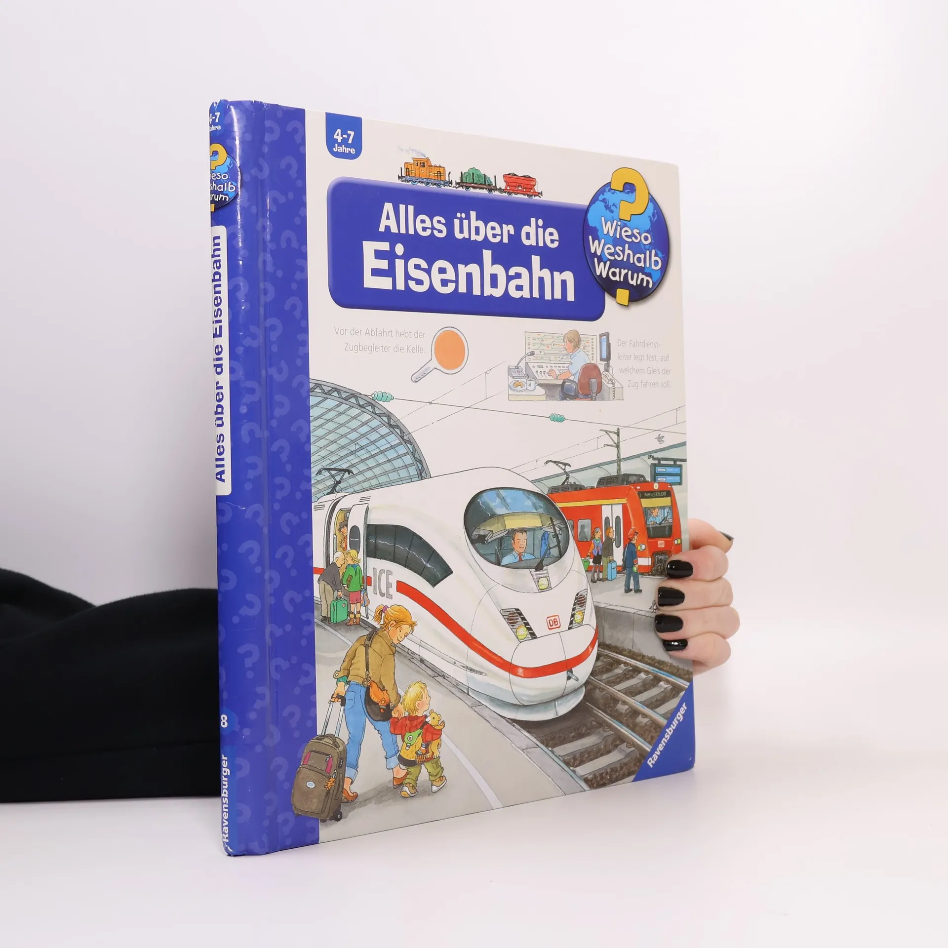 Zugfahren ist für Kinder immer ein besonderes Erlebnis. Alles wird zum Abenteuer: der Kauf der Fahrkarte, das Einfahren des Zuges, das Einsteigen, die Begegnung mit dem Zugbegleiter und der Blick aus dem Fenster. Es gibt so viel zu entdecken! Was passiert am Bahnhof? Wie sieht es im ICE aus? Wieso gibt es Signale und Weichen? Das Grundlagenwerk für kleine Eisenbahnfans beantwortet diese und noch viele weitere Fragen ganz anschaulich – und mit vielen Klappen. Wieso? Weshalb? Warum? Die Sachbuchreihe für Kinder von 4–7 Jahren Jeden Tag entdecken Kinder etwas Neues – da kommen viele Fragen auf. Warum sind die Dinosaurier ausgestorben? Wo ist die Sonne in der Nacht? Wozu brauchen wir das Blut? Die beliebte Sachbuchreihe Wieso? Weshalb? Warum? gibt Kindern Antworten auf Augenhöhe. Dabei werden die unterschiedlichsten Themen aus der Alltags- und Interessenswelt der Kinder altersgerecht und mit viel Liebe zum Detail unter die Lupe genommen. Detailreiche Bilder, verständliche Sachtexte und überraschende Klappen, die Bewegungen oder Abläufe veranschaulichen und hinter die Dinge blicken lassen, ermöglichen Kindern, sich ihre Themen selbst zu erschließen. Der Spaß am eigenhändigen Entdecken, die liebevolle Umsetzung und die qualitativ hochwertige Ausstattung garantieren langanhaltende Freude an jedem einzelnen Buch.