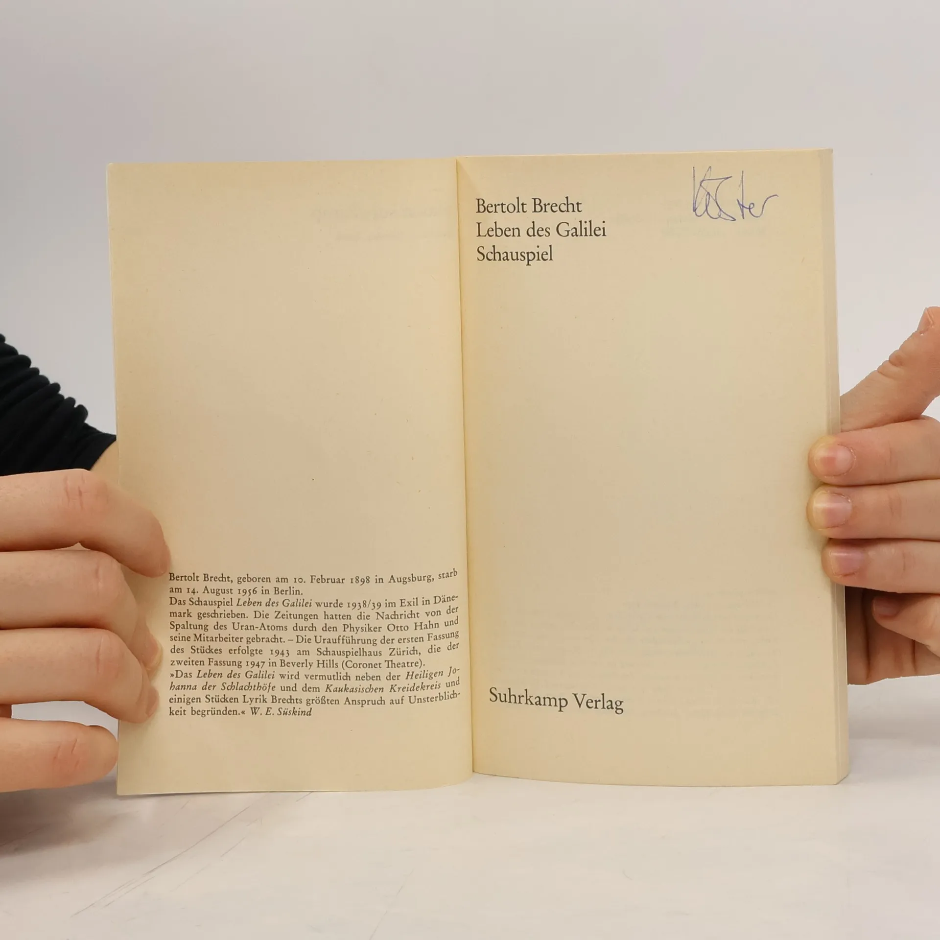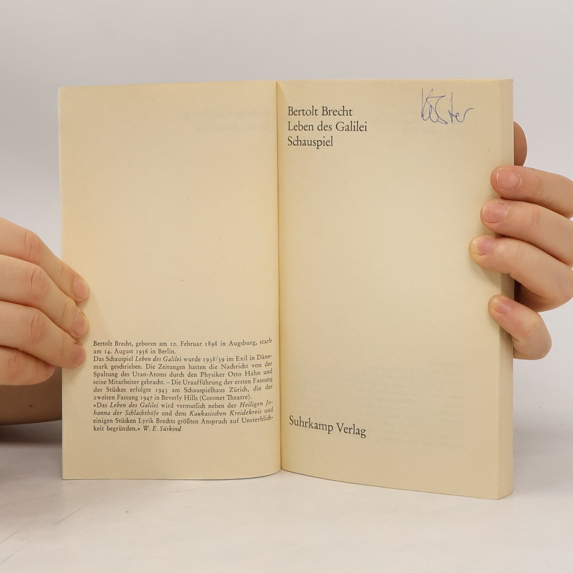 Das Schauspiel Leben des Galilei wurde 1938/39 im Exil in Dänemark geschrieben. Die Zeitungen hatten die Nachricht von der Spaltung des Uran-Atoms durch den Physiker Otto Hahn und seine Mitarbeiter gebracht. Die Uraufführung der ersten Fassung des Stückes erfolgte 1943 am Schauspielhaus Zürich, die der zweiten Fassung 1947 in Beverly Hills (Coronet Theatre). »Das Leben des Galilei wird vermutlich neben der Heiligen Johanna der Schlachthöfe und dem Kaukasischen Kreidekreis und einigen Stücken Lyrik Brechts größten Anspruch auf Unsterblichkeit begründen.« W. E. Süskind