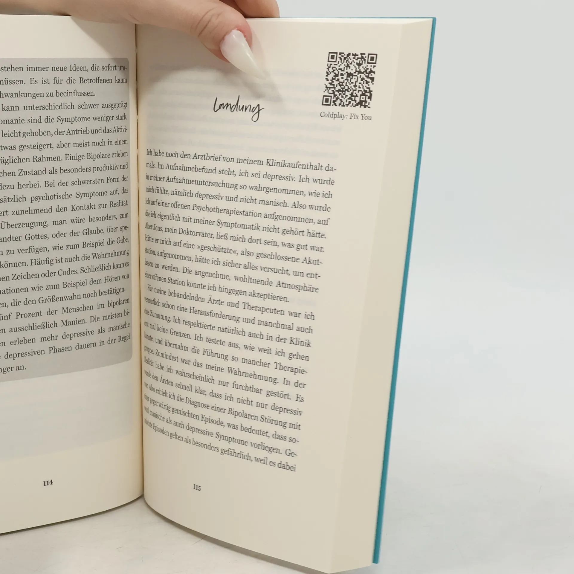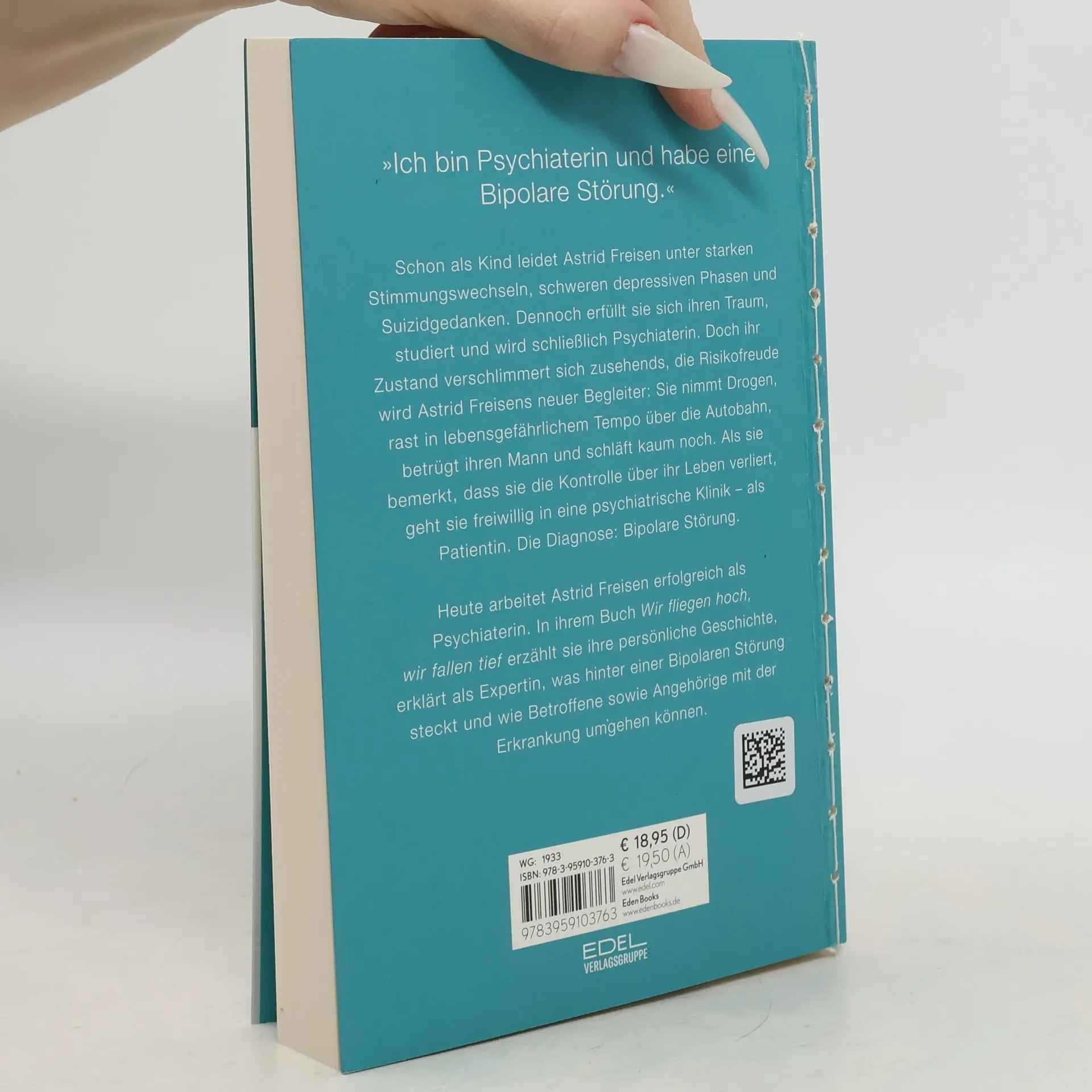 Bereits als Kind leidet Astrid Freisen unter Stimmungswechseln und Suizidgedanken. Dennoch schließt sie Schule und Studium erfolgreich ab und wird Psychiaterin. Doch plötzlich gerät ihr Leben ins Wanken und ihr Zustand verschlimmert sich. Sie wird immer unruhiger, redet ununterbrochen und gerät schließlich in eine unkontrollierbare Manie. Unter dem Einfluss extremer Risikofreude nimmt Astrid Freisen Drogen, rast mit dem Auto über die Autobahn, betrügt ihren Mann und schläft kaum noch. Als sie realisiert, dass sie dabei ist, die Kontrolle über ihr Leben zu verlieren, geht sie freiwillig in eine psychiatrische Klinik – als Patientin. Die Diagnose: Bipolare Störung. In ihrem Buch schreibt die Ärztin darüber, wie es ihr gelungen ist, sich Hilfe zu holen und eine Balance zwischen den manischen und depressiven Phasen zu finden. Heute arbeitet sie wieder als Psychiaterin und kann durch ihre Erfahrungen und Expertise auf eine ganz besondere Art auf ihre Patient*innen eingehen. Sie erzählt im Buch ihre persönliche Geschichte als Betroffene und erklärt als Expertin, was hinter der Krankheit steckt.