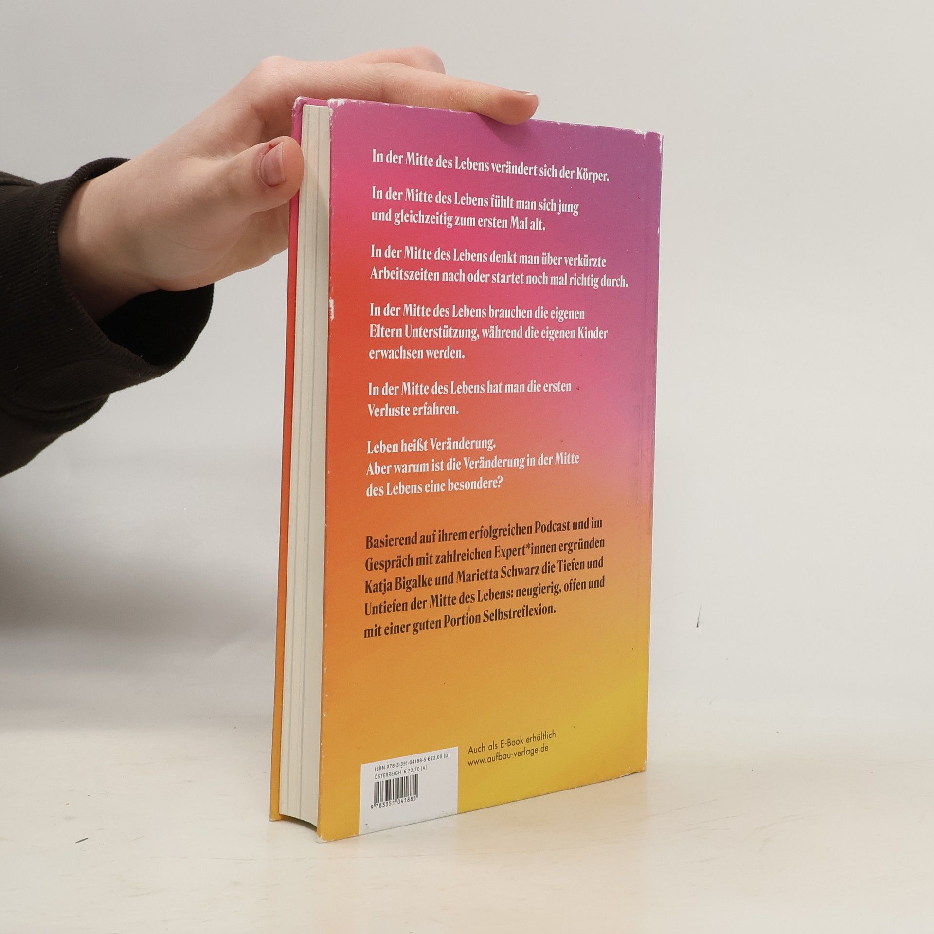 In der Mitte des Lebens verändert sich der Körper. In der Mitte des Lebens fühlt man sich nochmal jung und gleichzeitig zum ersten Mal alt. In der Mitte des Lebens denkt man über verkürzte Arbeitszeiten nach oder startet nochmal richtig durch. In der Mitte des Lebens brauchen die eigenen Eltern Unterstützung, während die eigenen Kinder erwachsen werden. In der Mitte des Lebens hat man die ersten Verluste erfahren. Leben heißt Veränderung. Aber warum ist die Veränderung in der Mitte des Lebens eine besondere? Basierend auf ihrem erfolgreichen Podcast und im Gespräch mit zahlreichen Expert*innen ergründen Katja Bigalke und Marietta Schwarz die Tiefen und Untiefen der Mitte des Lebens: Neugierig, offen und mit einer guten Portion Selbstreflexion.