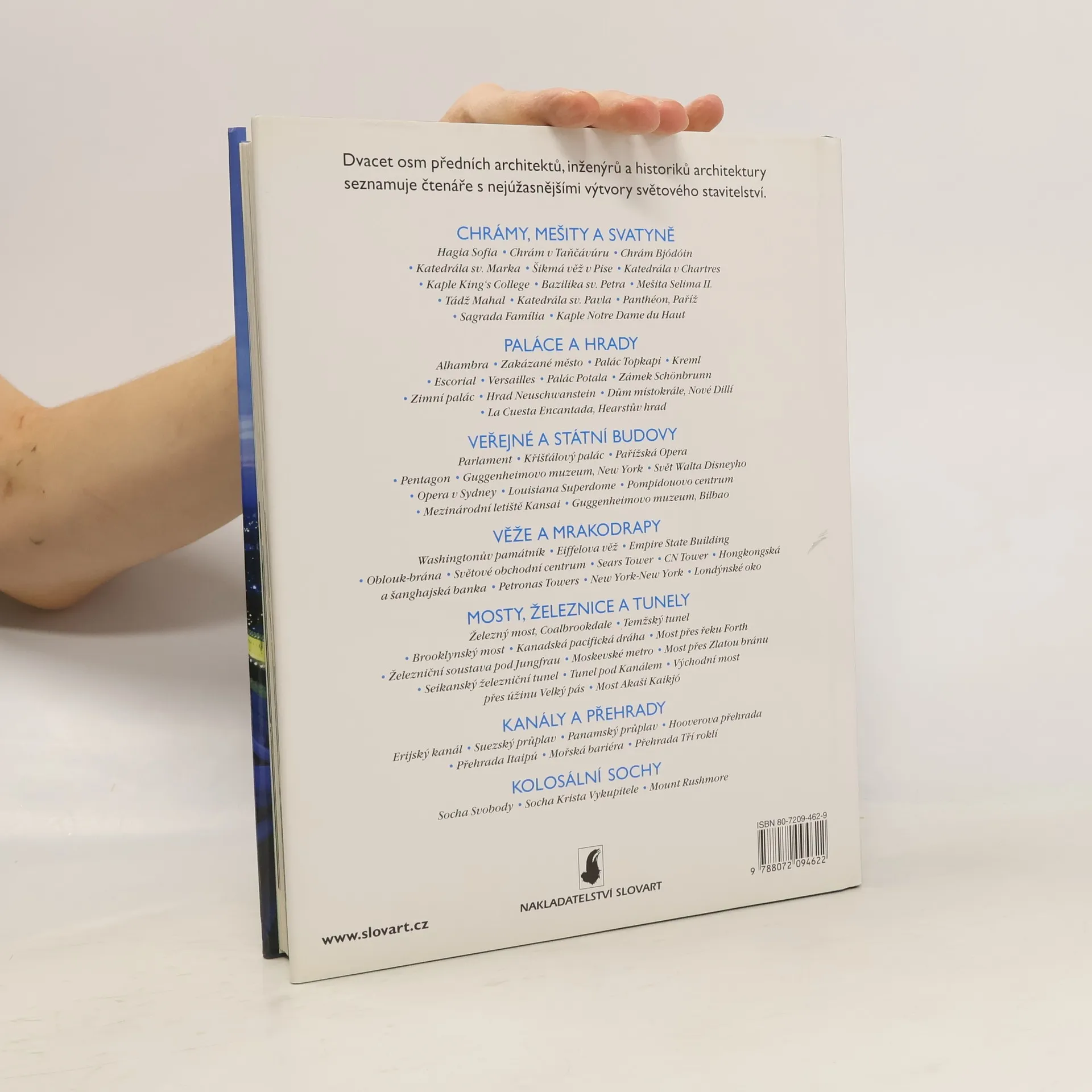 Dvacet osm předních světových architektů, inženýrů a historiků seznamuje čtenáře s nejúžasnějšími výtvory světového stavitelství (chrámy, mešity a svatyně, paláce a hrady, veřejné a státní budovy, věže a mrakodrapy, mosty, železnice a tunely, kanály a přehrady, kolosální sochy).