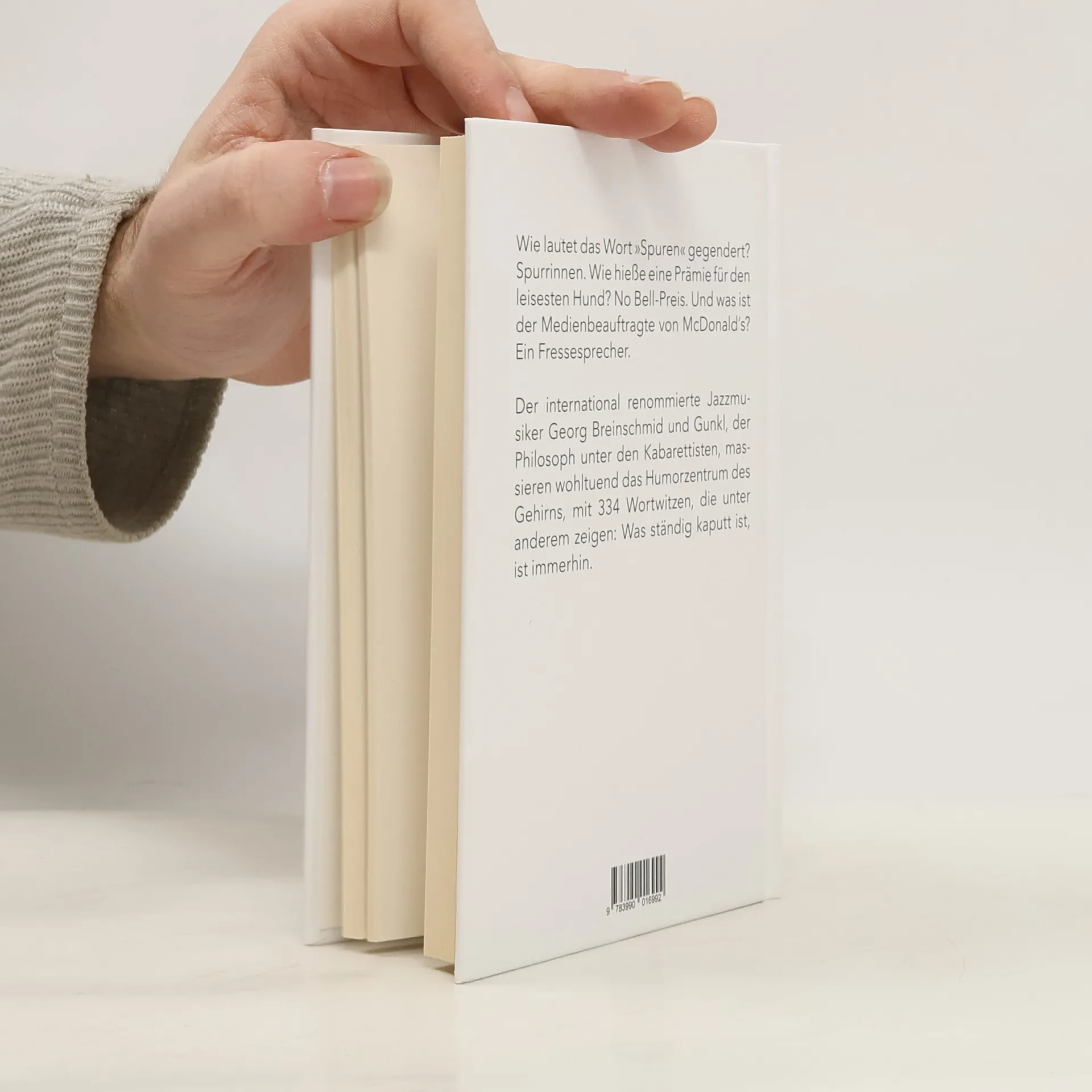 Wie lautet das Wort »Spuren« gegendert? Spurrinnen. Wie hieße eine Prämie für den leisesten Hund? No Bell-Preis. Und was ist der Medienbeauftragte von McDonald‘s? Ein Fressesprecher. Der international renommierte Jazzmusiker Georg Breinschmid und Gunkl, der Philosoph unter den Kabarettisten, massieren wohltuend das Humorzentrum des Gehirns, mit 334 Wortwitzen, die unter anderem zeigen: Was ständig kaputt ist, ist immerhin.