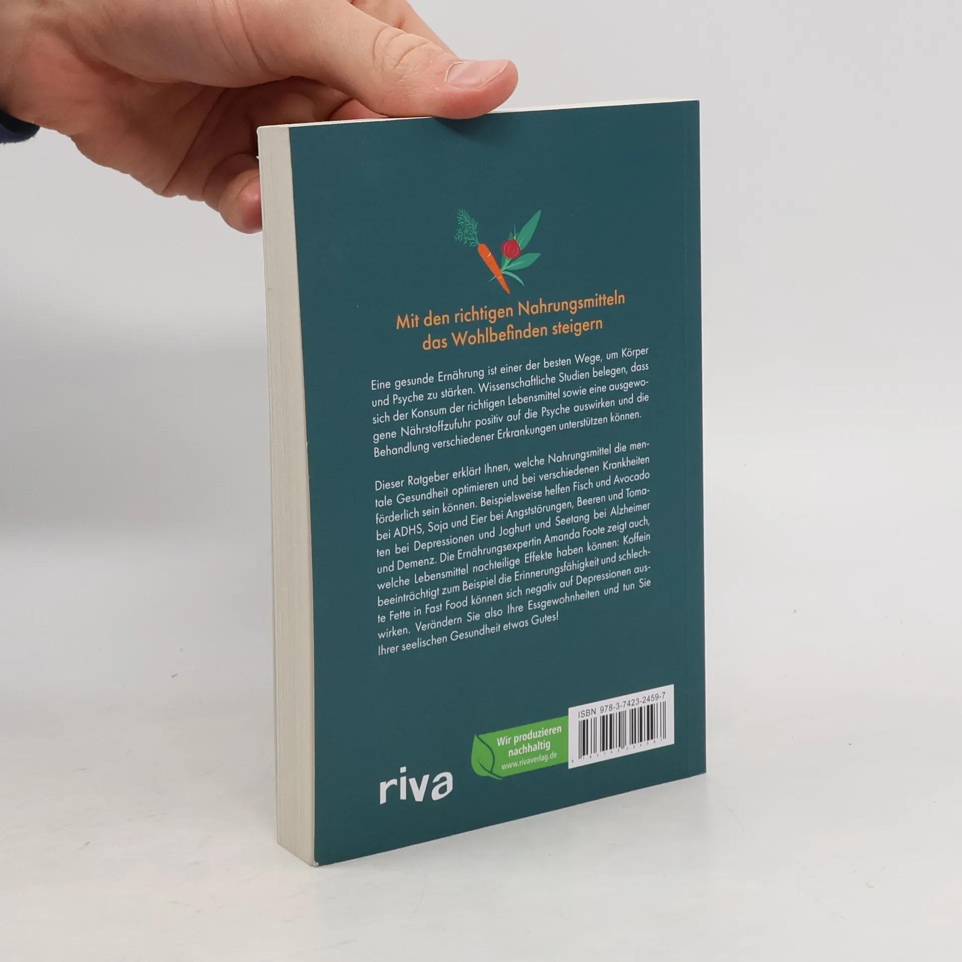 Mit den richtigen Nahrungsmitteln das Wohlbefinden steigern Eine gesunde Ernährung ist einer der besten Wege, um Körper und Psyche zu stärken. Wissenschaftliche Studien belegen, dass sich der Konsum der richtigen Lebensmittel sowie eine ausgewogene Nährstoffzufuhr positiv auf die Psyche auswirken und die Behandlung verschiedener Erkrankungen unterstützen können. Dieser Ratgeber erklärt Ihnen, welche Nahrungsmittel die mentale Gesundheit optimieren und bei verschiedenen Krankheiten förderlich sein können. Beispielsweise helfen Fisch und Avocado bei ADHS, Soja und Eier bei Angststörungen, Beeren und Tomaten bei Depressionen und Joghurt und Seetang bei Alzheimer und Demenz. Die Ernährungsexpertin Amanda Foote zeigt auch, welche Lebensmittel nachteilige Effekte haben können: Koffein beeinträchtigt zum Beispiel die Erinnerungsfähigkeit und schlechte Fette in Fast Food können sich negativ auf Depressionen auswirken. Verändern Sie also Ihre Essgewohnheiten und tun Sie Ihrer seelischen Gesundheit etwas Gutes!