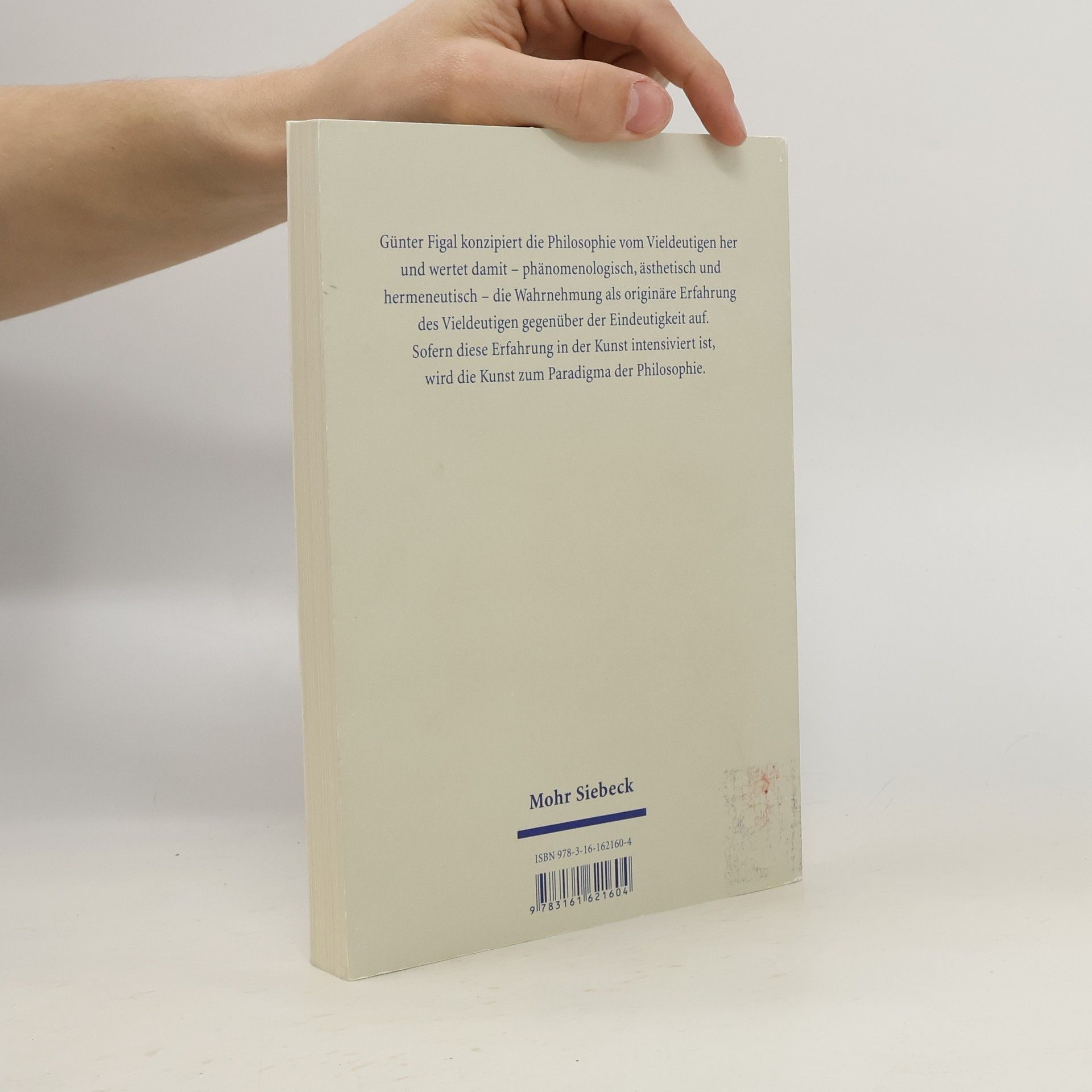 Günter Figal konzipiert die Philosophie vom Vieldeutigen her und wertet damit - phänomenologisch, ästhetisch und hermeneutisch - die Wahrnehmung als originäre Erfahrung des Vieldeutigen gegenüber der Eindeutigkeit auf. Sofern diese Erfahrung in der Kunst intensiviert ist, wird die Kunst zum Paradigma der Philosophie.