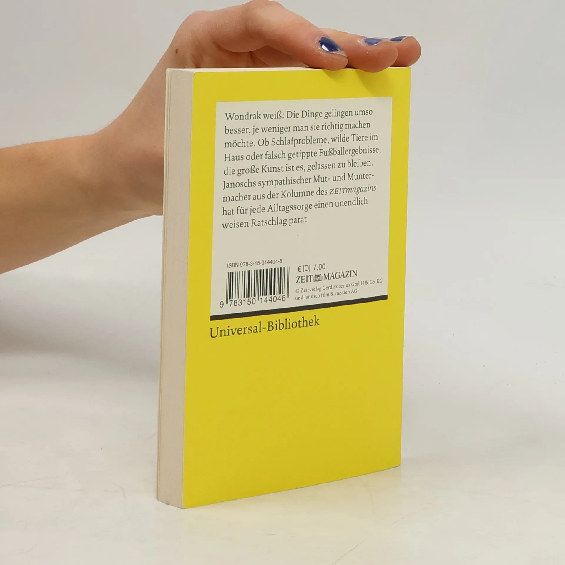 Entspannt durch’s Leben mit Wondrak Herr Wondrak weiß: Je weniger man Dinge richtig machen möchte, umso besser gelingen sie. Ob Schlafprobleme, wilde Tiere im Haus oder falsch getippte Fußballergebnisse – die große Kunst ist es, gelassen zu bleiben. Janoschs sympathischer Mutmacher aus der Kolumne des ZEITmagazins hat für jede Alltagssorge einen humorvollen Ratschlag parat. - Tipps für alle Lebenslagen: Der unendlich weise Alltagsheld aus der Kolumne des ZEITmagazins - Wondraks beste Lebensweisheiten: Mit den unverwechselbaren Illustrationen von Bestsellerautor Janosch und einem Nachwort von ZEITmagazin-Kolumnist Tillman Prüfer - Klassiker zum Sammeln: Ein neuer Janosch-Band in Reclams Universal-Bibliothek - Zum Verschenken oder Selberlesen: Mit Wondraks Weisheiten kann einen nichts aus der Ruhe bringen Einfach leichter leben Herrliche Alltagstipps von dem kleinen Philosophen in der schwarz-gelben Latzhose. Ein amüsantes Geschenkbuch für alle, die entspannt und gechillt durchs Leben gehen möchten.