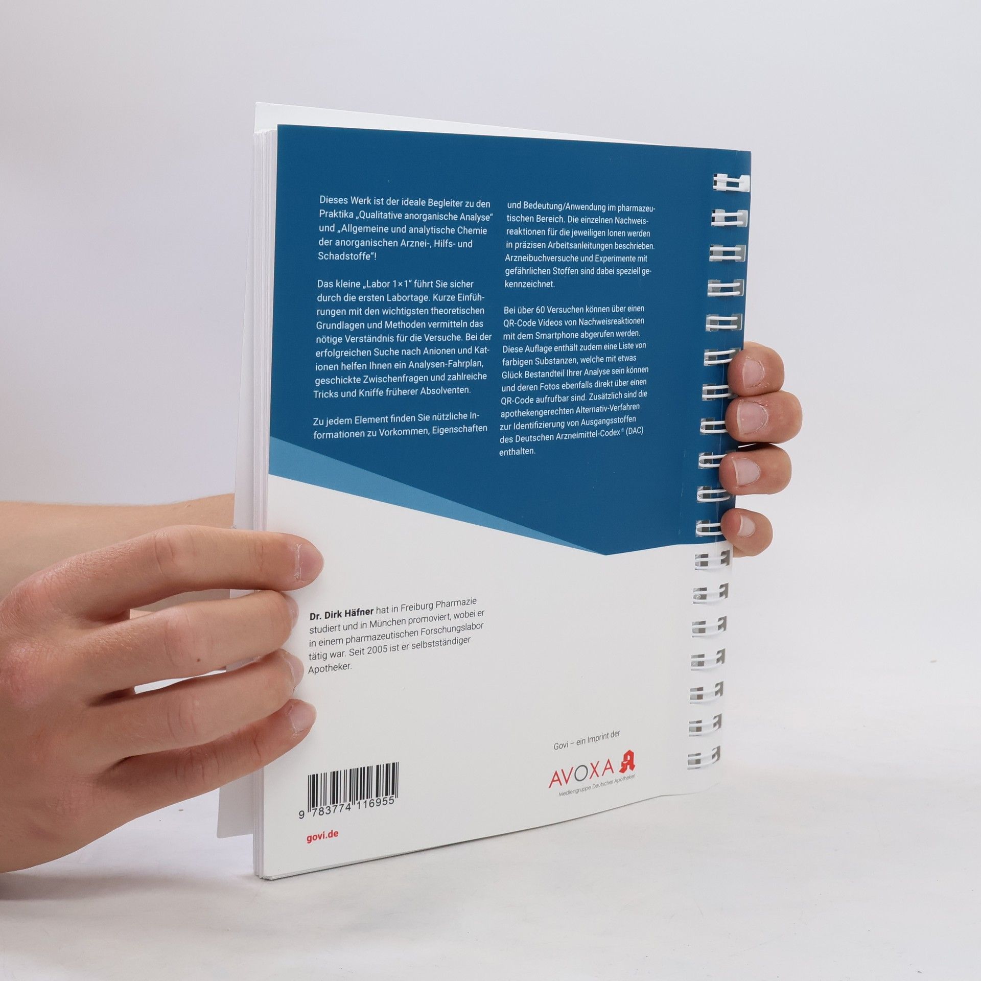 Dieses Werk ist der ideale Begleiter zu den Praktika „Qualitative anorganische Analyse“ und „Allgemeine und analytische Chemie der anorganischen Arznei-, Hilfs- und Schadstoffe“. Das kleine „Labor 1 × 1“ führt Sie sicher durch die ersten Labortage. Kurze Einführungen mit den wichtigsten theoretischen Grundlagen und Methoden vermitteln das nötige Verständnis für die Versuche. Bei der Suche nach Anionen und Kationen helfen ein Analysen-Fahrplan, geschickte Zwischenfragen und zahlreiche Tricks früherer Absolventen. Zu jedem Element finden Sie nützliche Informationen zu Vorkommen, Eigenschaften und Bedeutung im pharmazeutischen Bereich. Die Nachweisreaktionen für die jeweiligen Ionen werden in präzisen Arbeitsanleitungen beschrieben. Arzneibuchversuche und Experimente mit gefährlichen Stoffen sind speziell gekennzeichnet. Bei über 60 Versuchen können über einen QR-Code Videos von Nachweisreaktionen abgerufen werden. Diese Auflage enthält zudem eine Liste von farbigen Substanzen, die Bestandteil Ihrer Analyse sein können, sowie deren Fotos, ebenfalls über QR-Code zugänglich. Zusätzlich sind apothekengerechte Alternativ-Verfahren zur Identifizierung von Ausgangsstoffen des Deutschen Arzneimittel-Codex ® enthalten. Dr. Dirk Häfner hat Pharmazie studiert und in einem pharmazeutischen Forschungslabor gearbeitet. Seit 2005 ist er selbstständiger Apotheker.