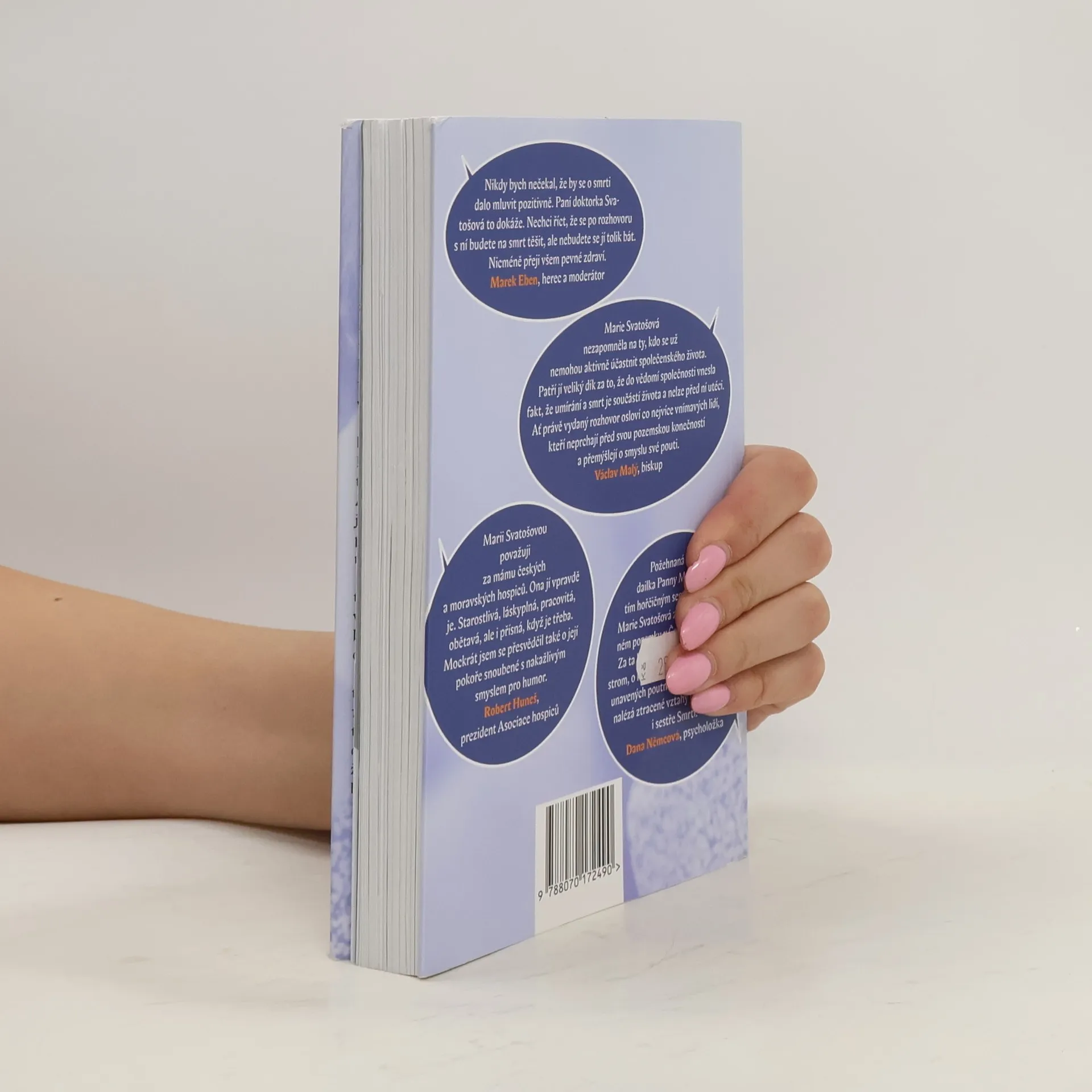 Marie Svatošová v rozhovoru s Alešem Palánem. Co se stane, pokud pacientovi o jeho zdravotním stavu dlouhodobě lžeme? Má vážná choroba nějaký smysl? A proč umírající nezabíjet, jak si přejí zastánci eutanázie, ale naopak respektovat jejich život až do přirozeného konce a být jim nablízku? Nejen o těchto věcech hovoří v knize rozhovorů Neboj se vrátit domů zakladatelka hospicového hnutí v ČR Marie Svatošová. Rozhovor s ní vede spisovatel a novinář Aleš Palán. Právě Svatošová před lety přišla s myšlenkami hospicové paliativní péče. Byla to ona, kdo v Červeném Kostelci iniciovala první český hospic. A je to stále ona, kdo neúnavně jezdí po republice s hospicovými přednáškami a je rádkyní hospicům nově vznikajícím. Marie Svatošová v knize mluví také o své rodině, studiu medicíny, vlivu, jaký na ni měl P. Ladislav Kubíček či o svém trapistickém fan clubu. V mnoha hospicích najdeme citát: „Našim cílem je naplnit dny životem, nikoliv život dny.“ Autorka tohoto výroku Marie Svatošová dokázala životem naplnit celý svůj život. A nejen životem, také smyslem a neokázalou službou. „Nikdy bych nečekal, že by se o smrti dalo mluvit pozitivně. Paní doktorka Svatošová to dokáže. Nechci říct, že se po rozhovoru s ní budete na smrt těšit, ale nebudete se jí tolik bát,“ říká k obsahu knihy herec a moderátor Marek Eben. „Nicméně přeji všem pevné zdraví,“ dodává.
