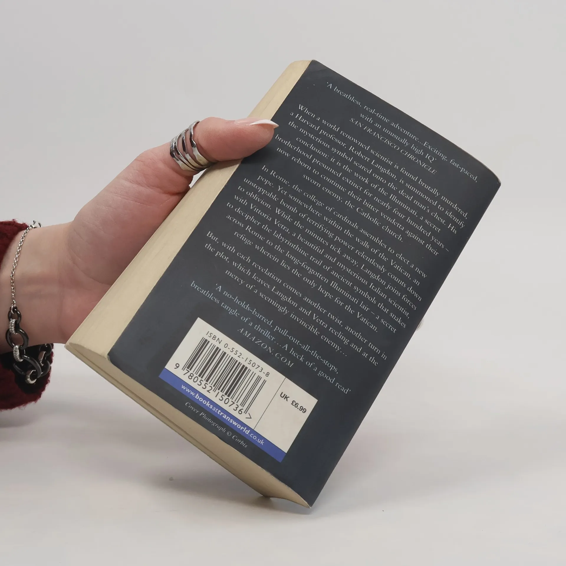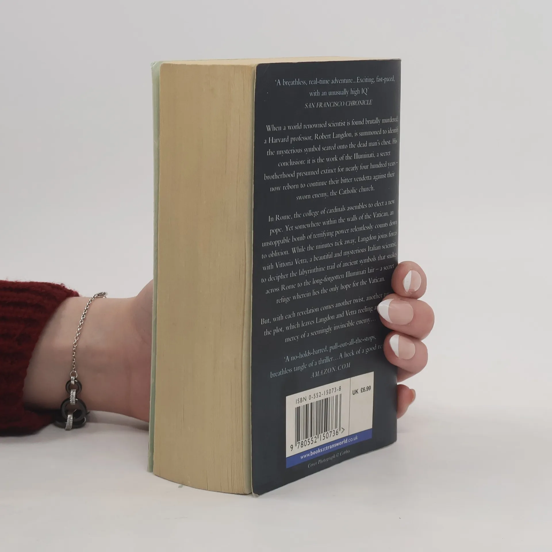 When a world renowned scientist is found brutally murdered in a Swiss research facility, a Harvard professor, Robert Langdon, is summoned to identify the mysterious symbol seared onto the dead man's chest. His baffling conclusion: it is the work of the Illuminati, a secret brotherhood presumed extinct for nearly four hundred years - reborn to continue their bitter vendetta against their sworn enemy, the Catholic church. In Rome, the college of cardinals assembles to elect a new pope. Yet somewhere within the walls of the Vatican, an unstoppable bomb of terrifying power relentlessly counts down to oblivion. While the minutes tick away, Langdon joins forces with Vittoria Vetra, a beautiful and mysterious Italian scientist, to decipher the labyrinthine trail of ancient symbols that snakes across Rome to the long-forgotten Illuminati lair - a secret refuge wherein lies the only hope for the Vatican. But with each revelation comes another twist, another turn in the plot, which leaves Langdon and Vetra reeling and at the mercy of a seemingly invisible enemy... --back cover